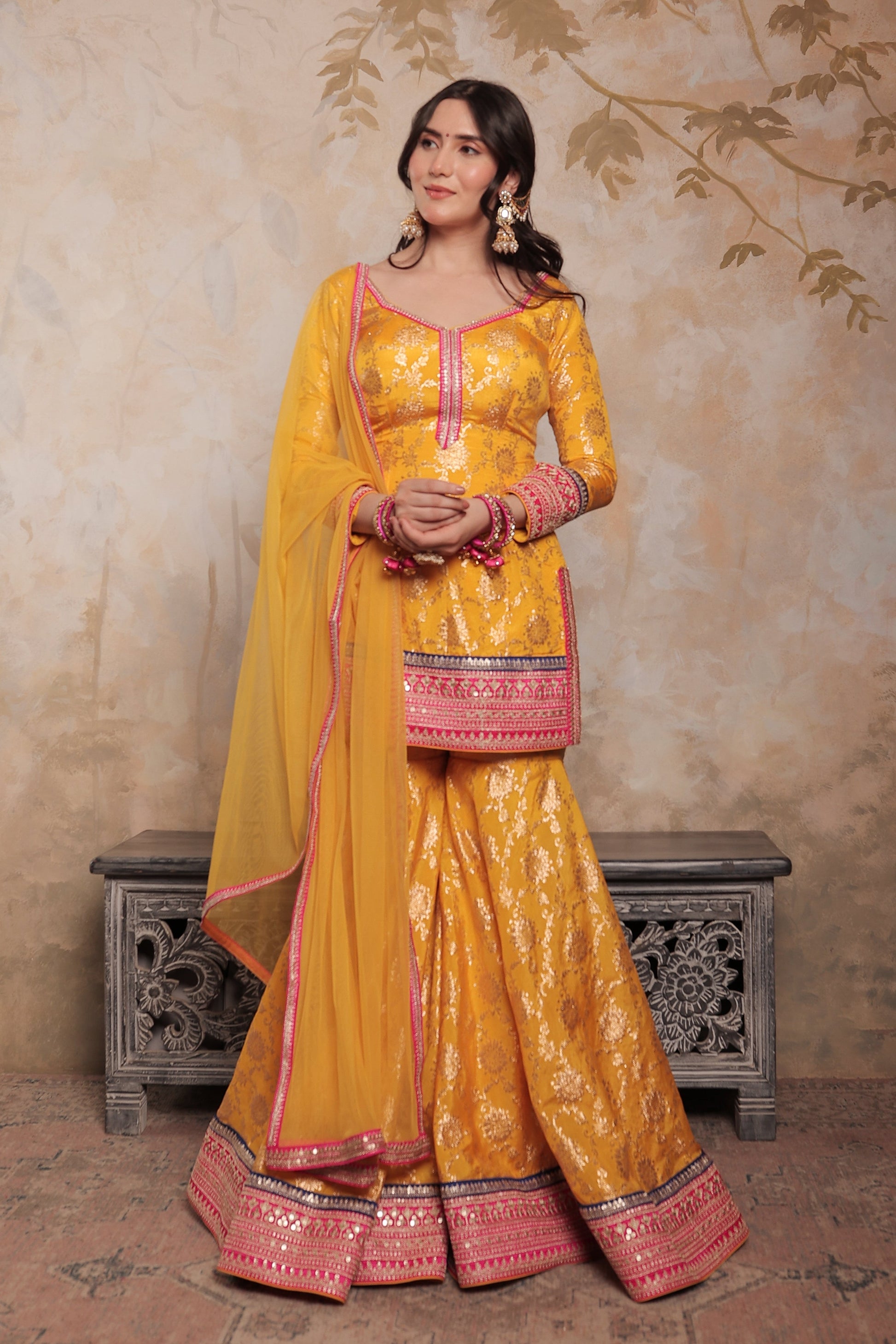 - Material : Suit and Sharara - Silk , Dupatta - Chanderi