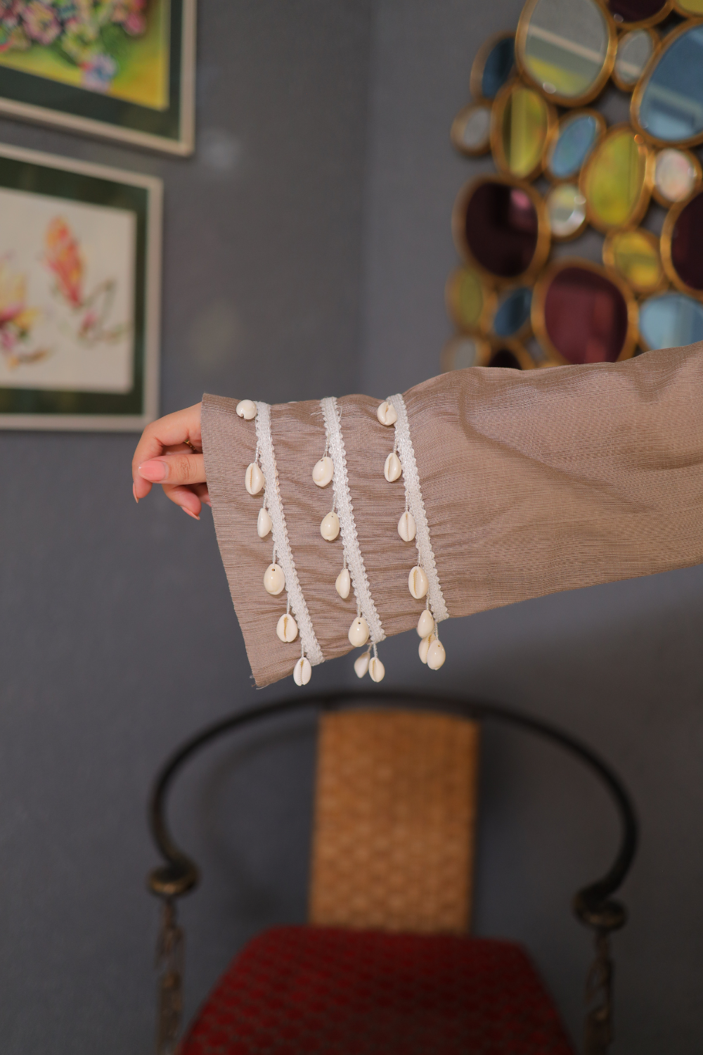 The highlight? Delicate shell detailing that accents the sleeves or neckline, adding a subtle handcrafted element to the otherwise modern silhouette. The muted grey tone makes it a versatile wardrobe staple — easy to style, easy to love.