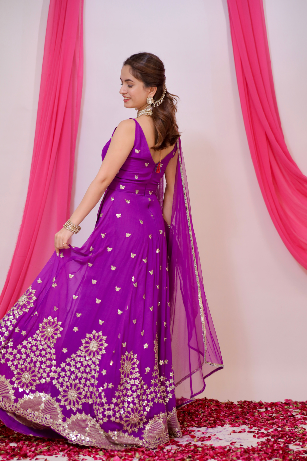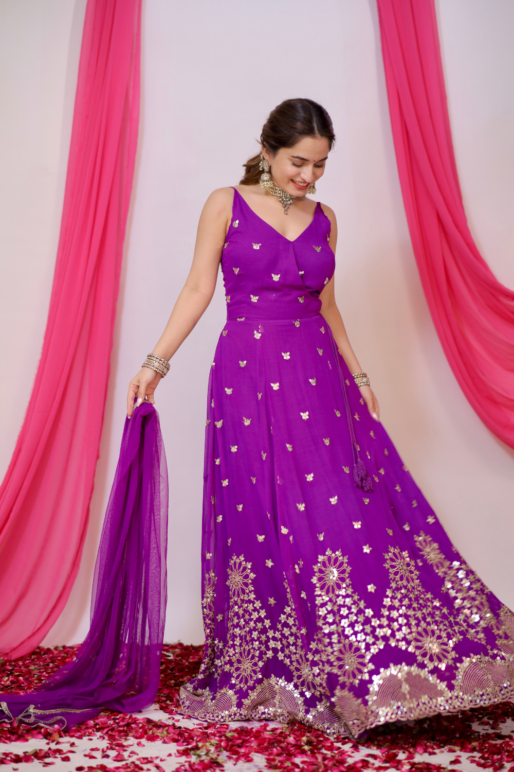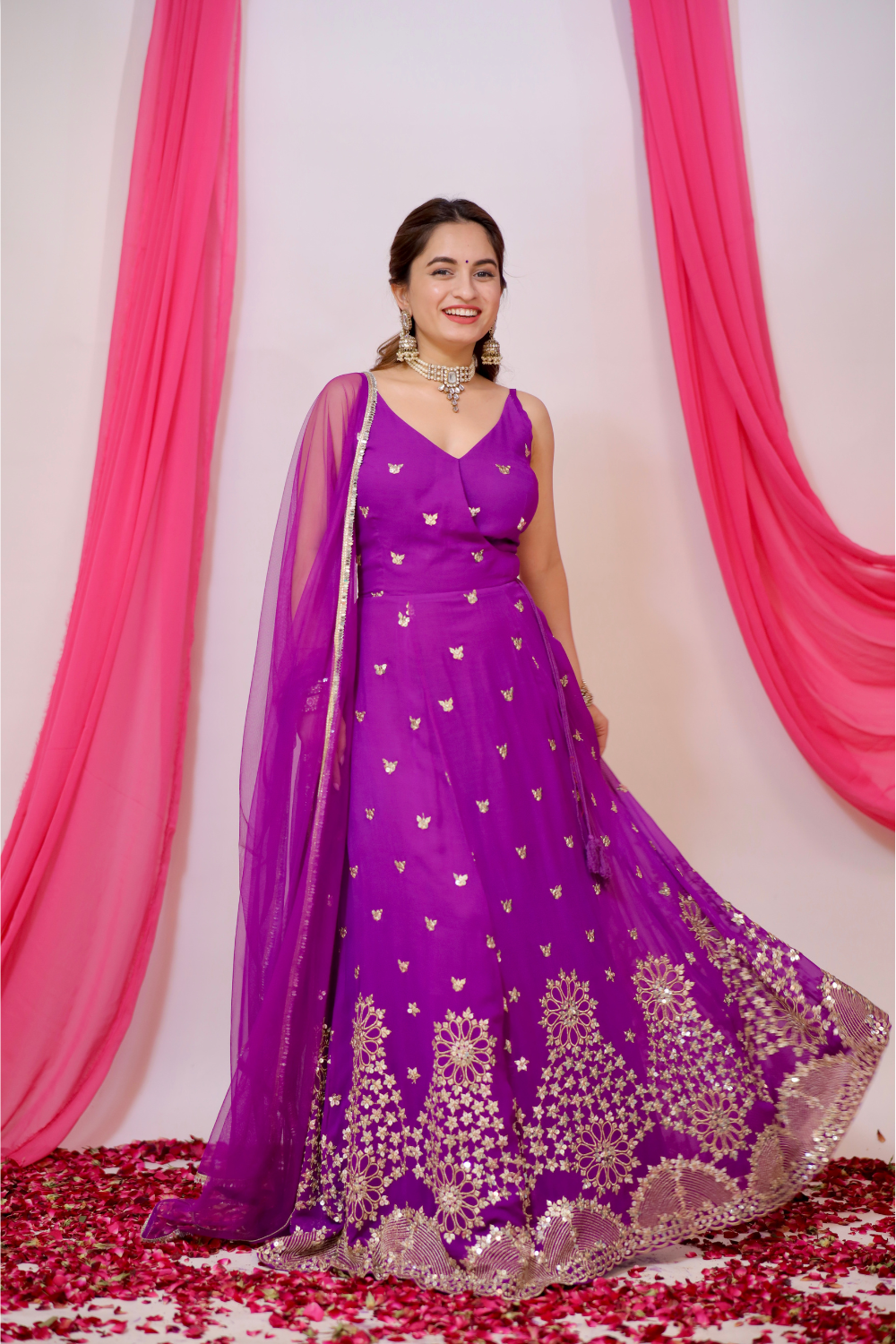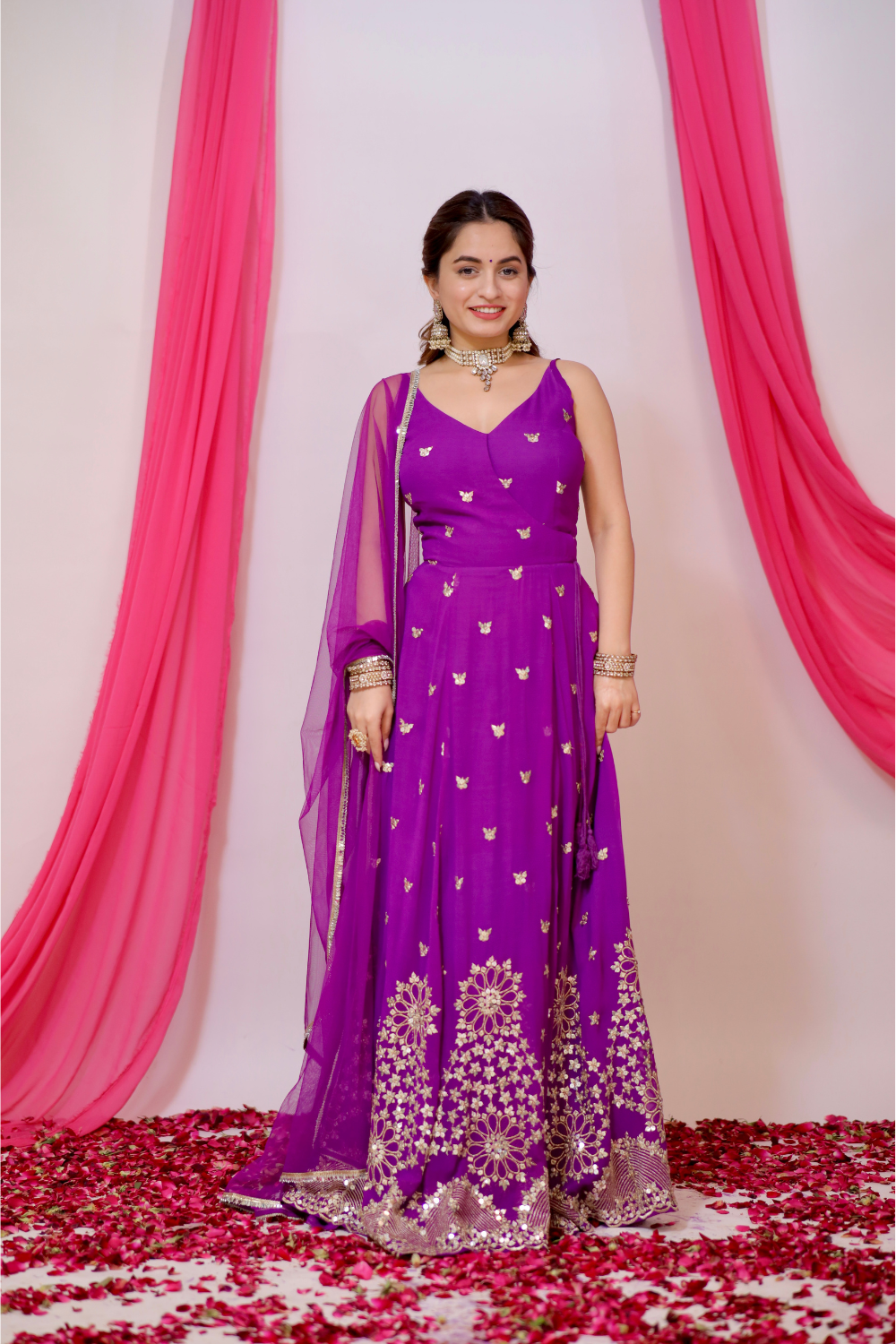 Aza violet Anarkali in the traditional angrakha style exudes regal charm and grace. Designed in a floor-length silhouette, it flows beautifully with every movement, offering a sophisticated and elegant appearance. The unique angrakha style adds a contemporary twist to the classic design, with asymmetrical closures and an intricate drape that enhances its beauty. The gown features delicate sequins work at the hem, adding a touch of sparkle and glamour, while the sequins scattered lightly all over the outfit give it a subtle, radiant shimmer.