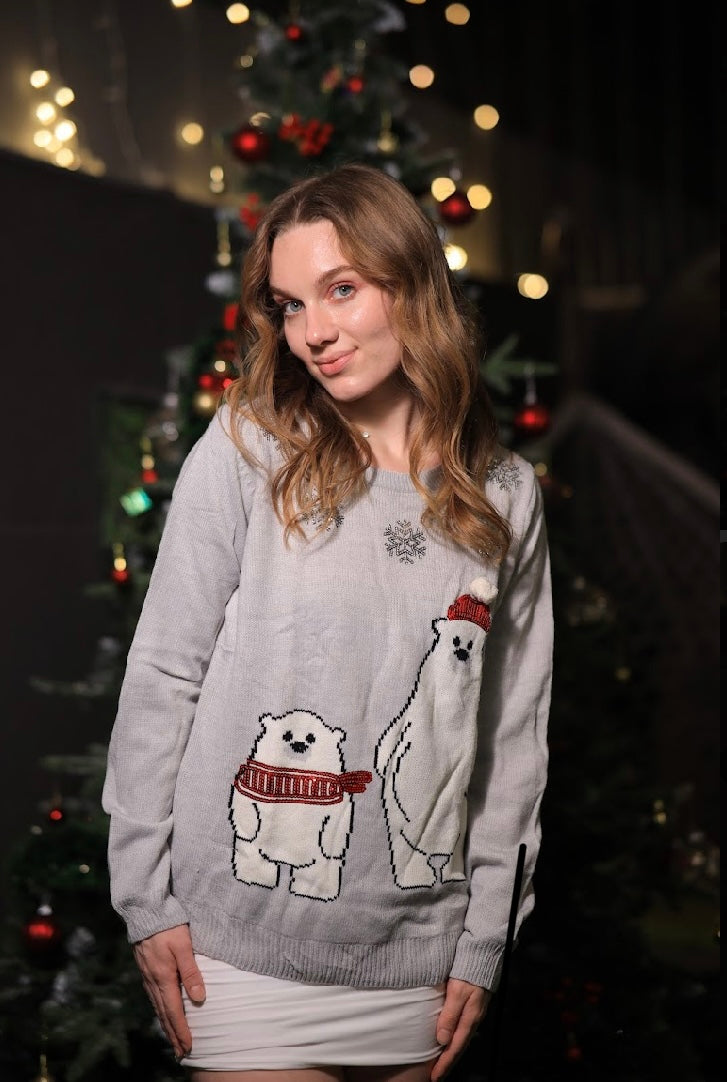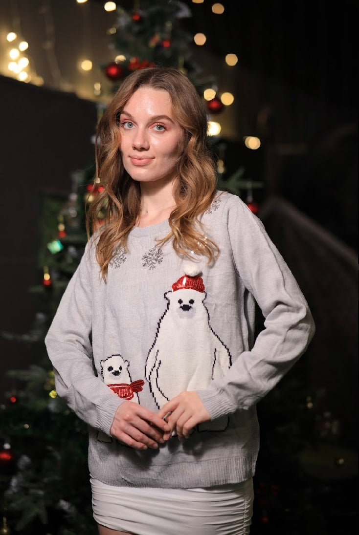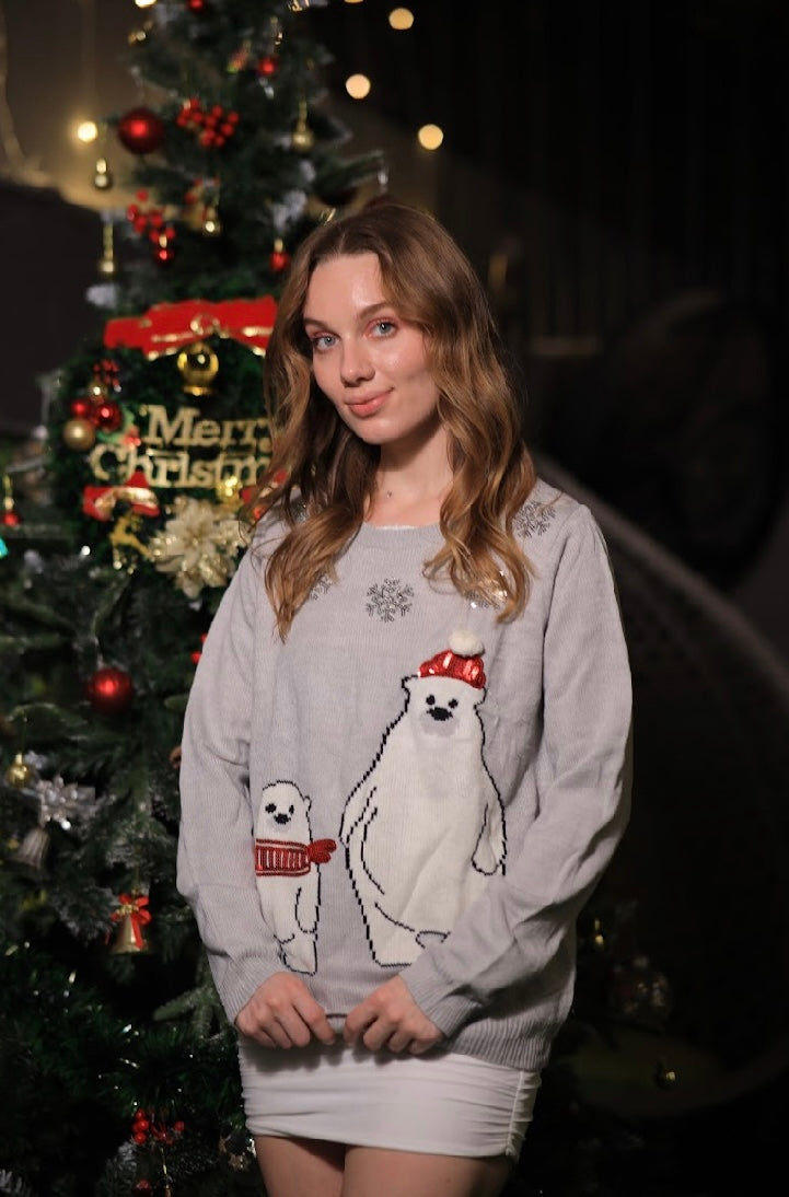 This fun ugly Christmas sweater features a cheerful baby and mamma snow bear with a scarf and top hat, perfect for spreading holiday cheer. Its bold, festive design makes it ideal for ugly sweater parties or cozy Christmas gatherings.