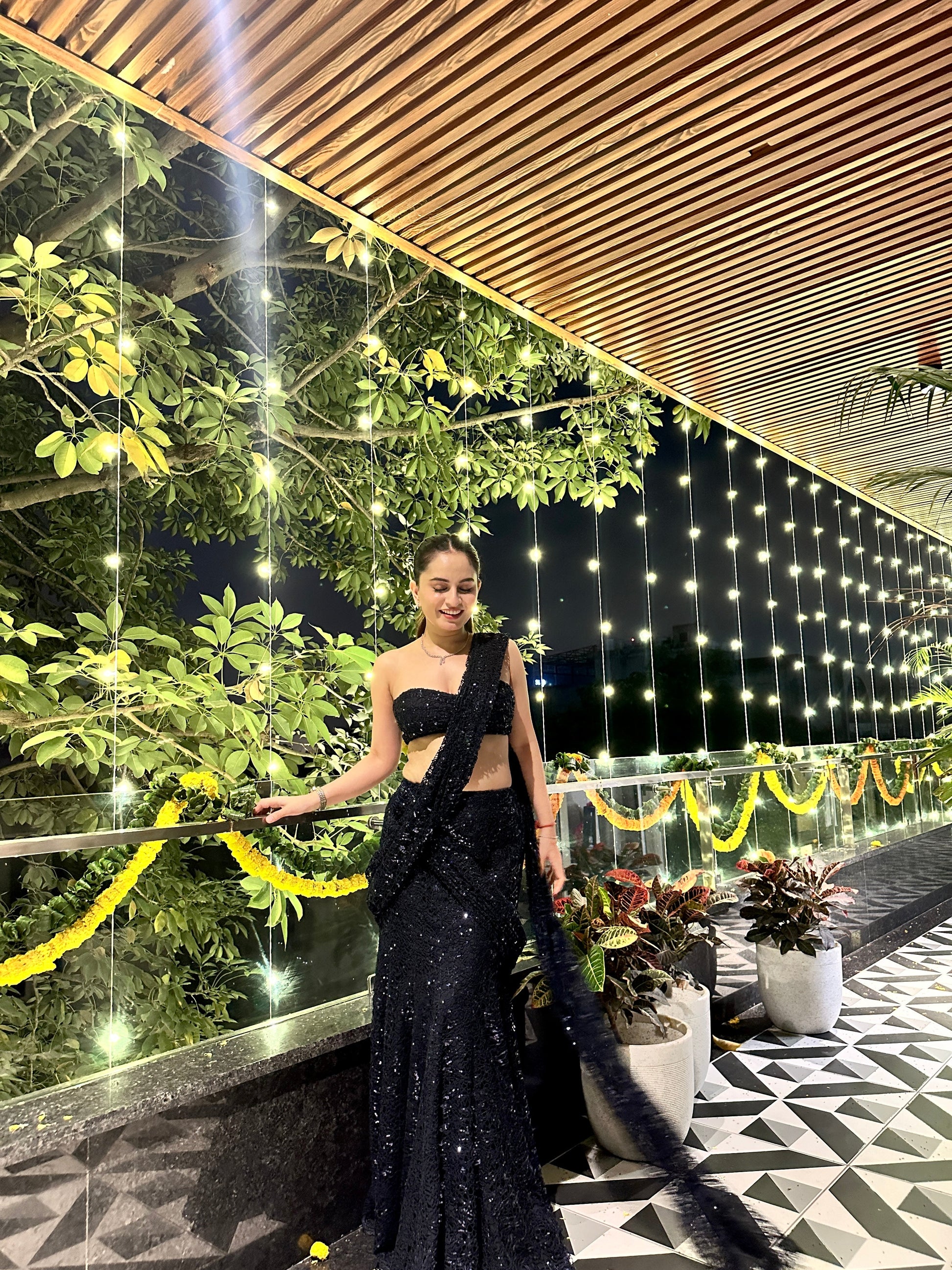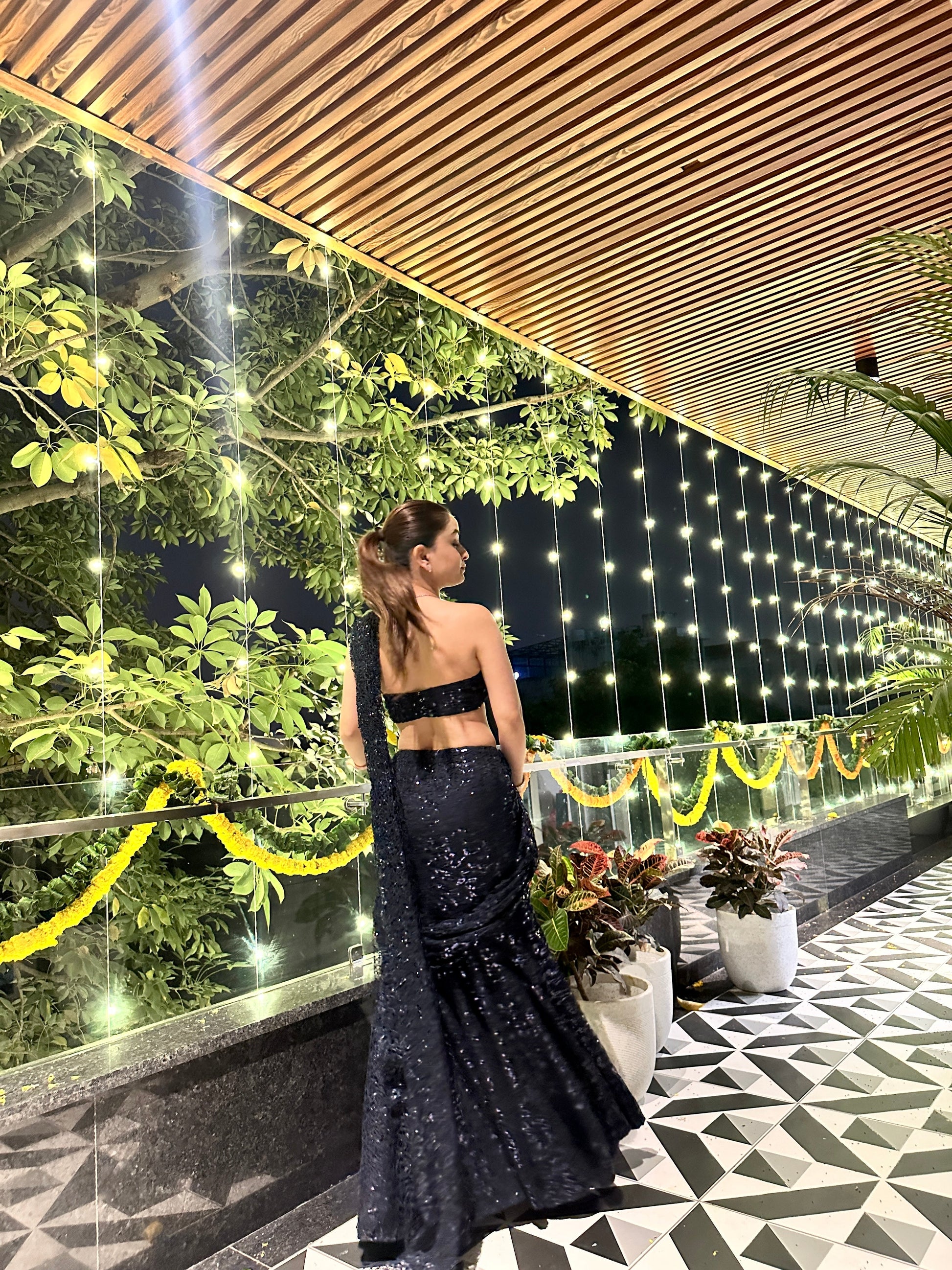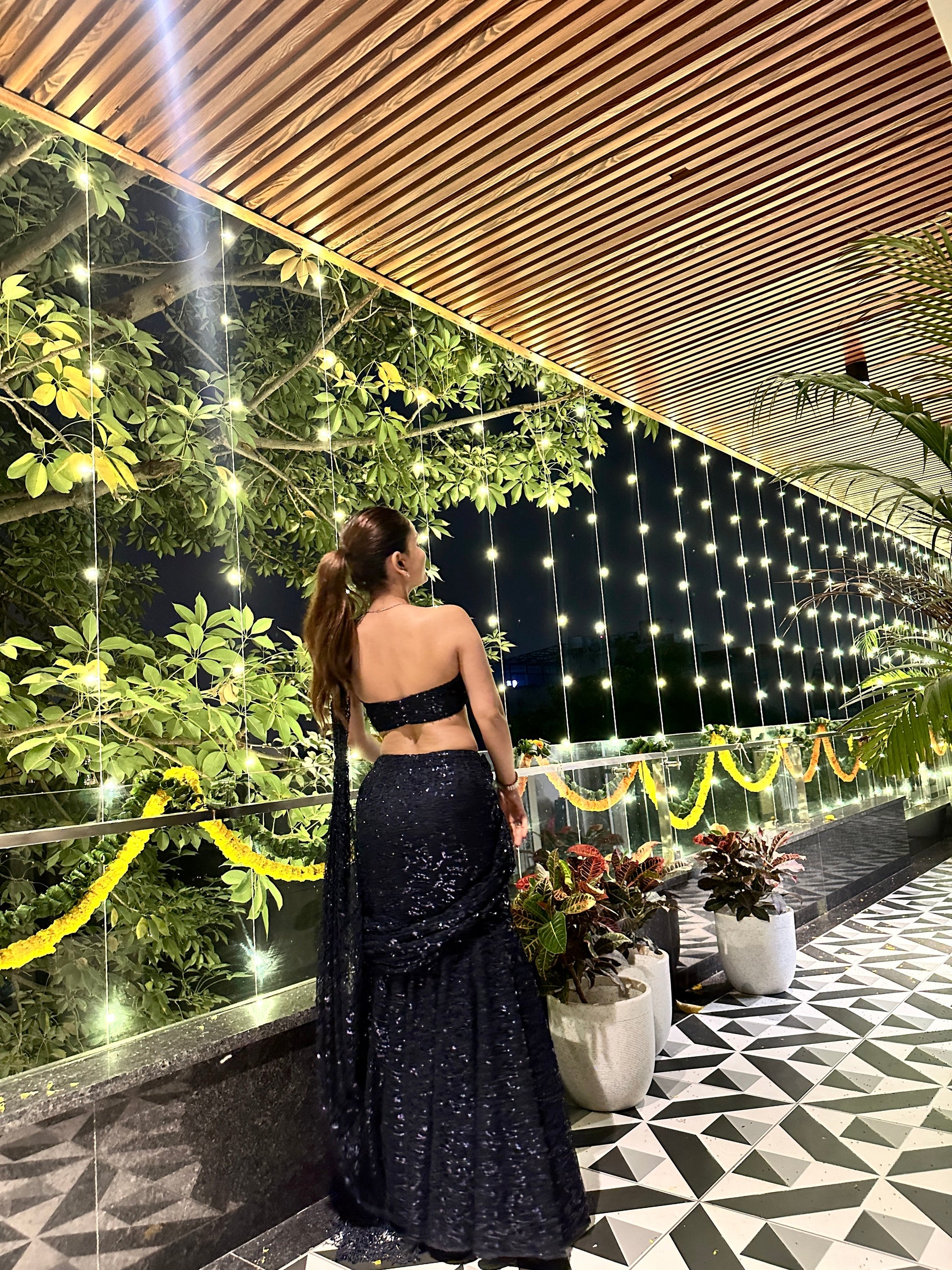 BEBO stunning draped saree features a sleek, figure-flattering design in a luxurious Lycra blend fabric, adorned with shimmering sequins for a touch of glamour. The saree is paired with a sexy tube blouse that offers a modern twist on traditional elegance, perfectly complementing the silhouette. The ensemble is completed with a chic fishtail skirt that gracefully flares at the hem, enhancing the curves and creating a striking silhouette. A delicate, flowing dupatta in the same sequined Lycra fabric adds an ethereal touch, draping beautifully over the shoulder to create an unforgettable look. Perfect for a special evening, this outfit exudes confidence, elegance, and sensuality.
