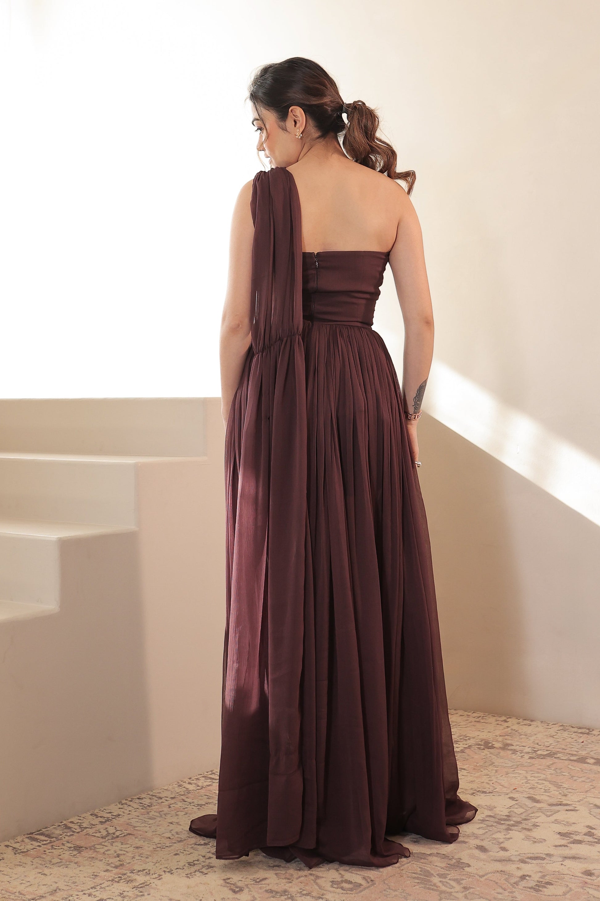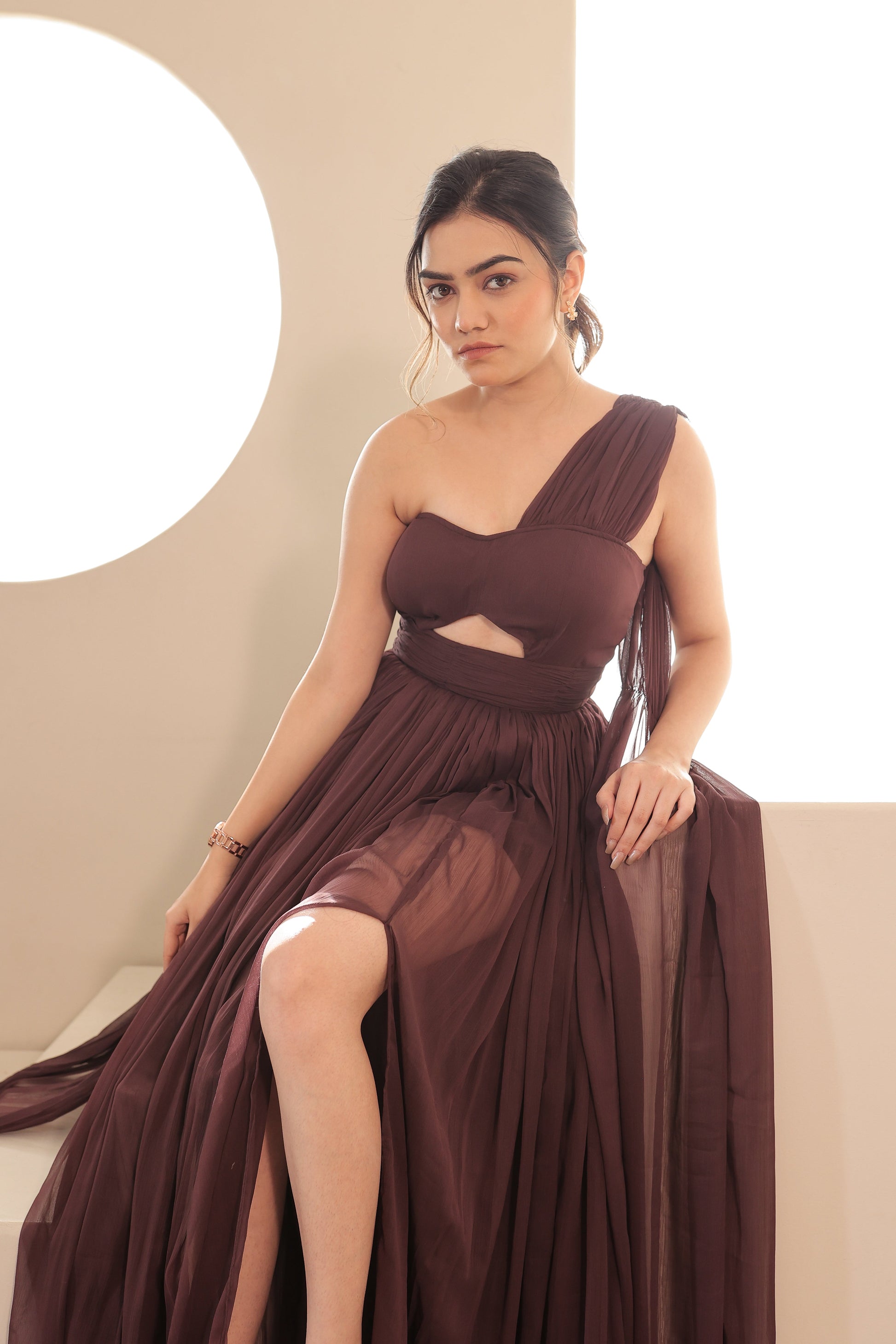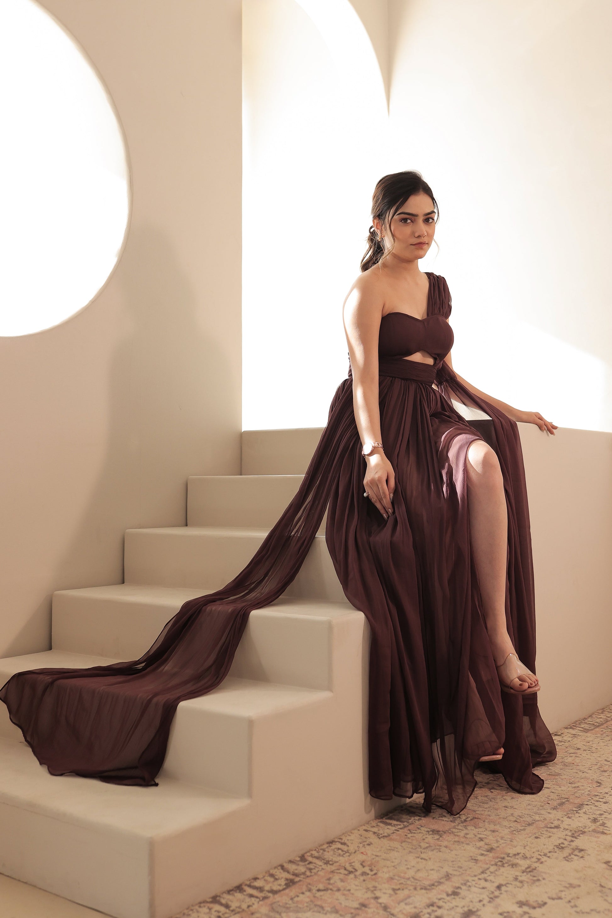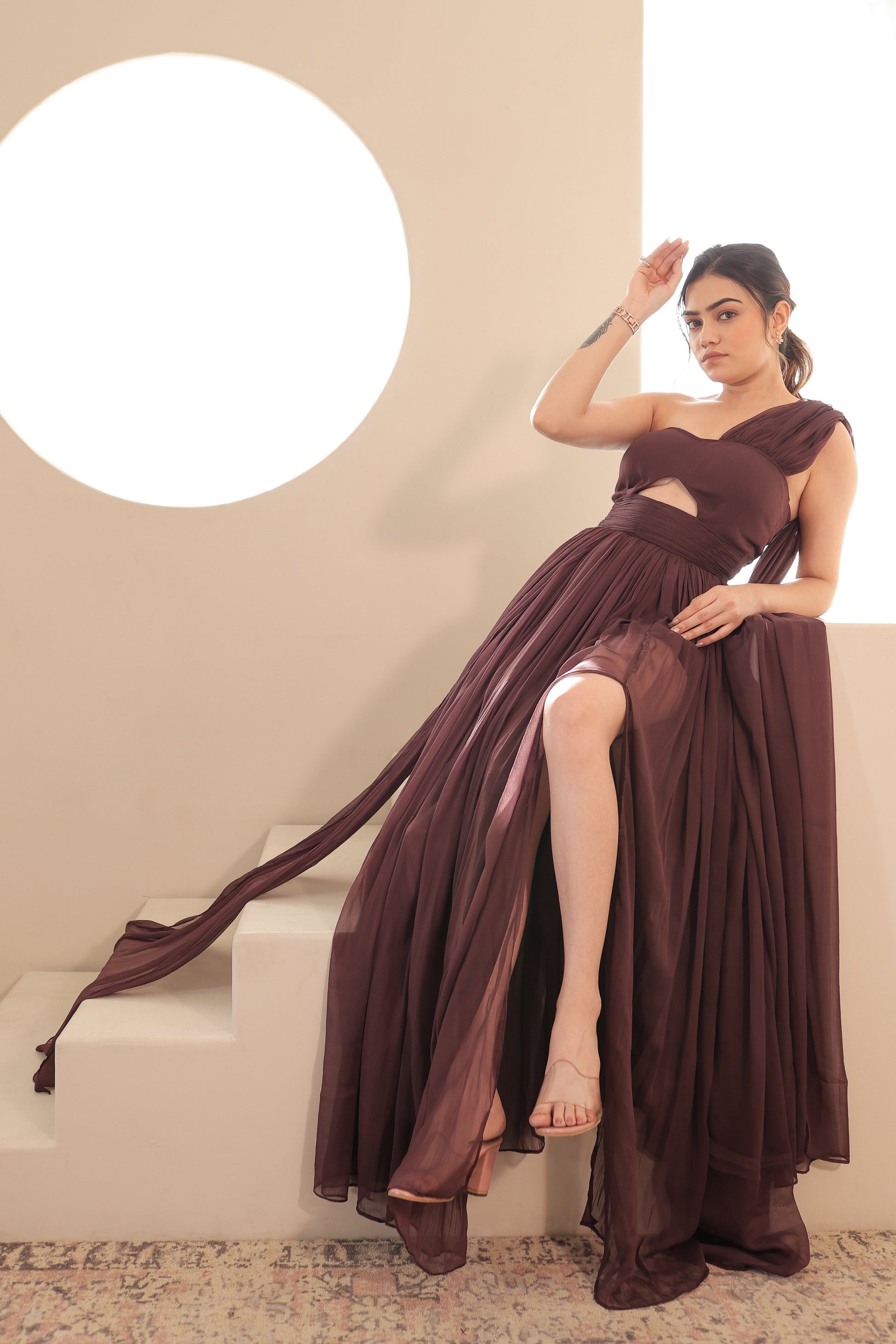 Sultry Brown Draped Gown – Perfect for Birthdays & Luxurious Vacations