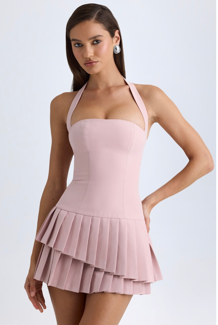 Crafted to precision. Designed to define and flatter your natural curves, the Rosaria mini dress is crafted from lightweight stretch-woven fabric to a classic halterneck silhouette with a figure-hugging drop-waist bodice. It’s complete with a layered pleated skirt for stunning movement with every step.