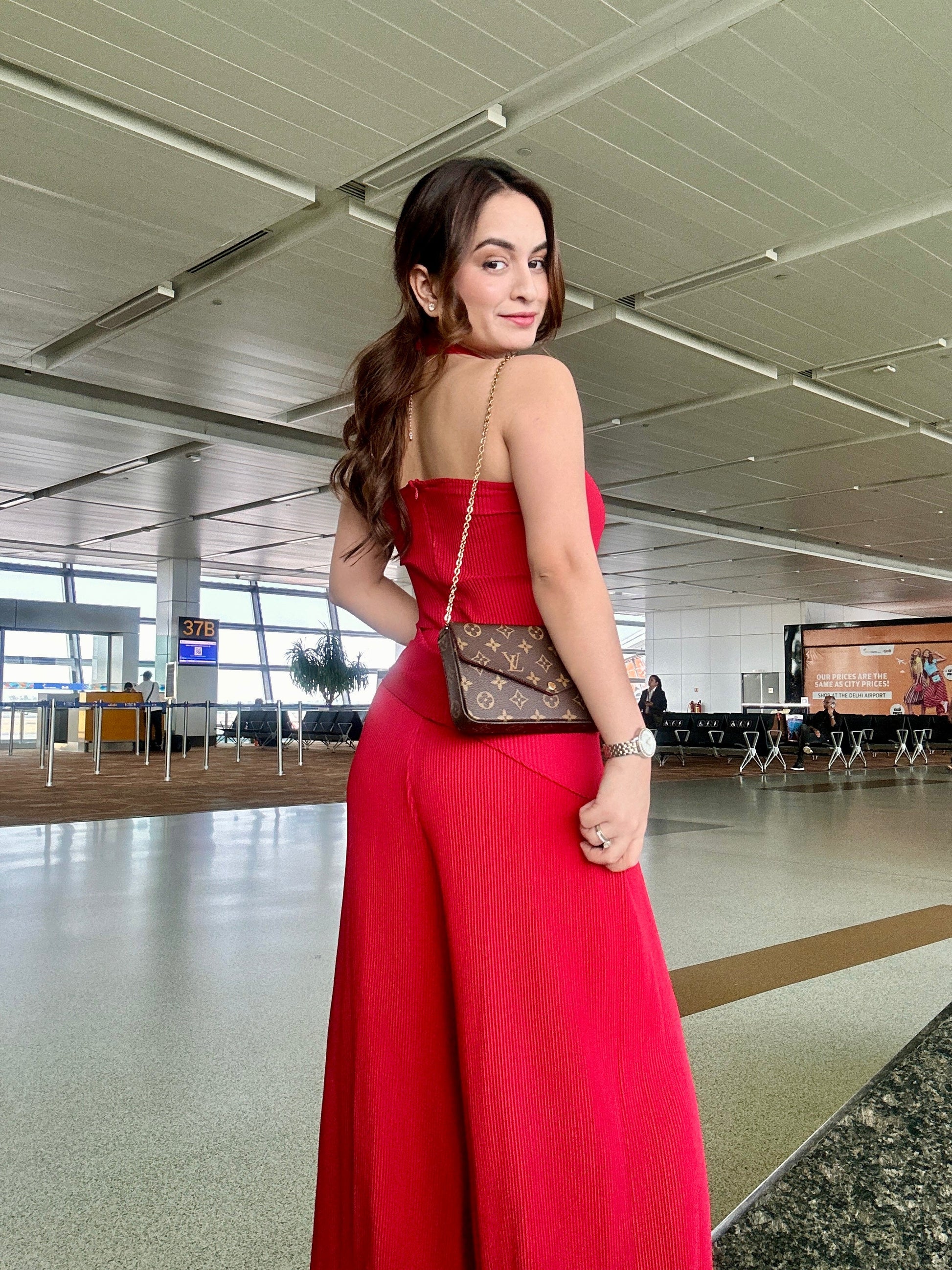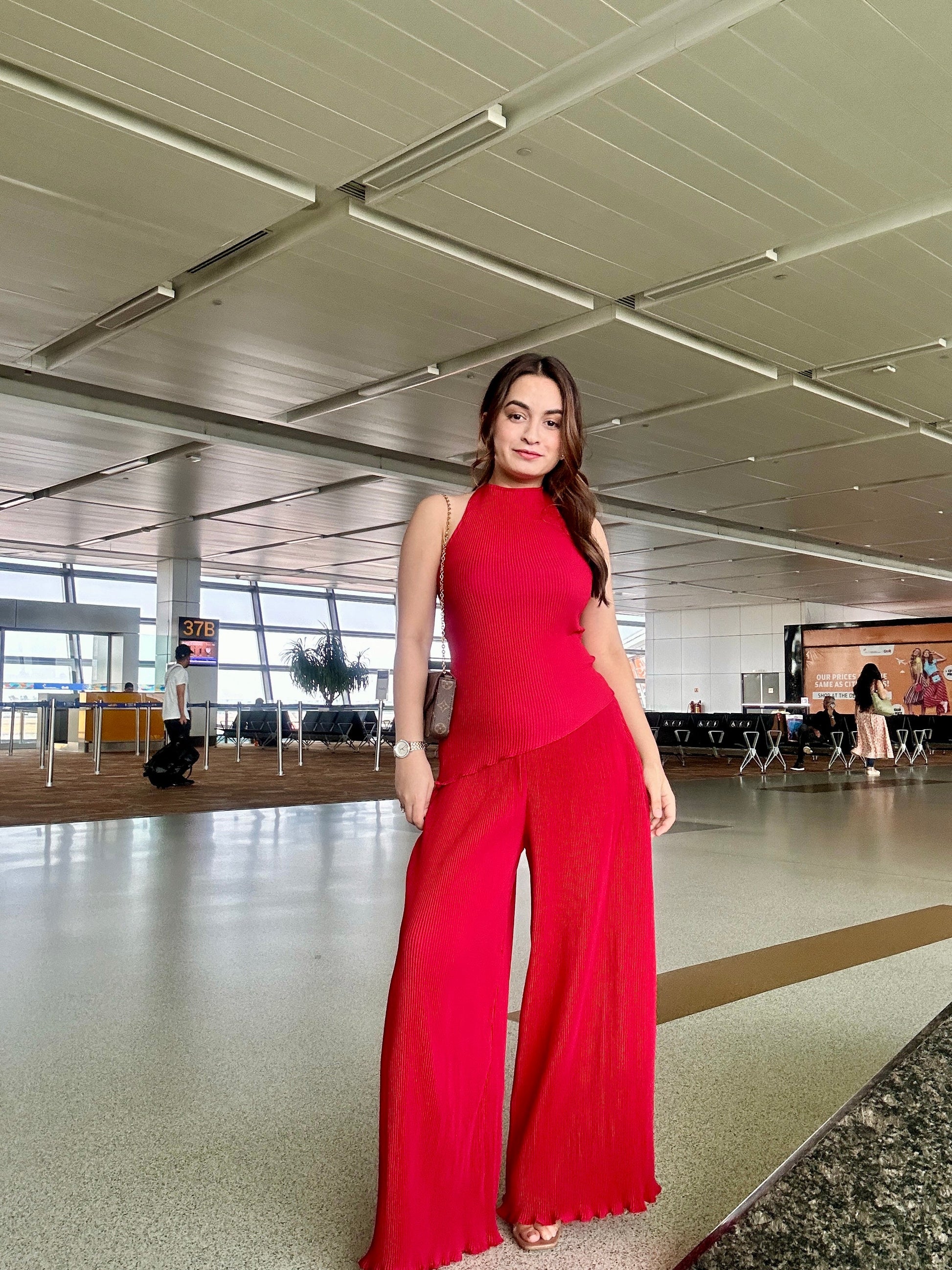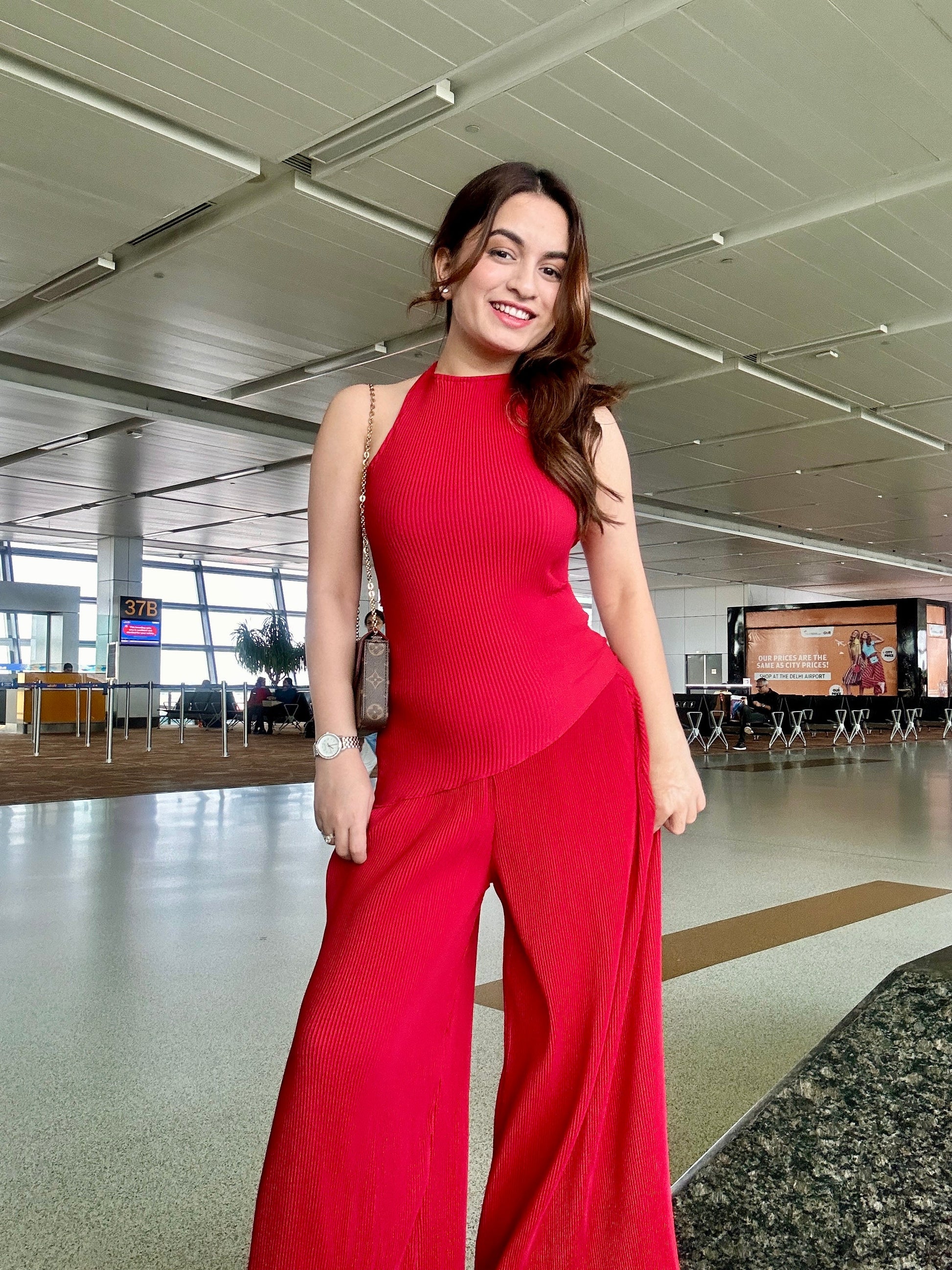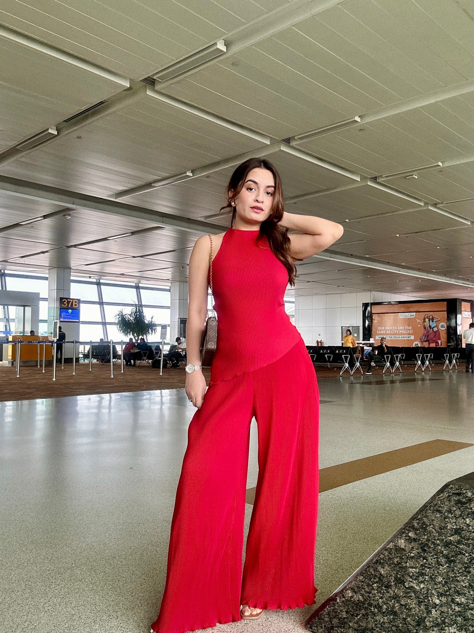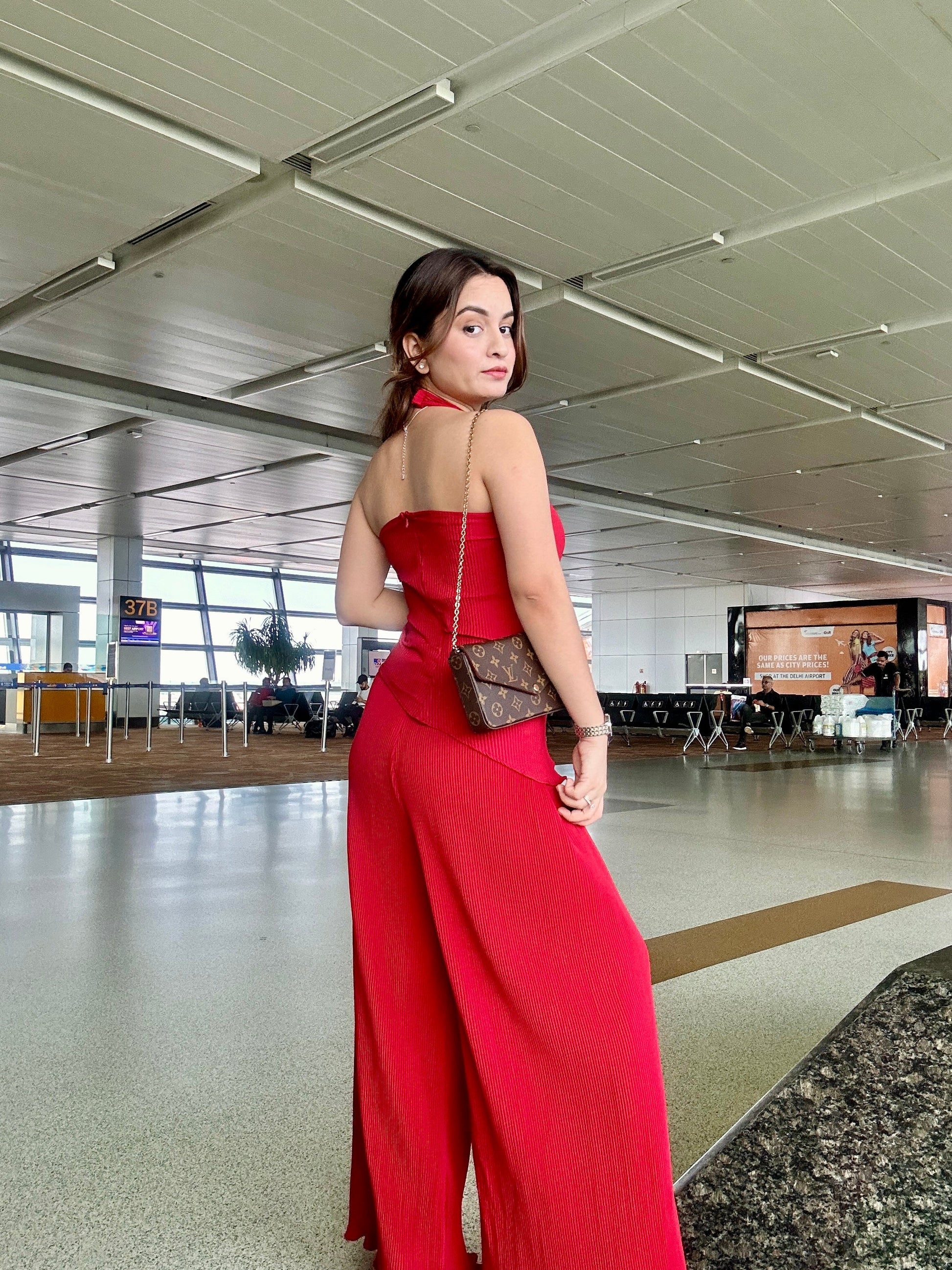 "Embrace effortless chic in this cherry red co-ord set! Featuring a halter neck design and crafted from crinkled fabric, it's as comfortable as it is stylish. 🍒💃 #FashionForward #ComfortDefined #CherryRedStyle"