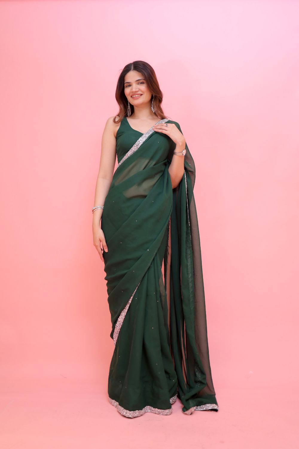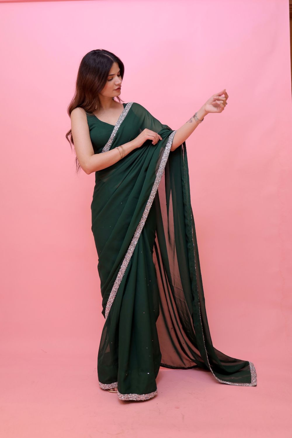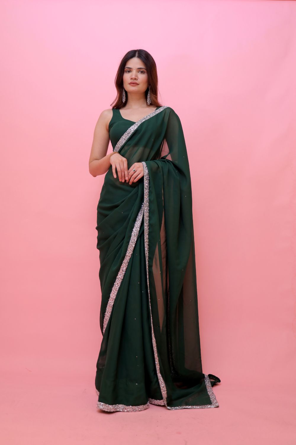 Unleash your inner diva in the Raveena Georgette saree! This stunning GREEN saree is made of lightweight georgette fabric, ensuring comfort and ease of movement. Includes a matching blouse for a complete look. Perfect for any occasion, this saree will have you turning heads wherever you go! Get ready to slay in style.