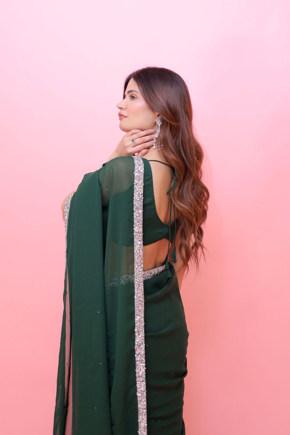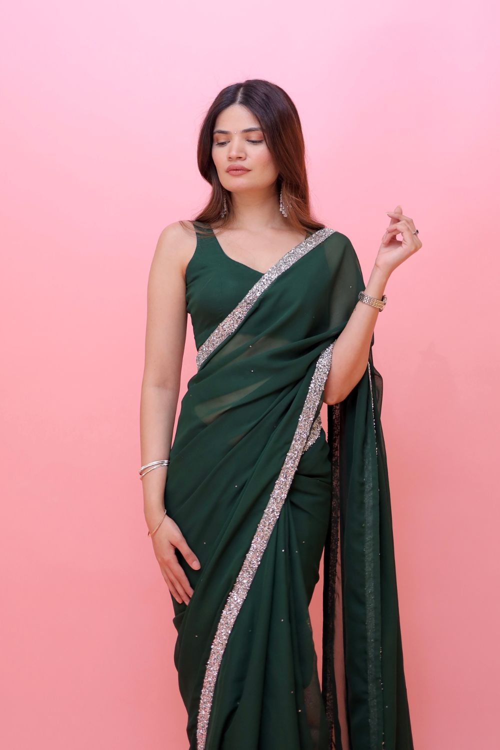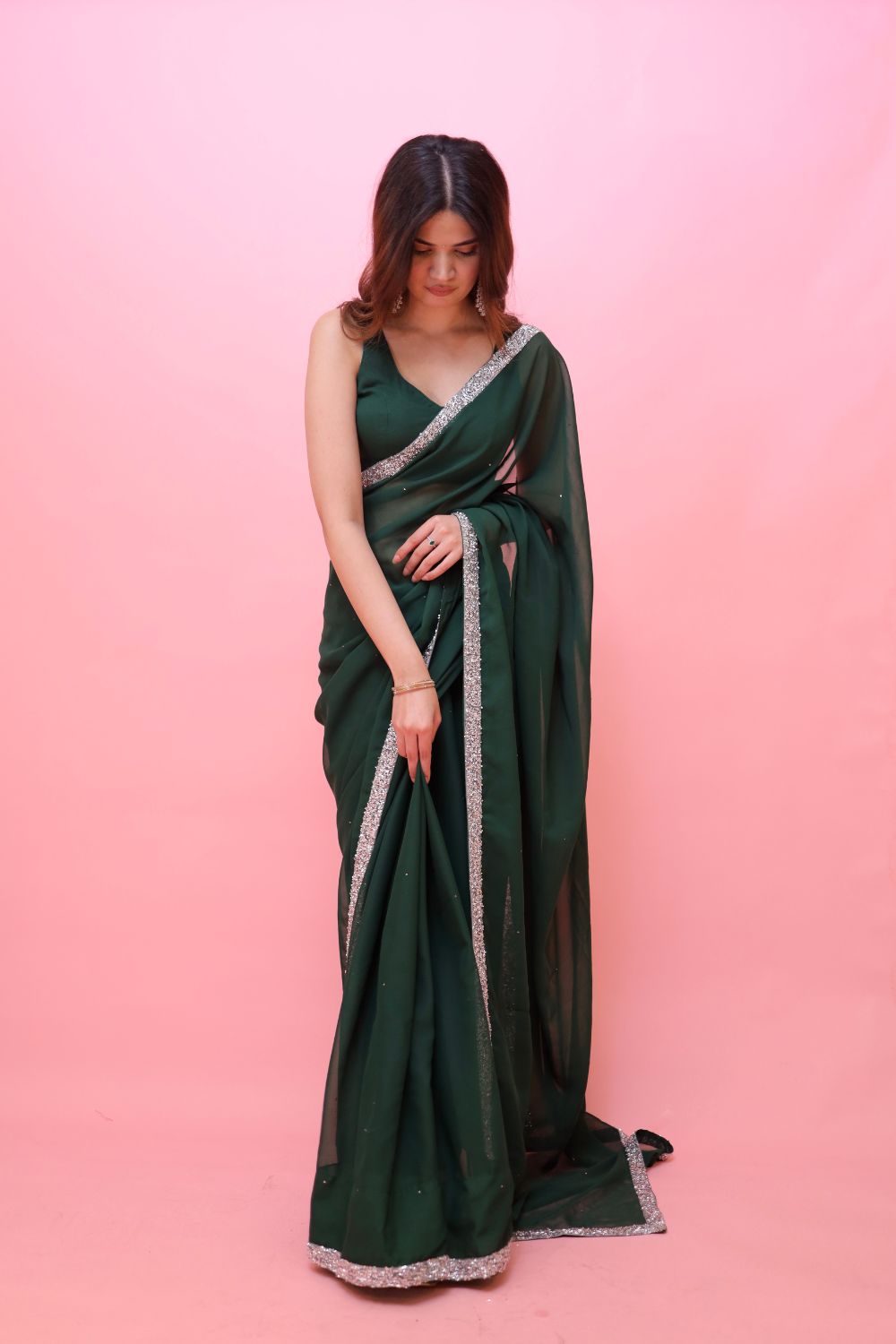 Unleash your inner diva in the Raveena Georgette saree! This stunning GREEN saree is made of lightweight georgette fabric, ensuring comfort and ease of movement. Includes a matching blouse for a complete look. Perfect for any occasion, this saree will have you turning heads wherever you go! Get ready to slay in style.