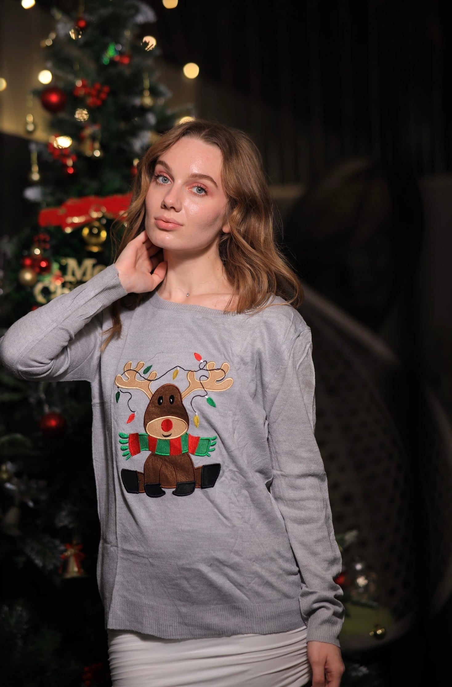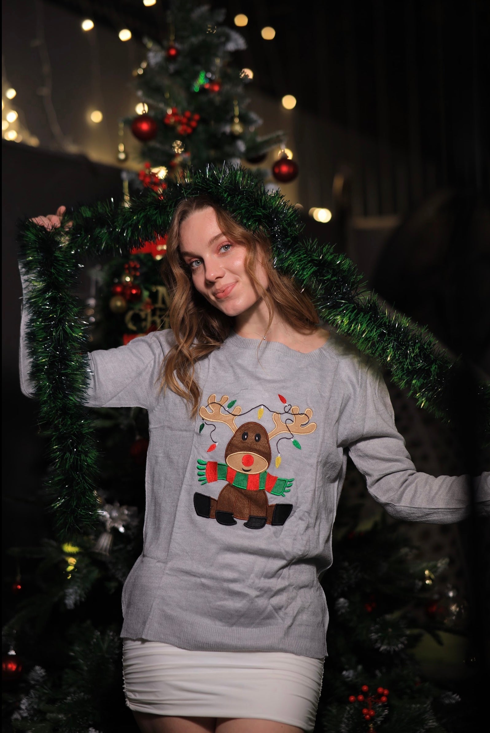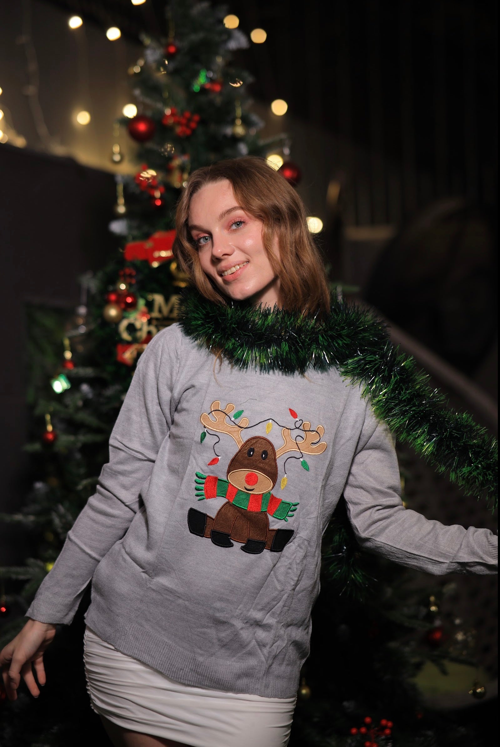 This fun ugly Christmas sweater features a cheerful dasher with a scarf and top hat, perfect for spreading holiday cheer. Its bold, festive design makes it ideal for ugly sweater parties or cozy Christmas gatherings.