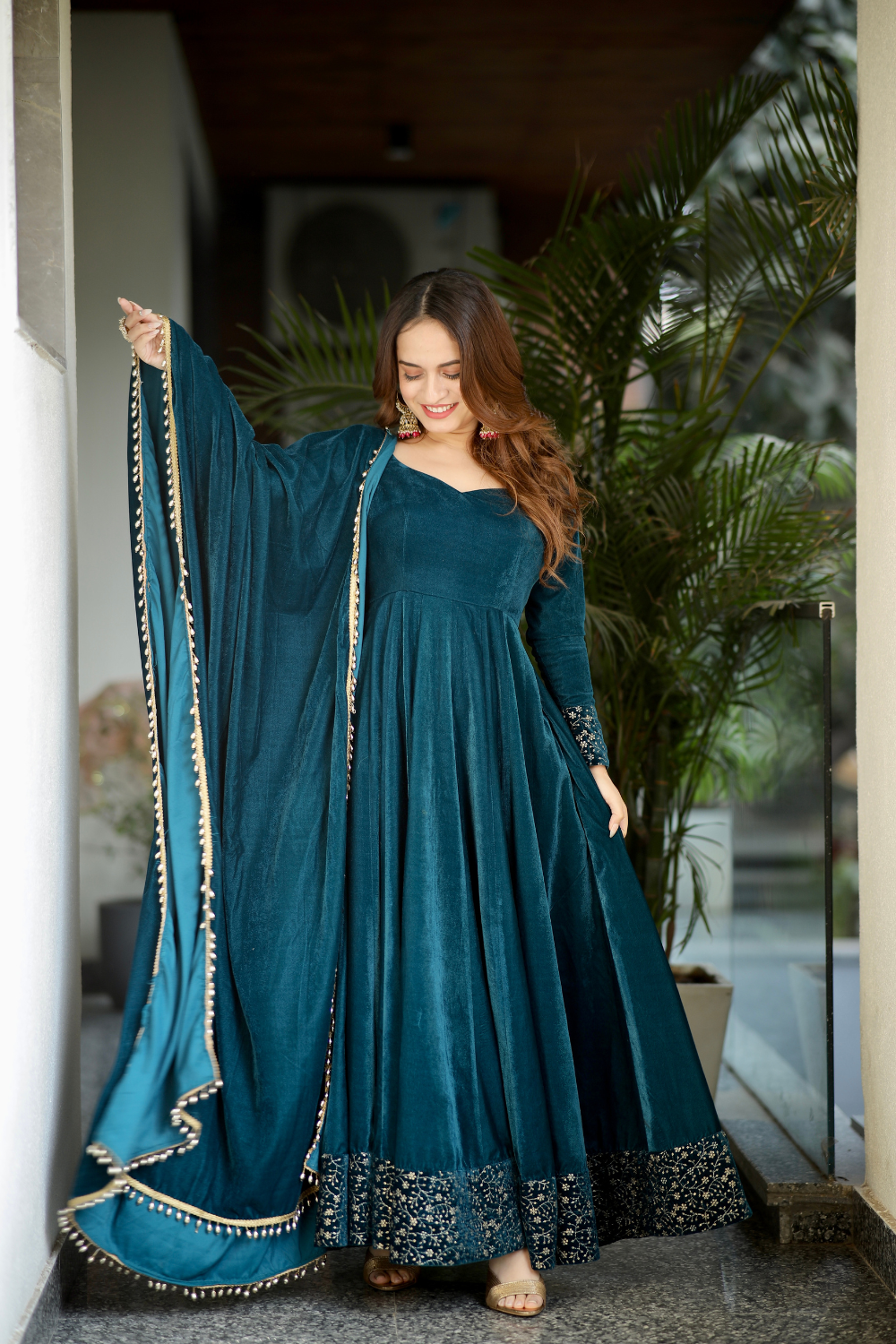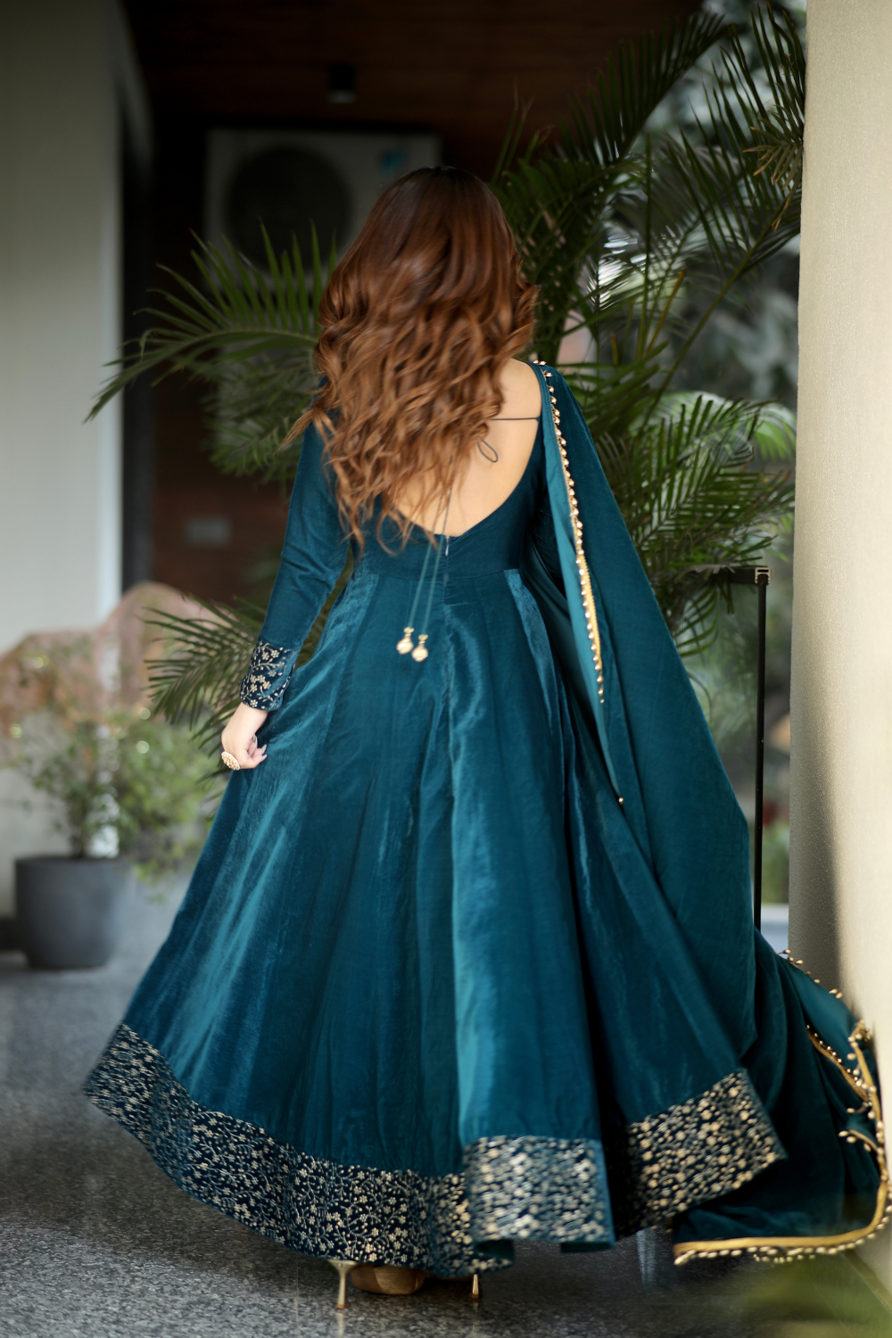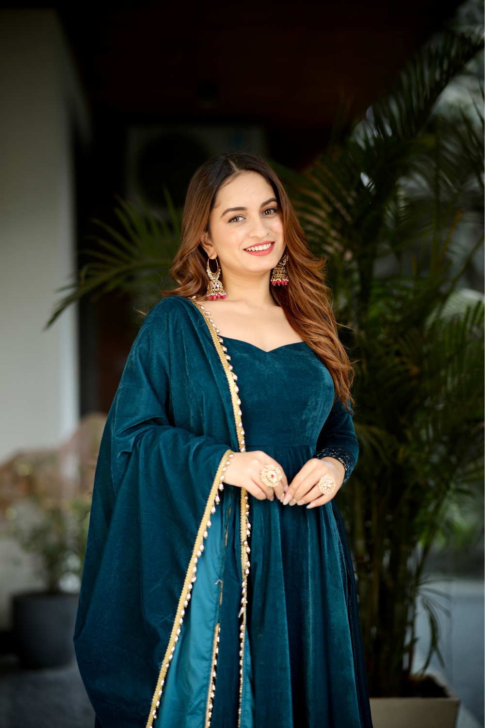 This exquisite sea green velvet Anarkali exudes elegance and charm. The rich, plush fabric offers both warmth and comfort, making it perfect for cooler evenings or special occasions. The unique sea green color, soft yet vibrant, is both refreshing and timeless. Intricate borders at the sleeves and hemline add a touch of sophistication, beautifully complementing the flowing silhouette of the Anarkali. Whether for a festive celebration or a stylish gathering, this piece ensures you feel graceful and comfortable while turning heads.