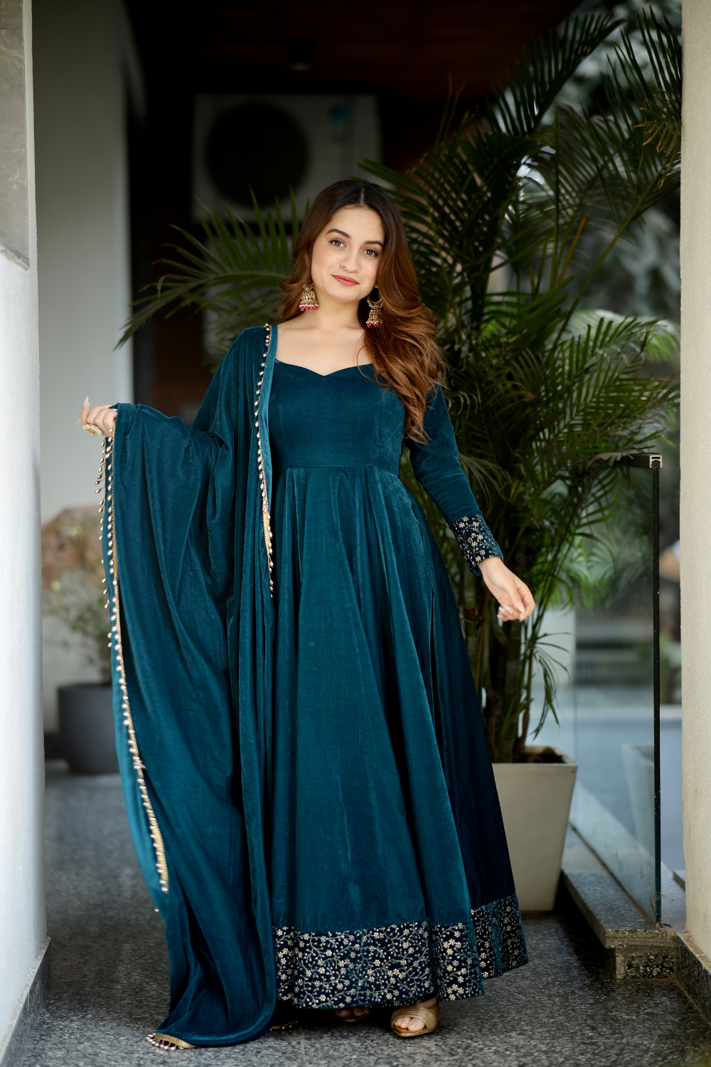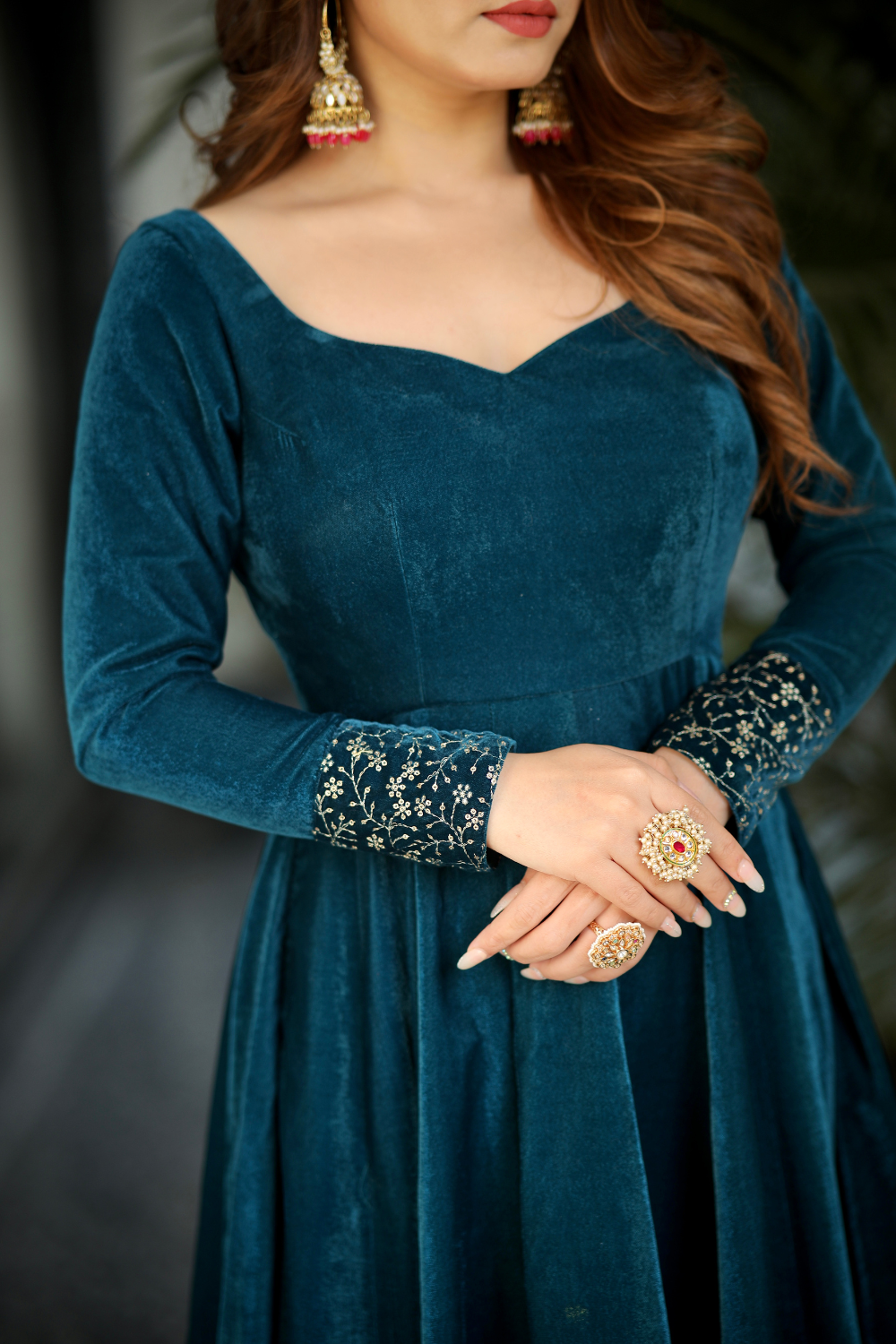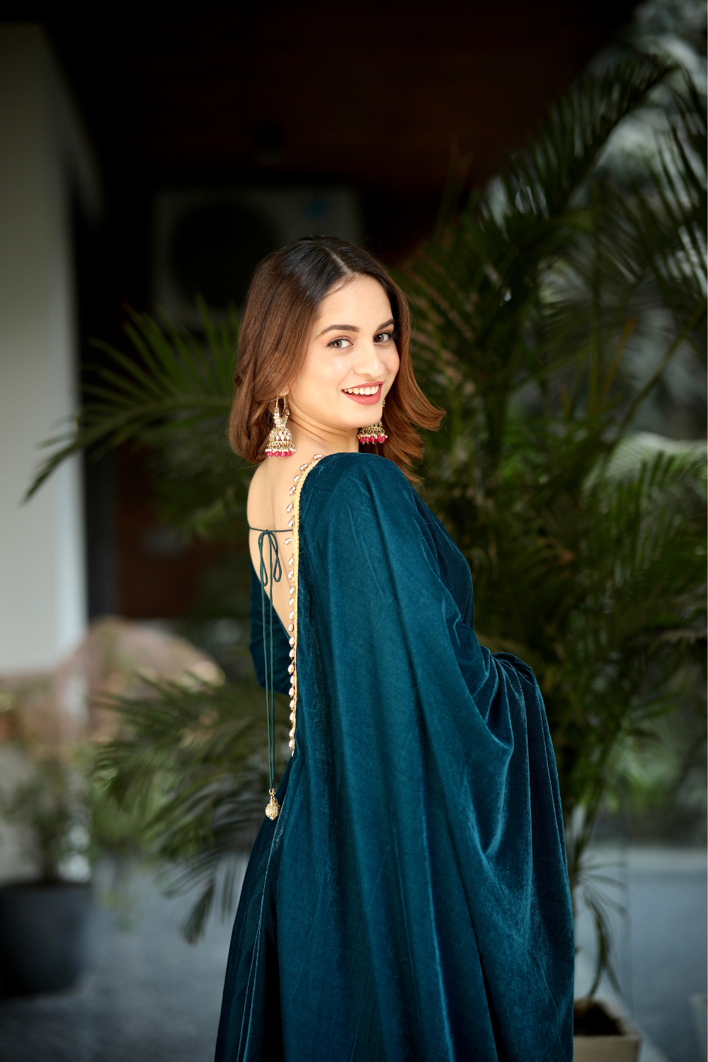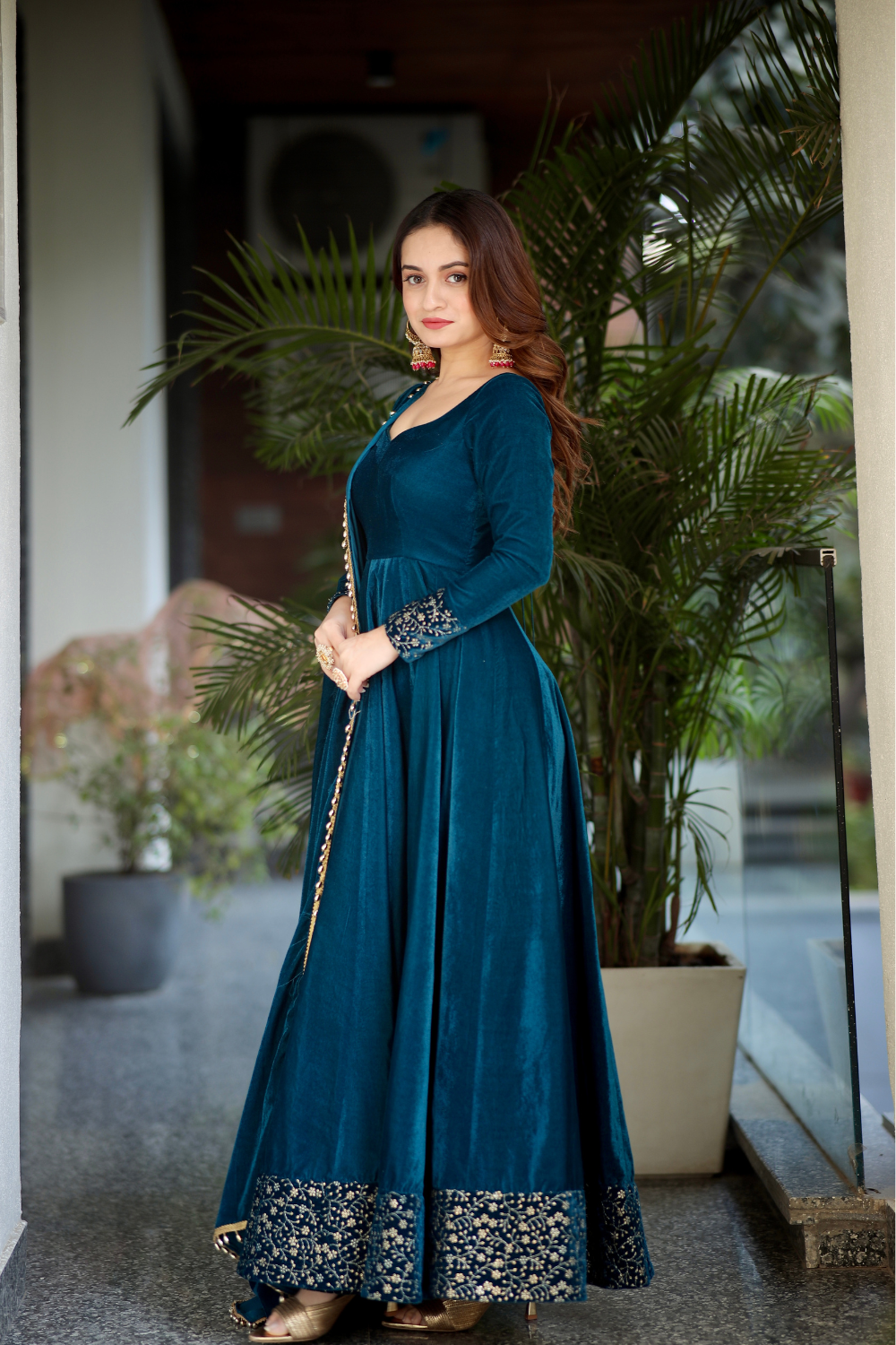 This exquisite sea green velvet Anarkali exudes elegance and charm. The rich, plush fabric offers both warmth and comfort, making it perfect for cooler evenings or special occasions. The unique sea green color, soft yet vibrant, is both refreshing and timeless. Intricate borders at the sleeves and hemline add a touch of sophistication, beautifully complementing the flowing silhouette of the Anarkali. Whether for a festive celebration or a stylish gathering, this piece ensures you feel graceful and comfortable while turning heads.