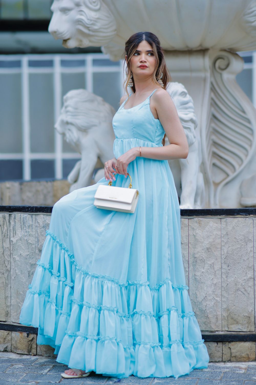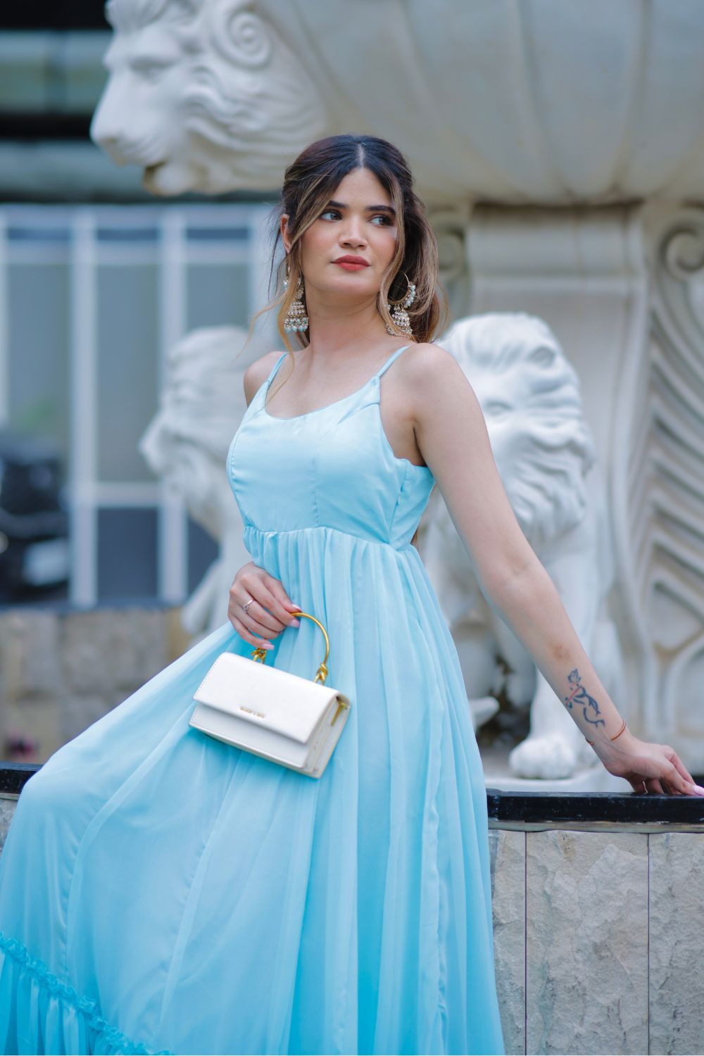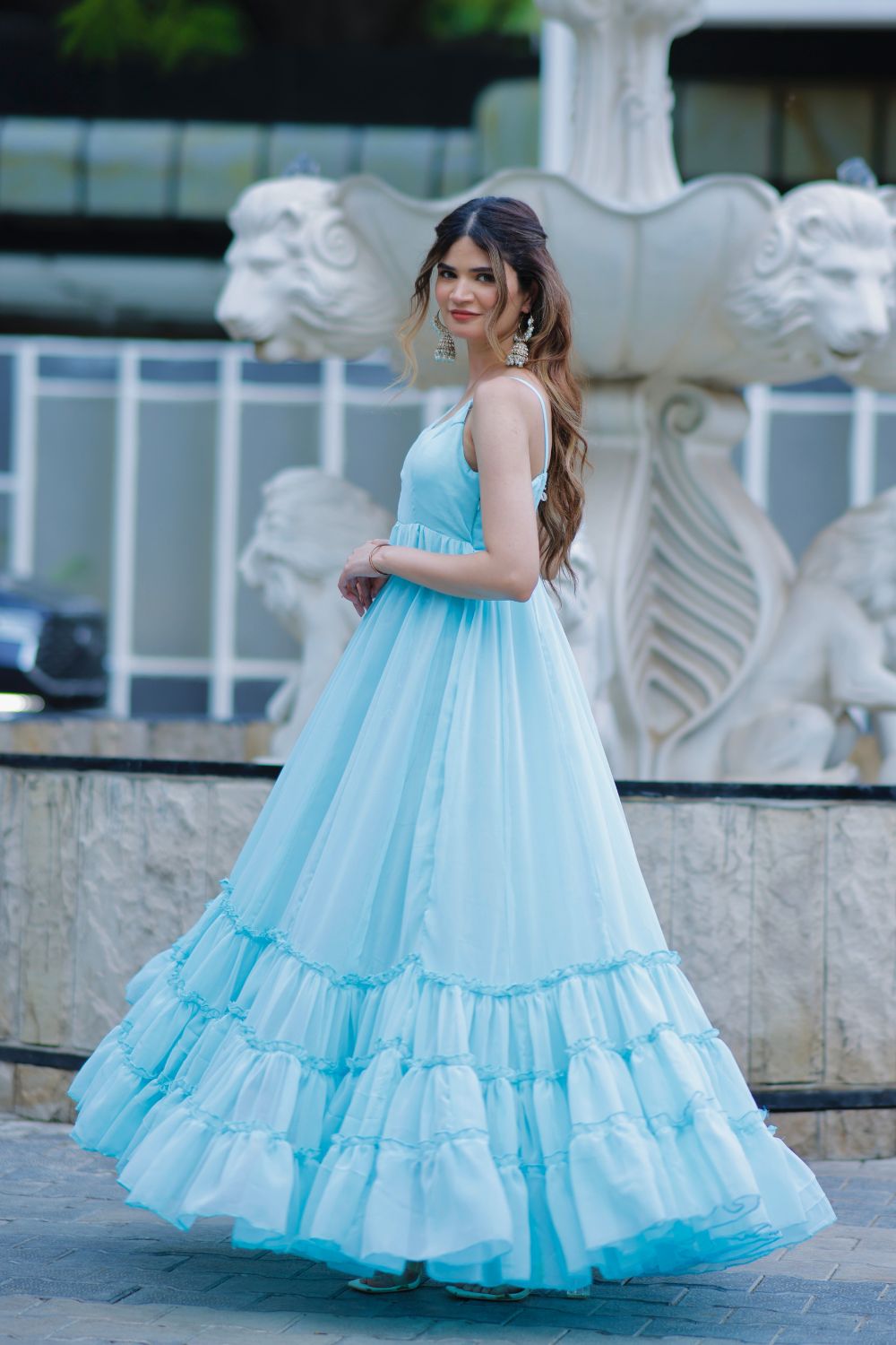 Picture a gown that blends the charm of traditional Indian wear with the ease of western comfort. This full-length stunner is all about flounce and that Bollywood flair, complete with gorgeous sea shell lace detailing at the back. It's super comfy, airy, and oh-so-chic.