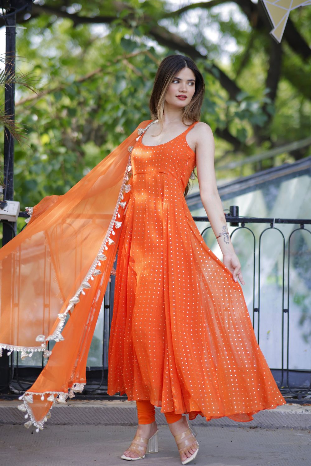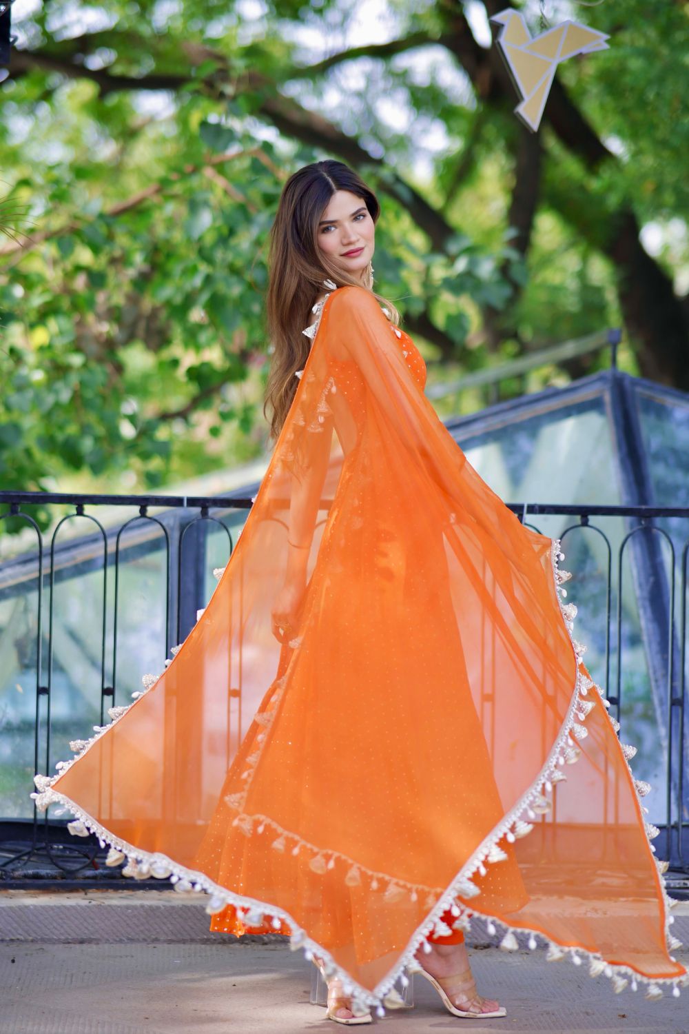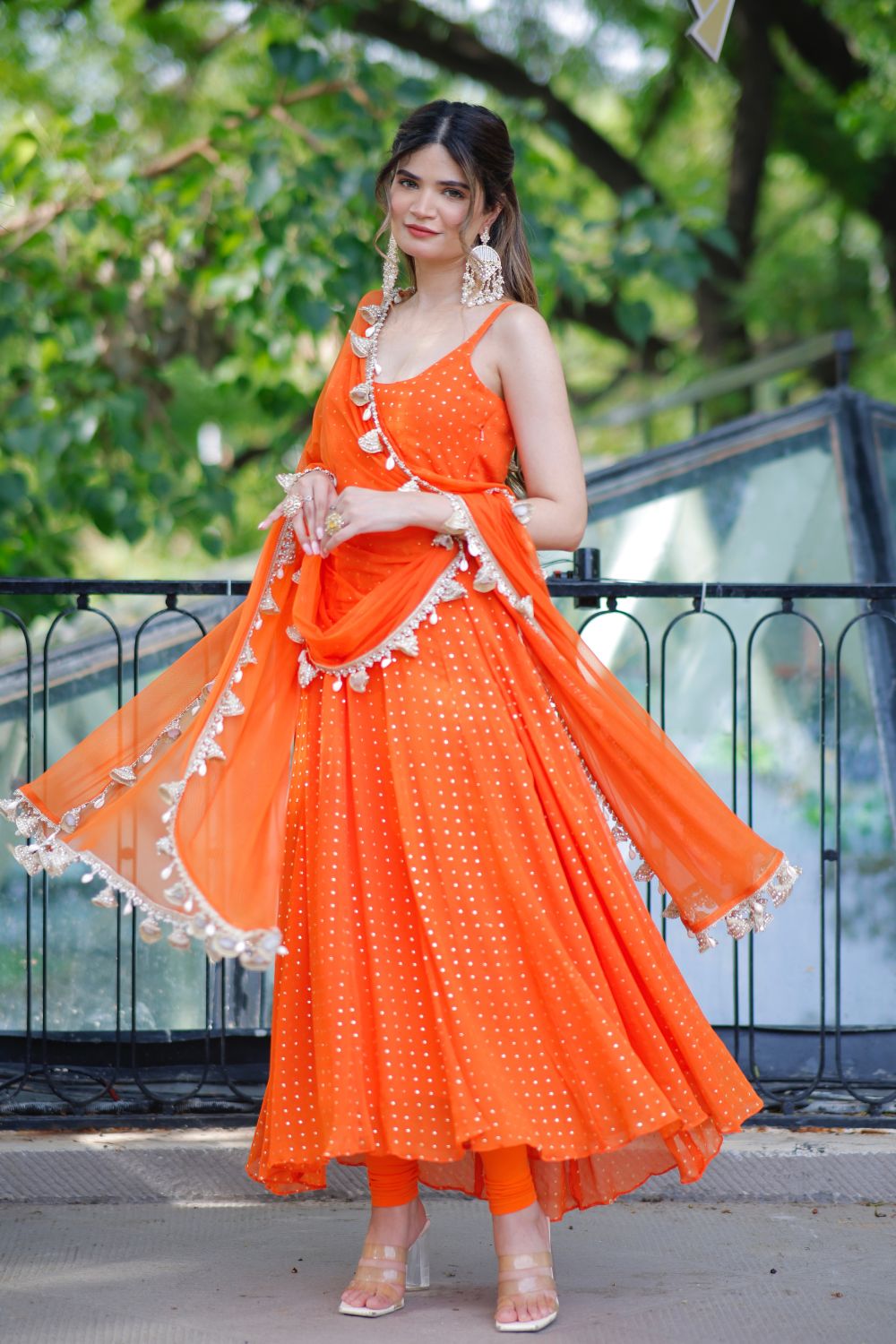 Step into elegance with this stunning orange anarkali suit that exudes timeless charm and contemporary grace. Crafted with delicate noodle straps that delicately frame the shoulders, it features a daring deep back neck design, adding a touch of allure to its traditional silhouette. Paired with a matching legging, the ensemble ensures a seamless and sophisticated look, emphasizing both comfort and style. Completing the attire is a net dupatta adorned with beautiful handmade lace, adding a touch of ethereal beauty and completing the ensemble with finesse.
