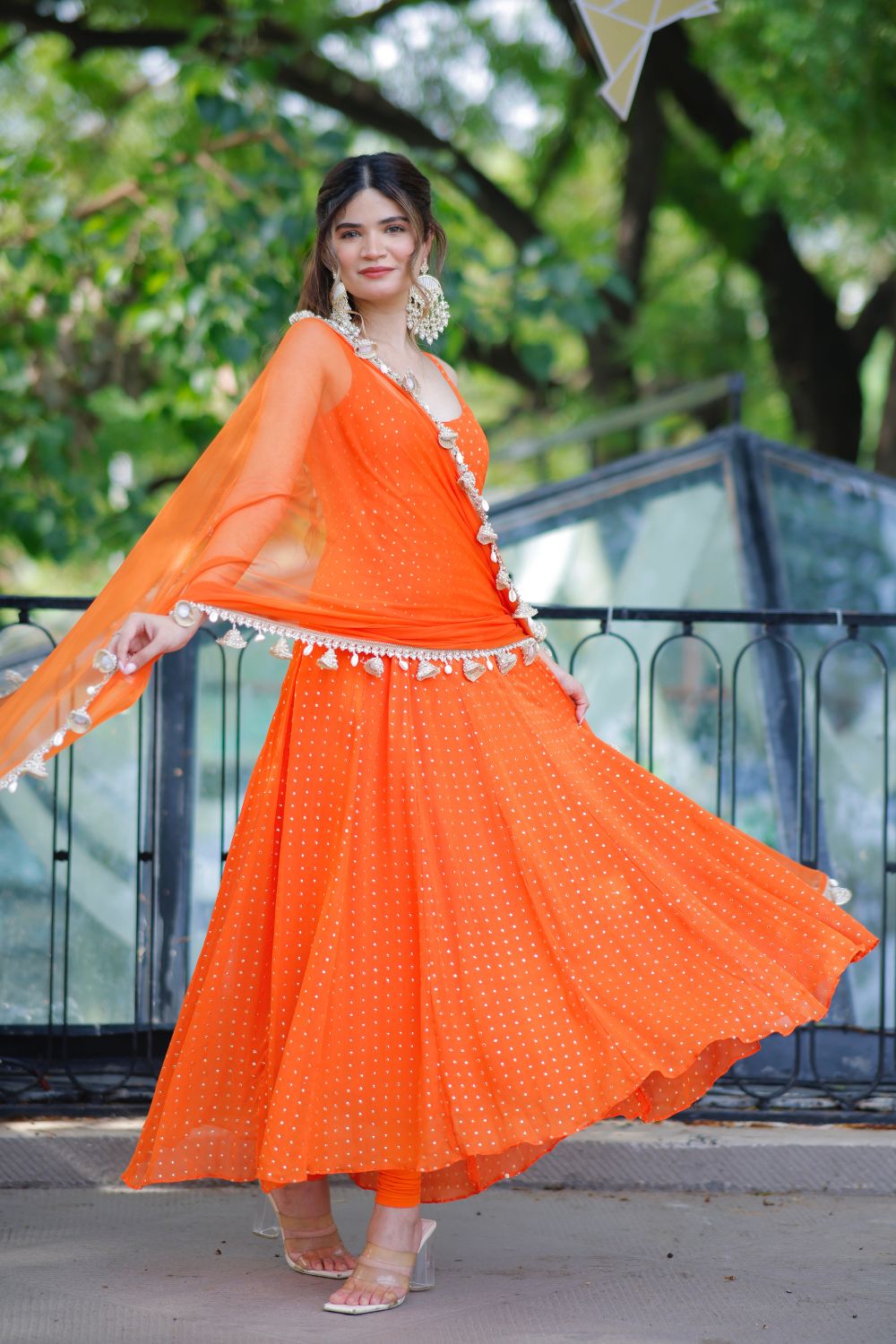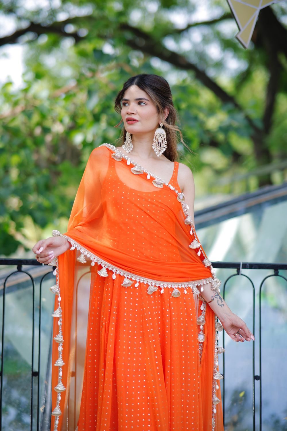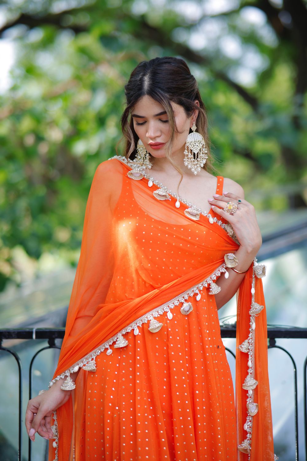 Step into elegance with this stunning orange anarkali suit that exudes timeless charm and contemporary grace. Crafted with delicate noodle straps that delicately frame the shoulders, it features a daring deep back neck design, adding a touch of allure to its traditional silhouette. Paired with a matching legging, the ensemble ensures a seamless and sophisticated look, emphasizing both comfort and style. Completing the attire is a net dupatta adorned with beautiful handmade lace, adding a touch of ethereal beauty and completing the ensemble with finesse.