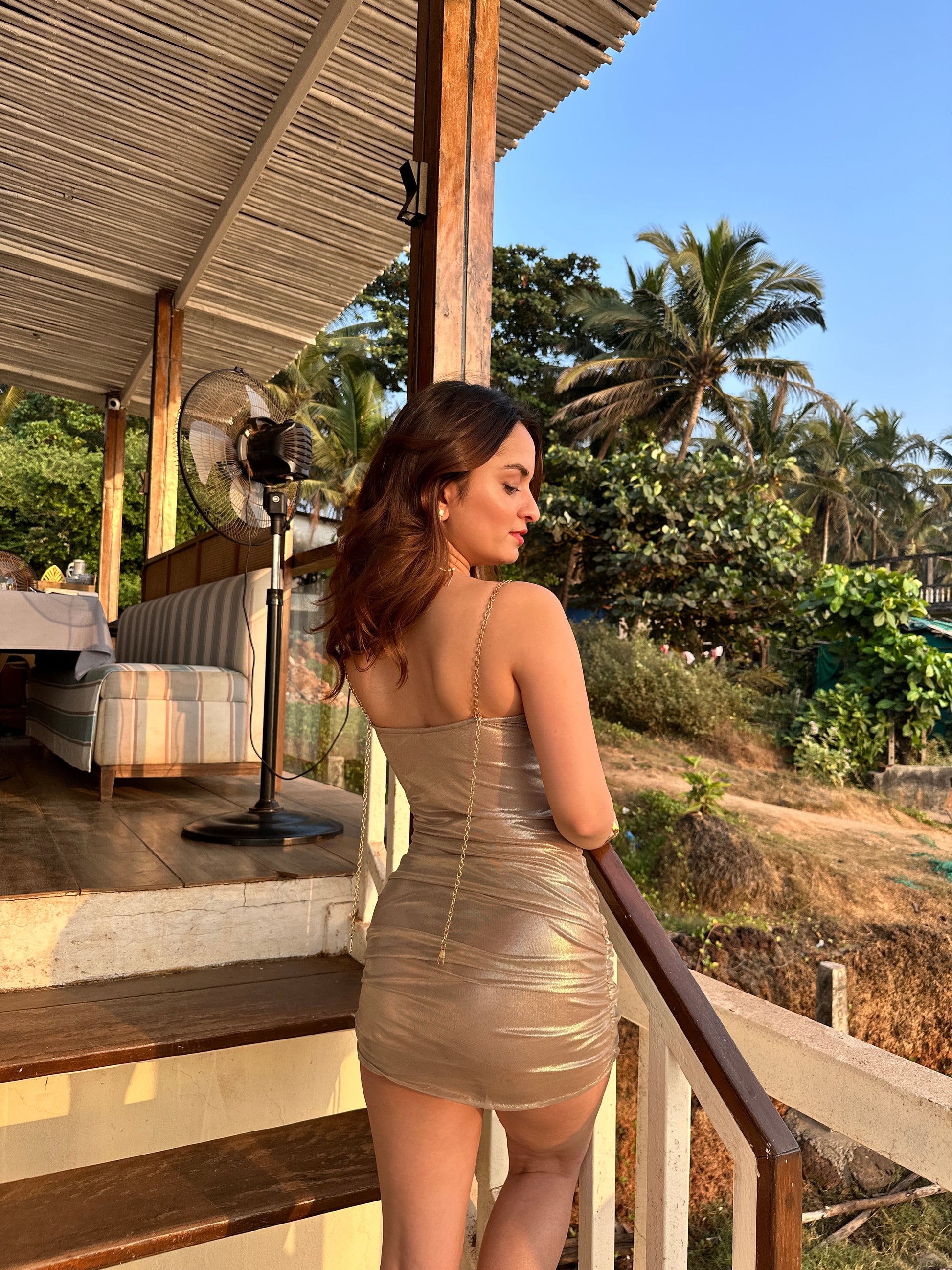 Elevate your style with this stunning golden dress, crafted from luxurious Lycra fabric for a sleek and flattering fit. The shimmering golden hue exudes elegance and sophistication, while the intricate golden chain detail adds a touch of bold glamour. Perfect for any evening event or special occasion, this dress moves effortlessly with you, providing both comfort and style. The stretchy Lycra fabric ensures a figure-hugging silhouette that enhances your curves while offering ultimate freedom of movement. Turn heads and shine with confidence in this exquisite golden dress—where luxury meets style.