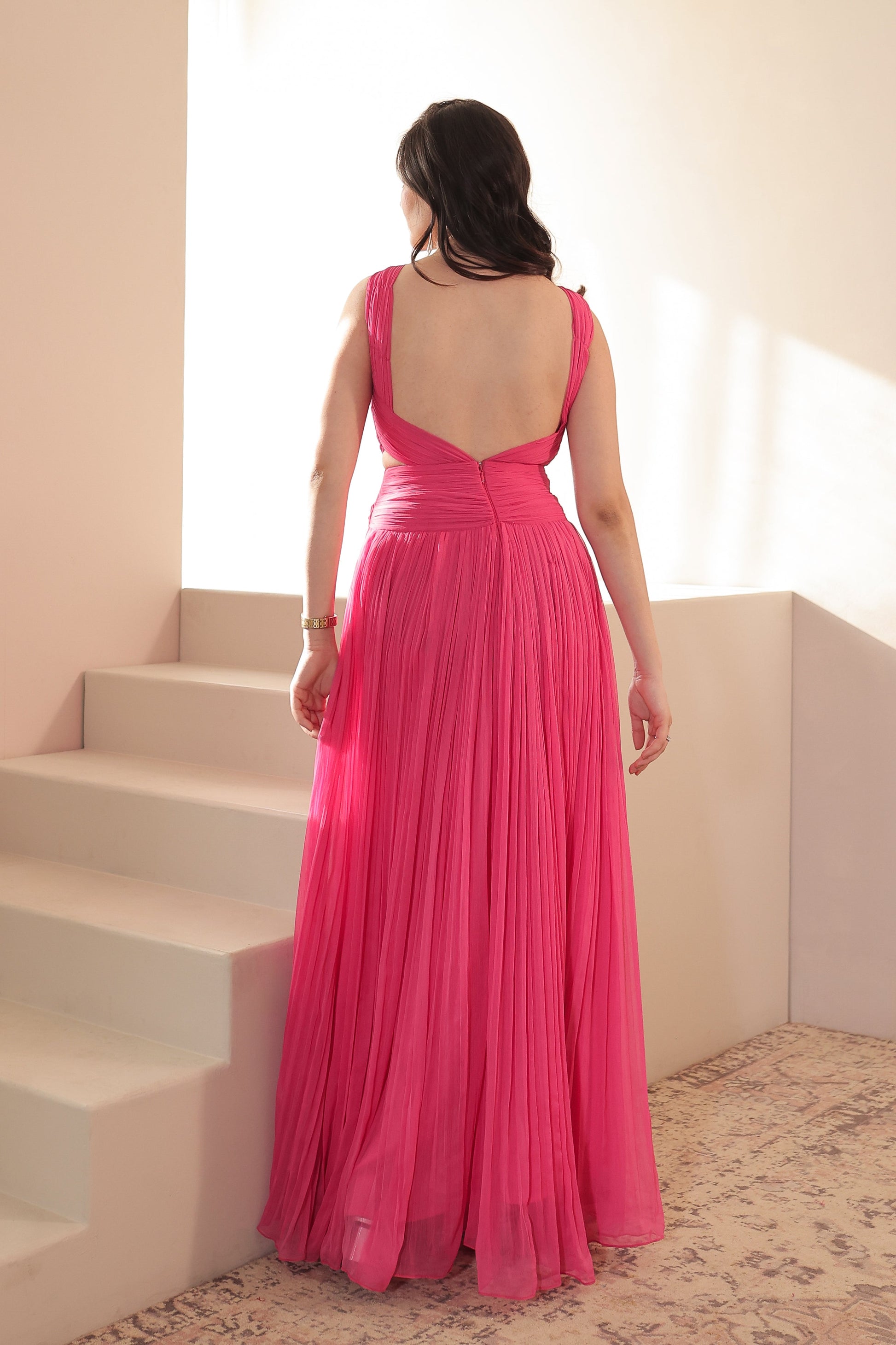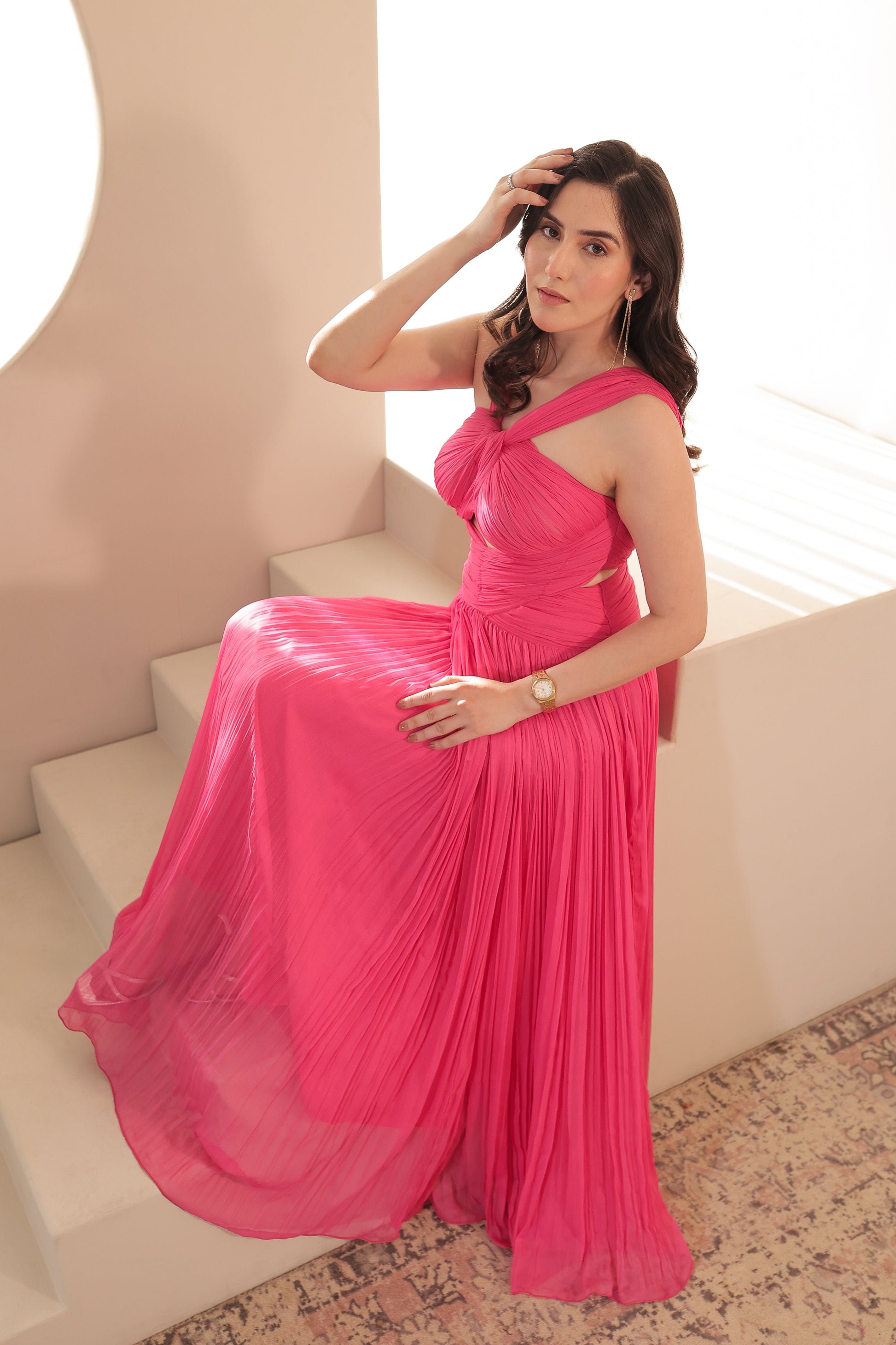 With strategic cut-out details at the best places and a front slit, this gown exudes confidence and sophistication, making it the perfect choice for a glamorous birthday celebration or a lavish resort vacation. Whether you're toasting under the stars or strolling through a high-end getaway, this gown ensures you stand out with effortless grace. Pair it with strappy heels and statement jewelry for the ultimate luxe vibe.