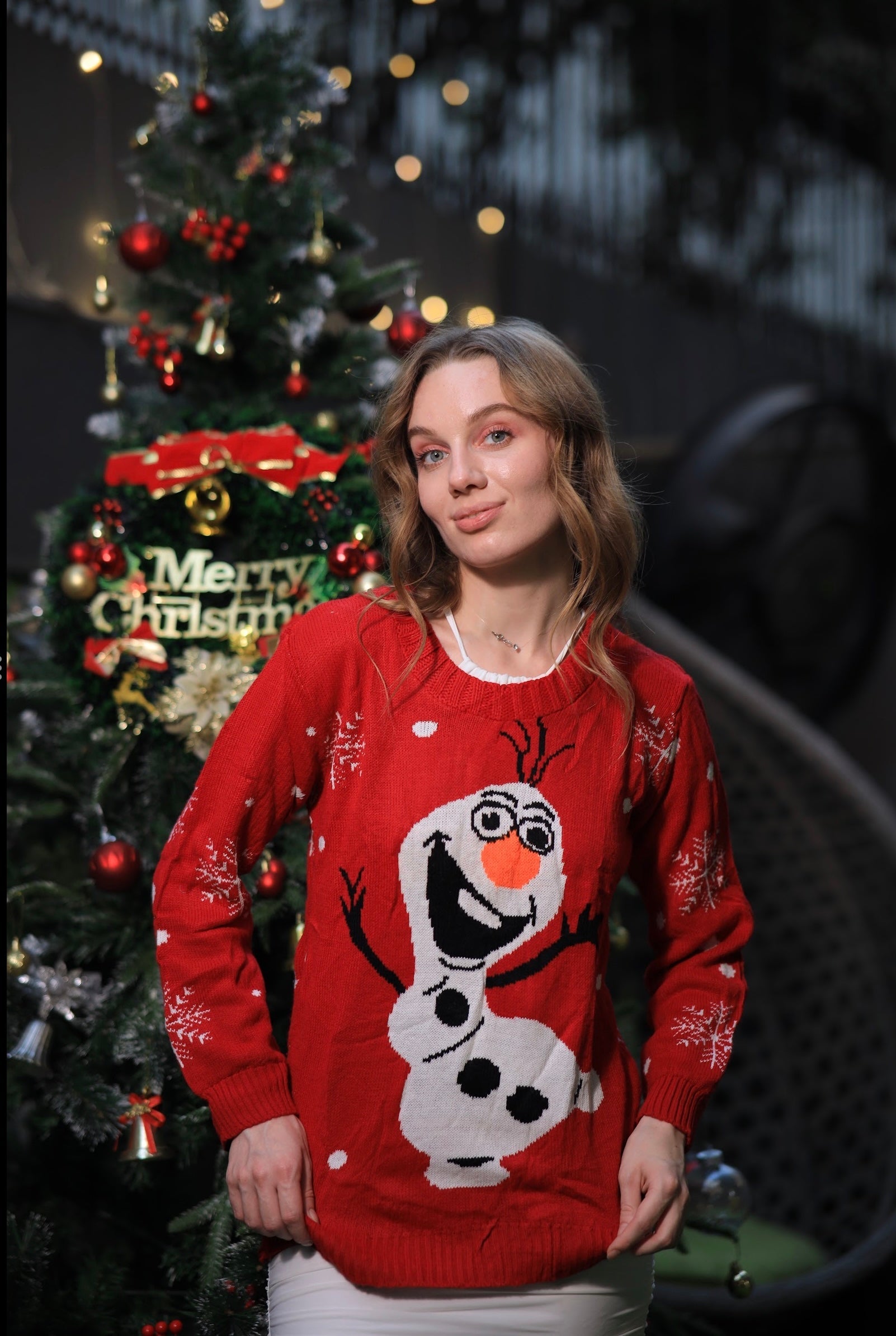 This fun ugly Christmas sweater features a cheerful happy snowman with a scarf and top hat, perfect for spreading holiday cheer. Its bold, festive design makes it ideal for ugly sweater parties or cozy Christmas gatherings.
