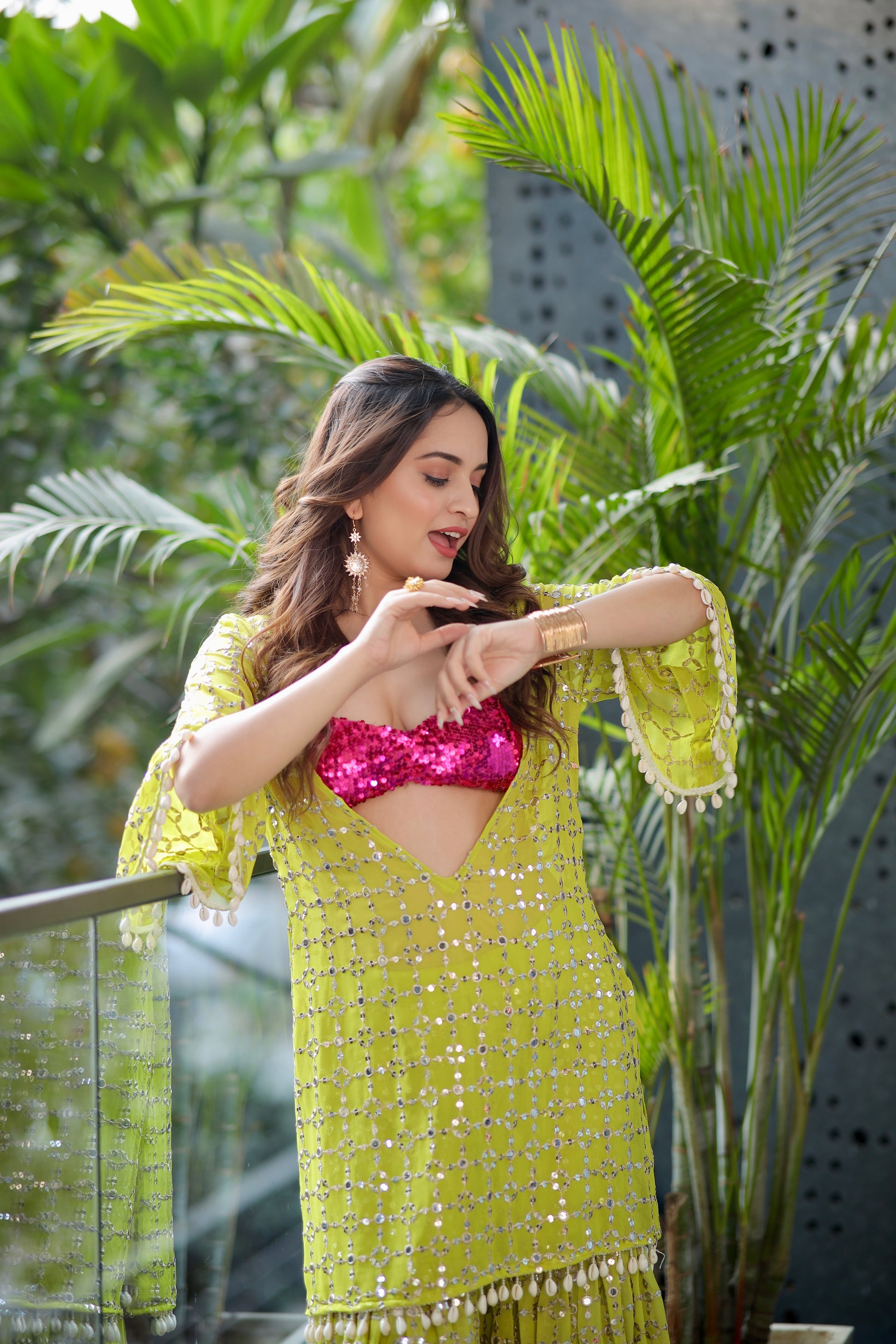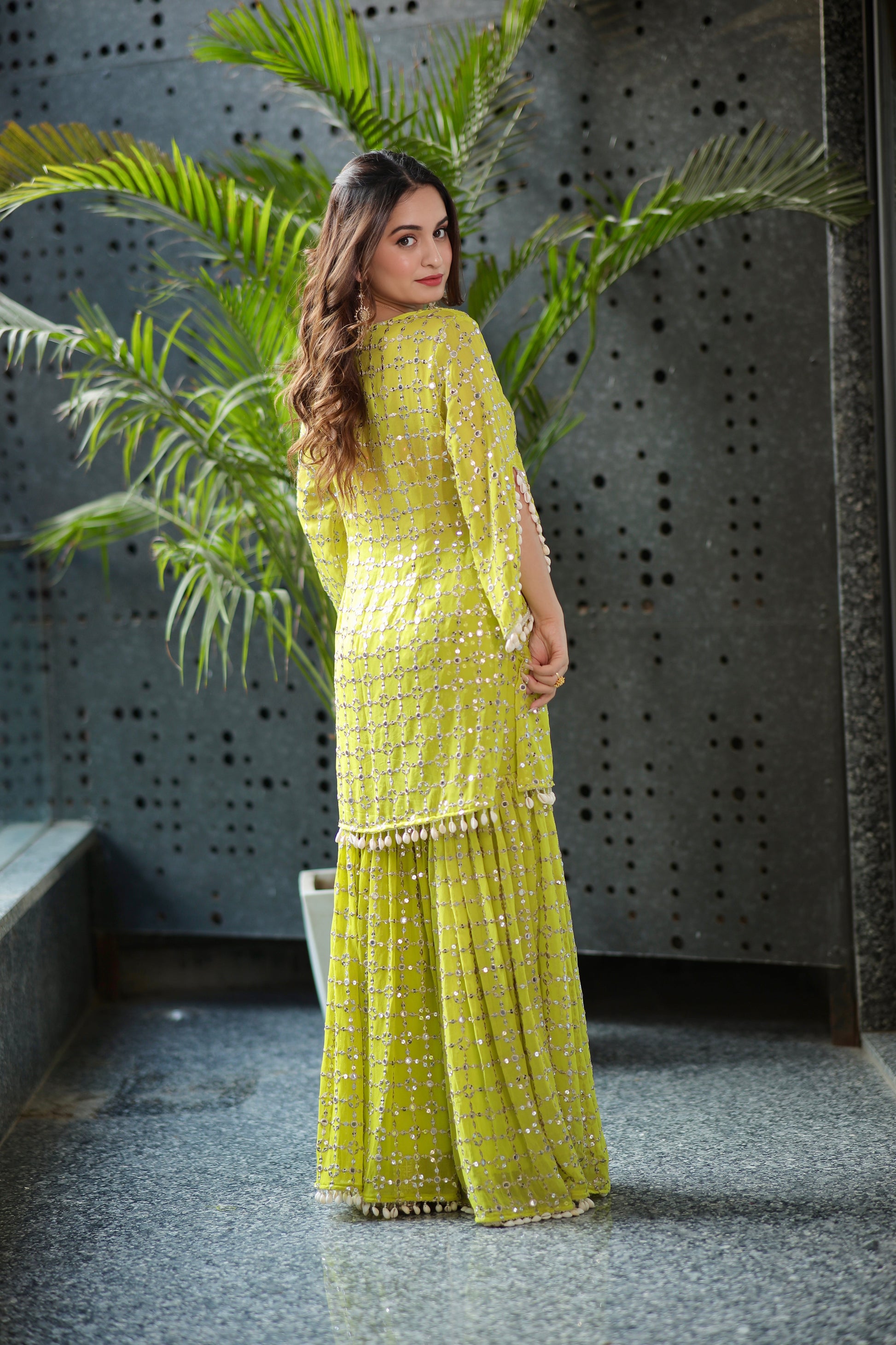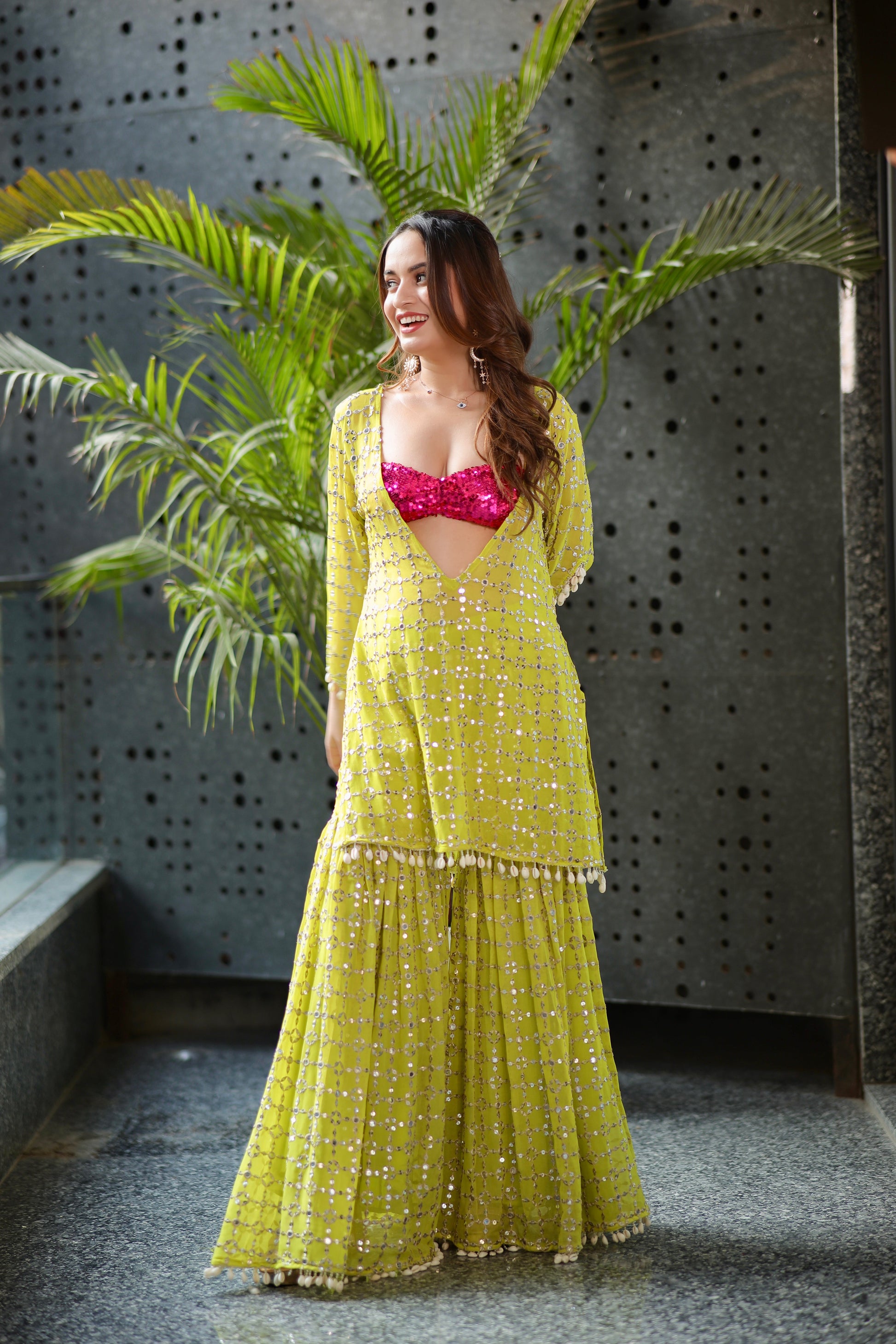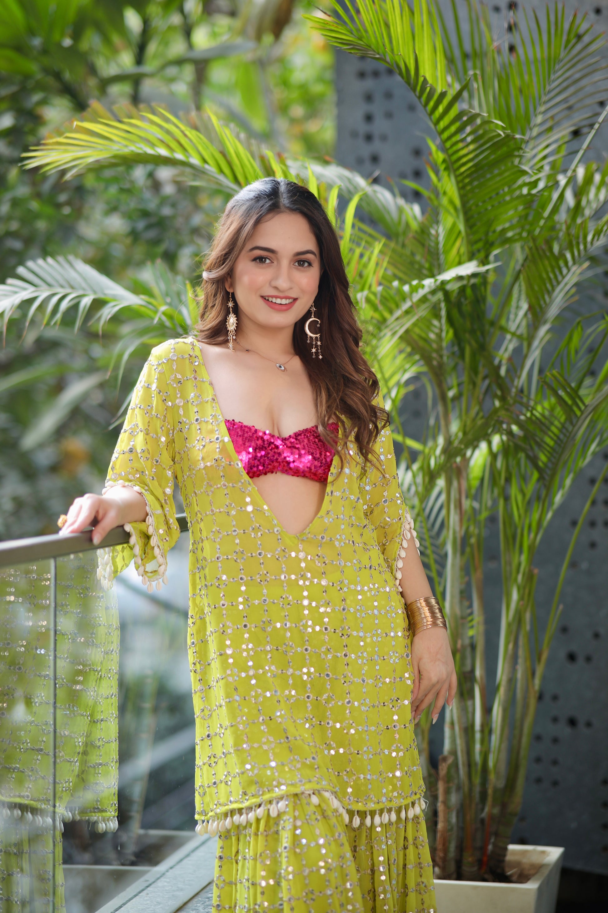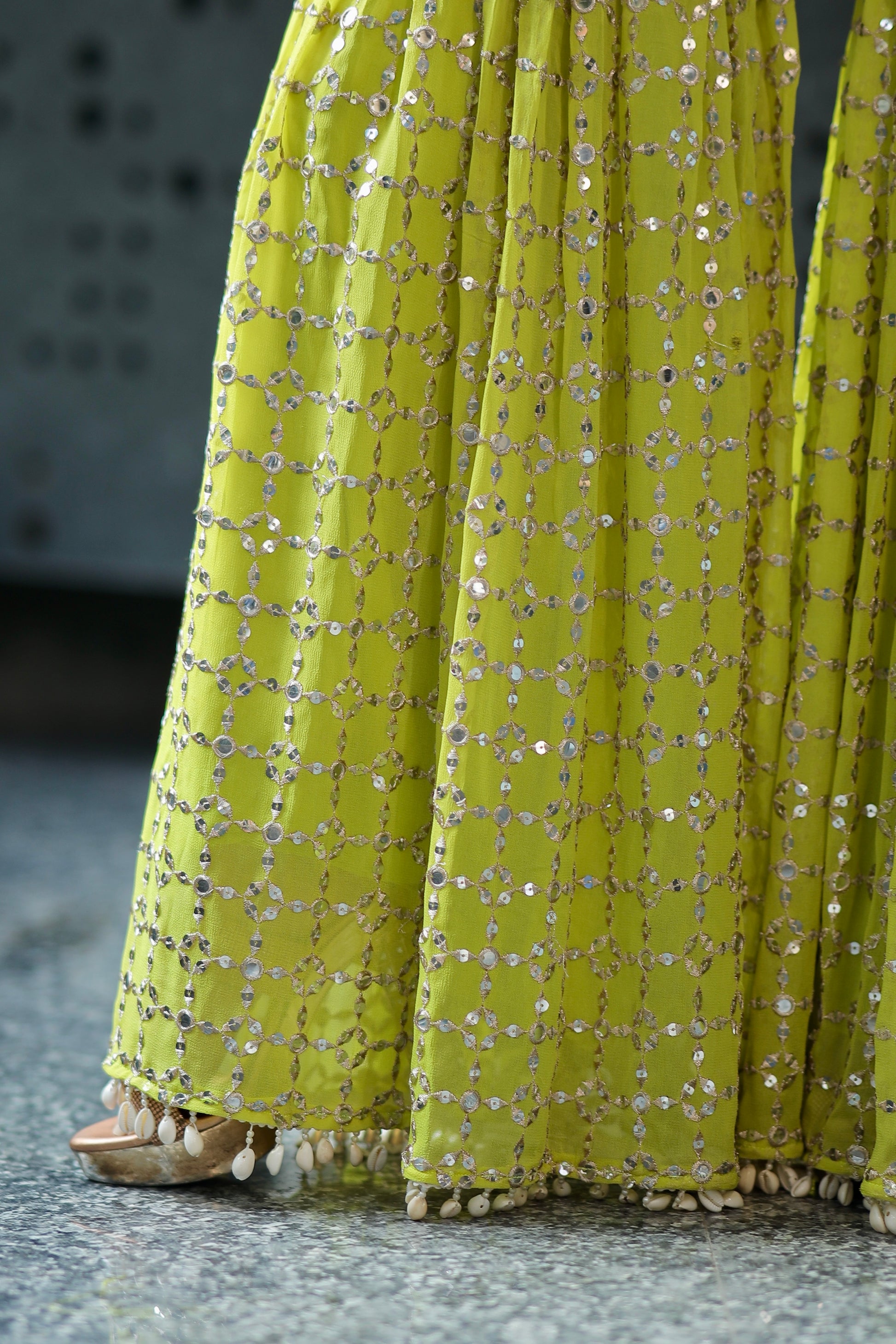 Parrot Green Georgette Set with Flowy Sharara & Open Front V-Neck Kurti