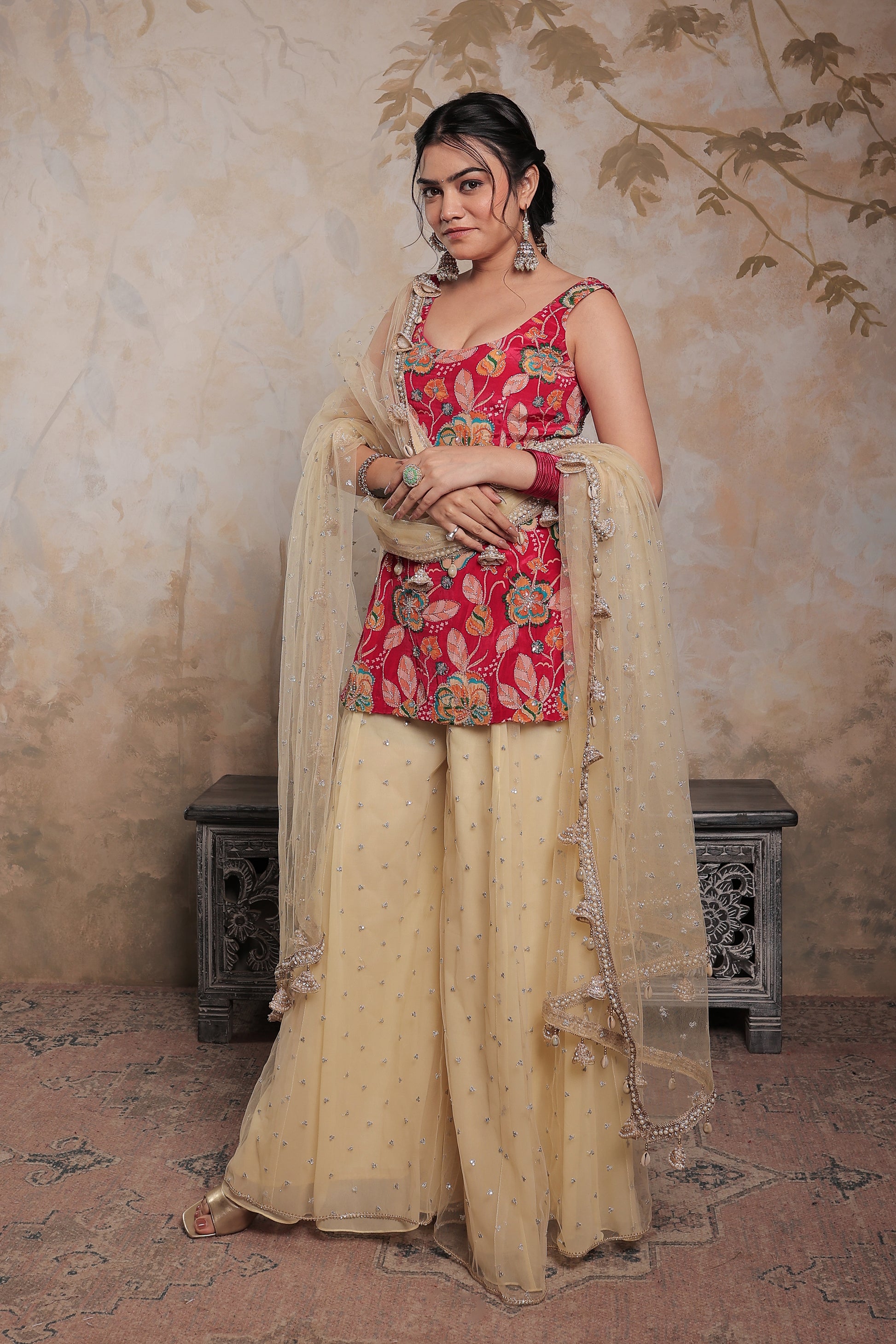 ✔️ Beige sharara in soft net with delicate hand embroidery – flowy & regal