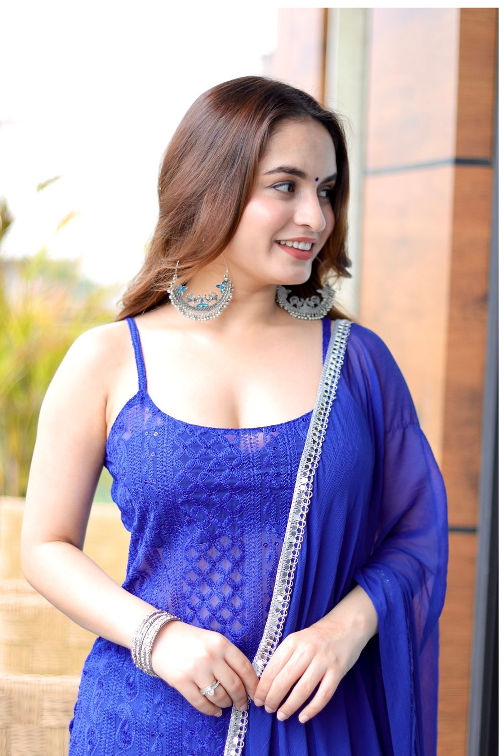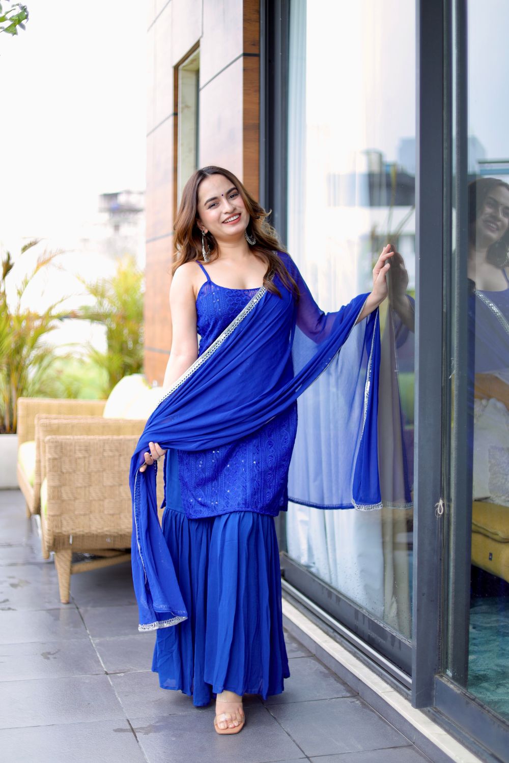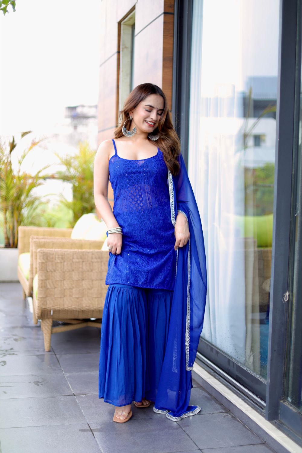Picture a chickankari suit with a beautiful chickankari design adorning the Kurti, paired stylishly with sharara pants. The Kurti features delicate thin noodle straps, striking a perfect balance between ethnic tradition and modern flair.