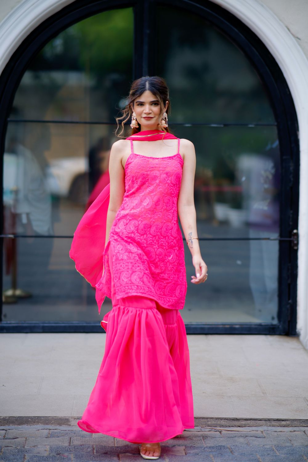 Picture a chikankari suit with a beautiful chikankari design adorning the Kurti, paired stylishly with sharara pants. The Kurti features delicate thin 1 inch straps, striking a perfect balance between ethnic tradition and modern flair.