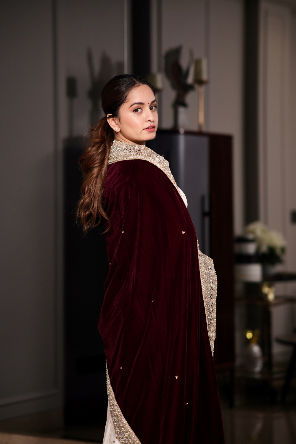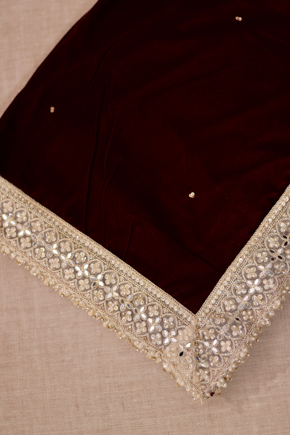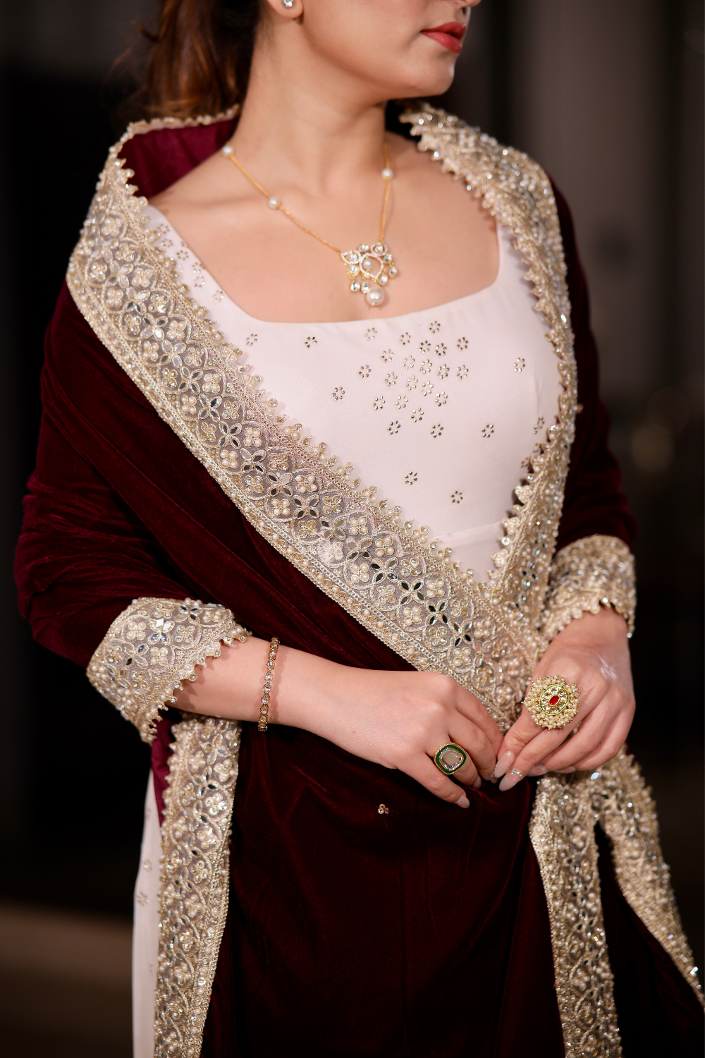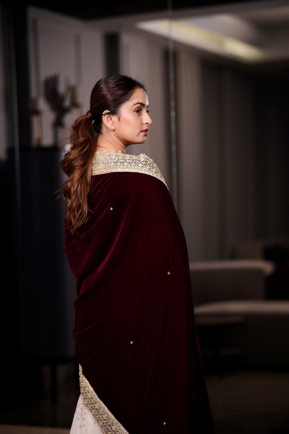 This luxurious velvet shawl combines warmth and style, featuring a soft, plush texture that drapes beautifully. Its intricate embroidered border, with delicate gold or silver thread, adds an elegant touch. Versatile and timeless, it effortlessly complements any outfit, making it the perfect accessory for every occasion.