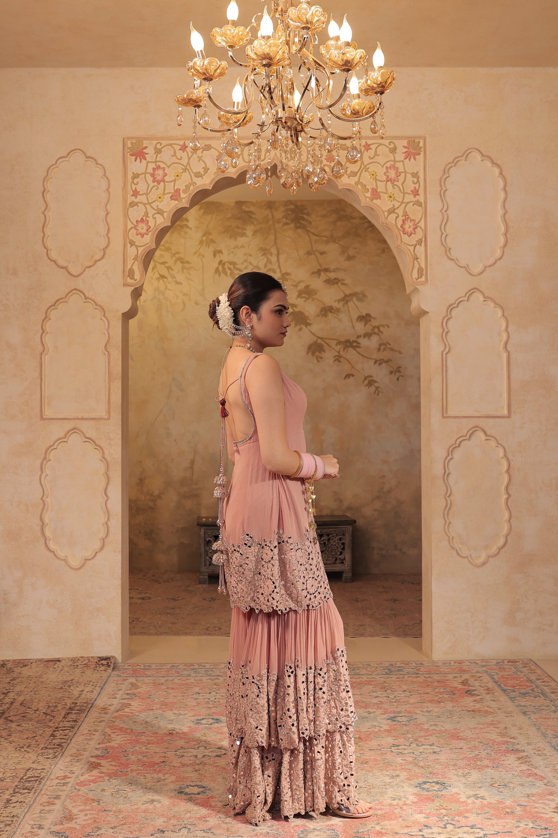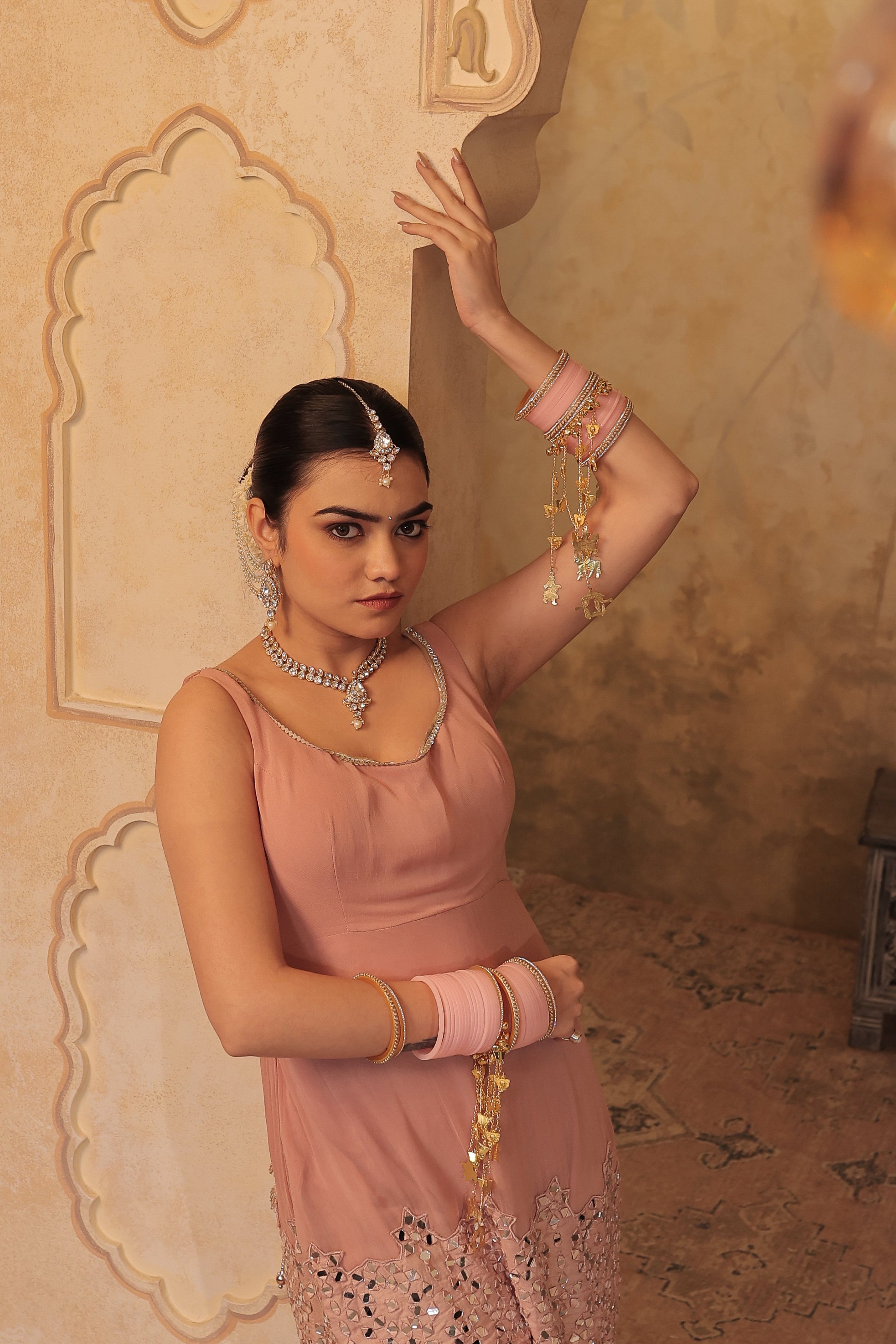 Elegant Soft Pink Sharara – Handcrafted Mirror Work with Net Dupatta