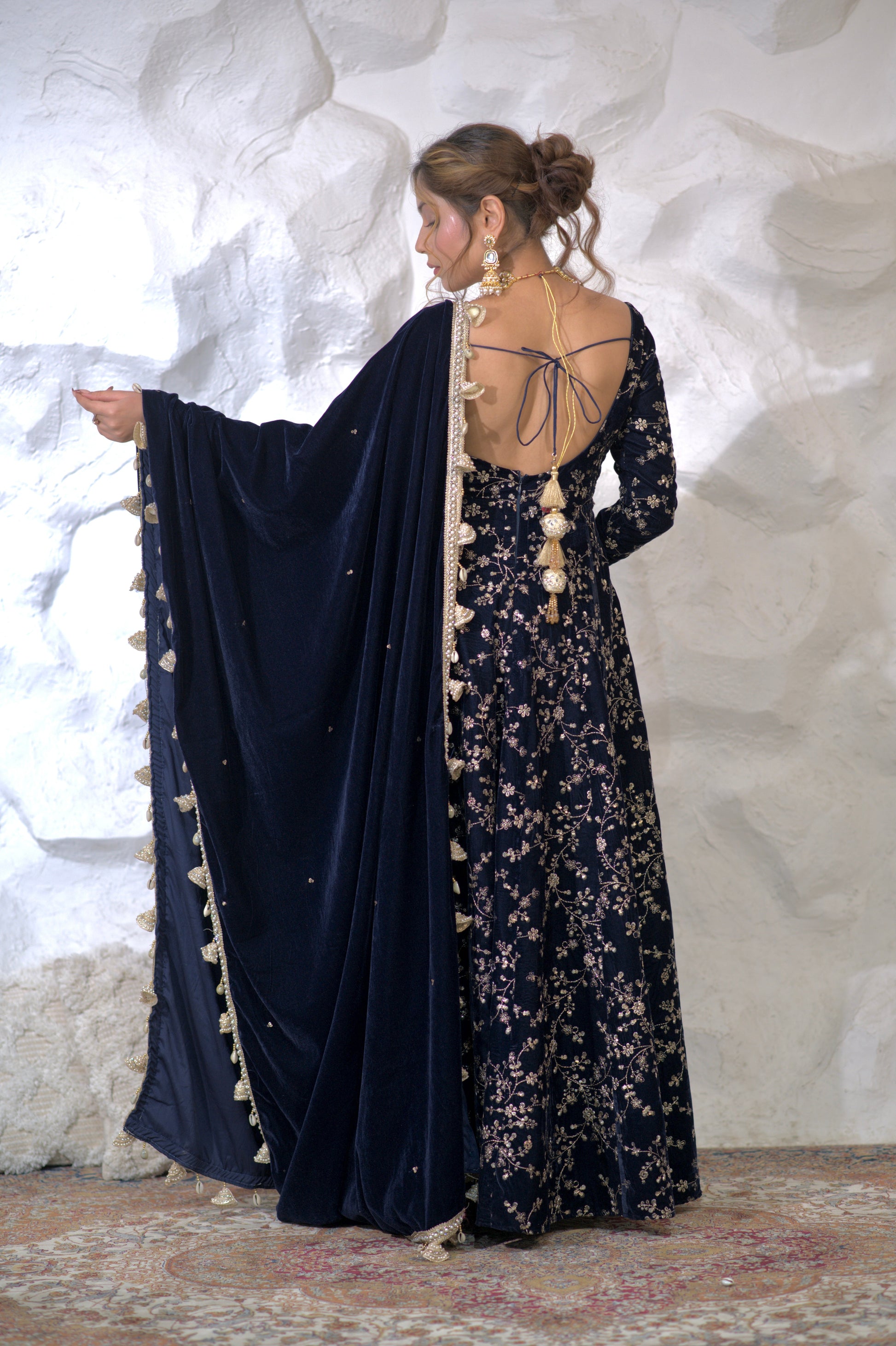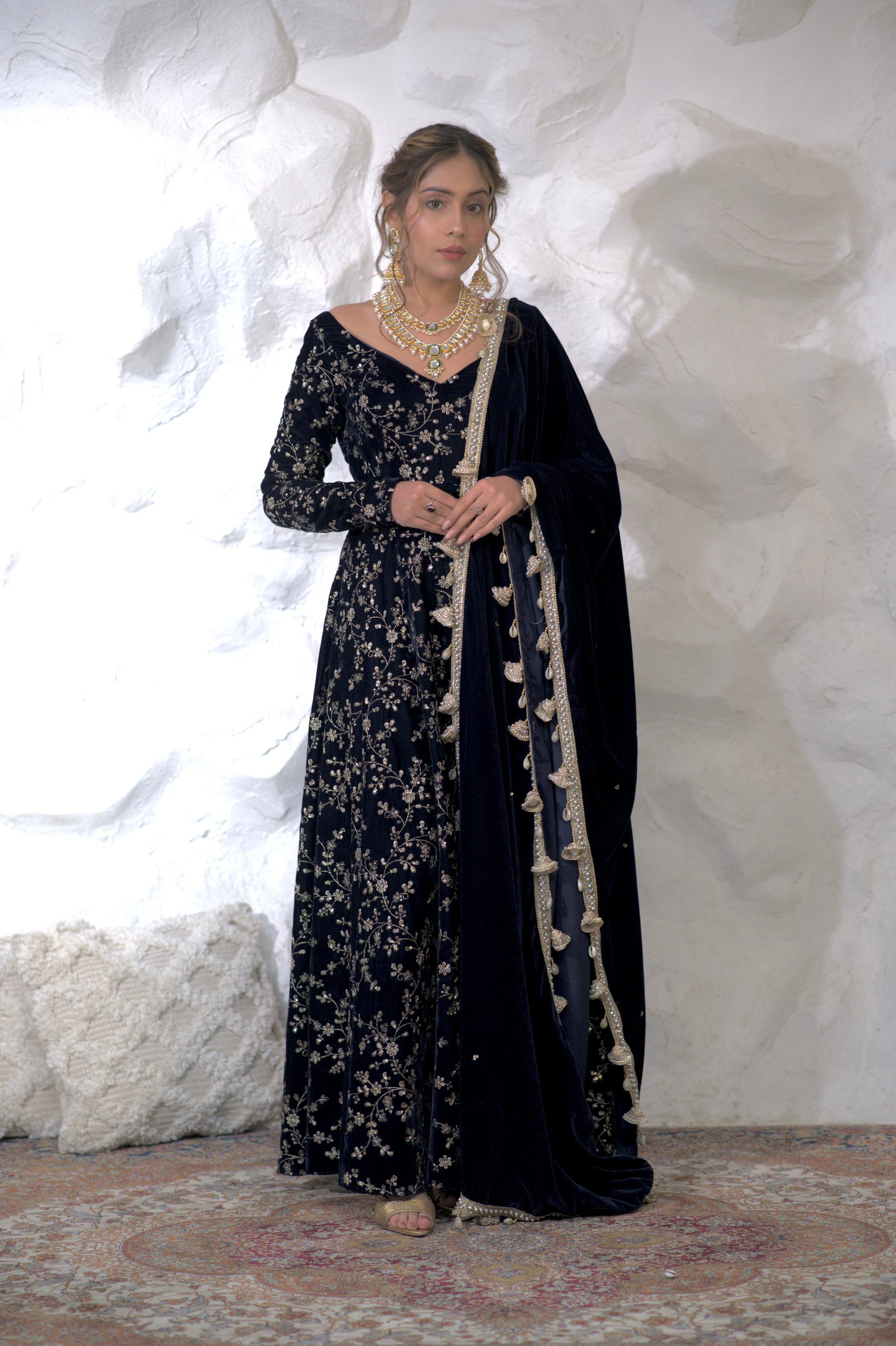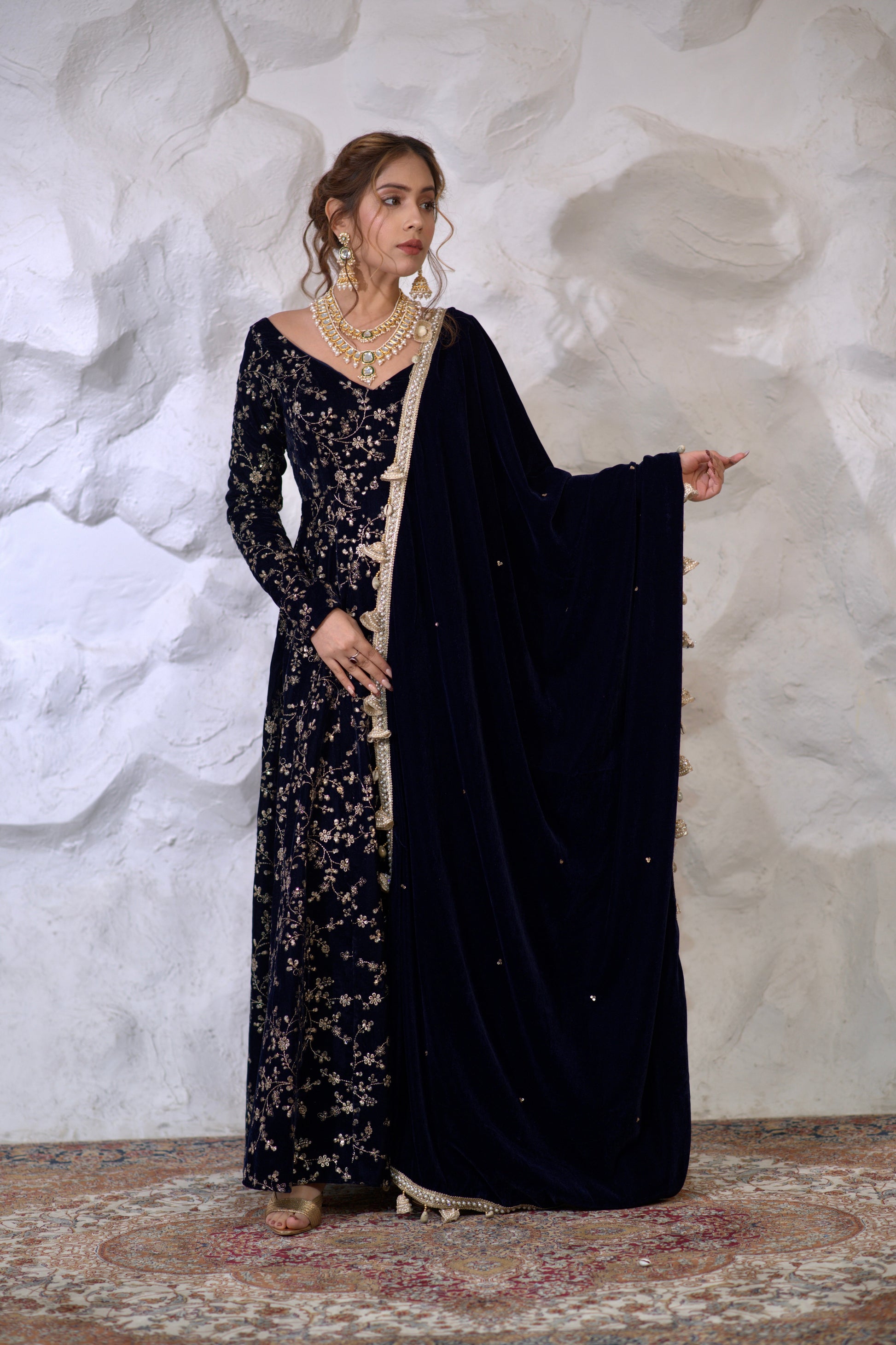 Malaika Velvet Navy blue Anarkali inluxurious velvet fabric will add a rich, soft texture to the outfit, making it ideal for evening and cooler weather events. Velvet also adds depth to the color navy blue shades even more vibrancy and richness.Bold blue is passionate color, perfect for making a statement. It is often associated with celebration, love, and festivity, making it a popular choice for special occasions.