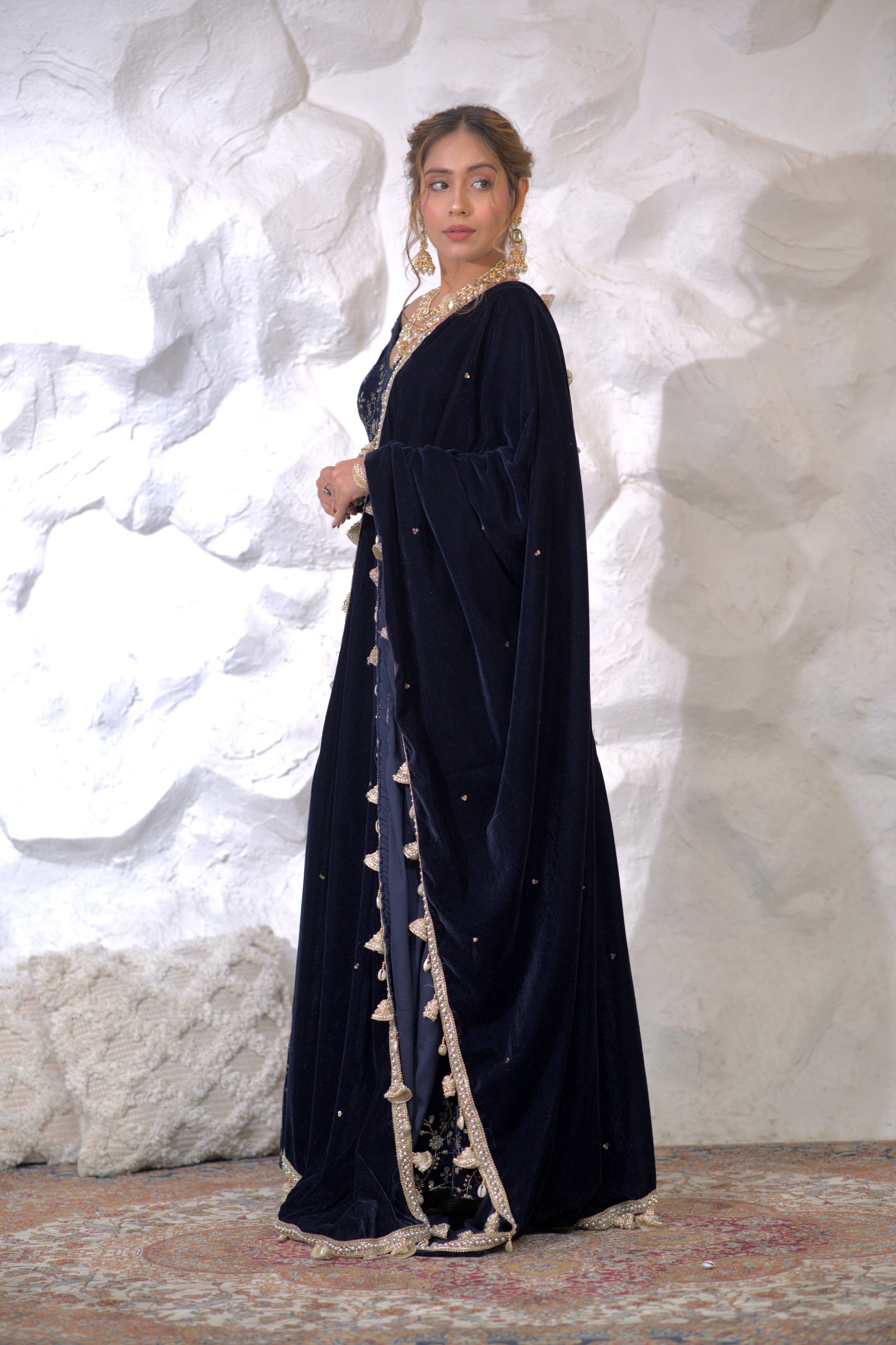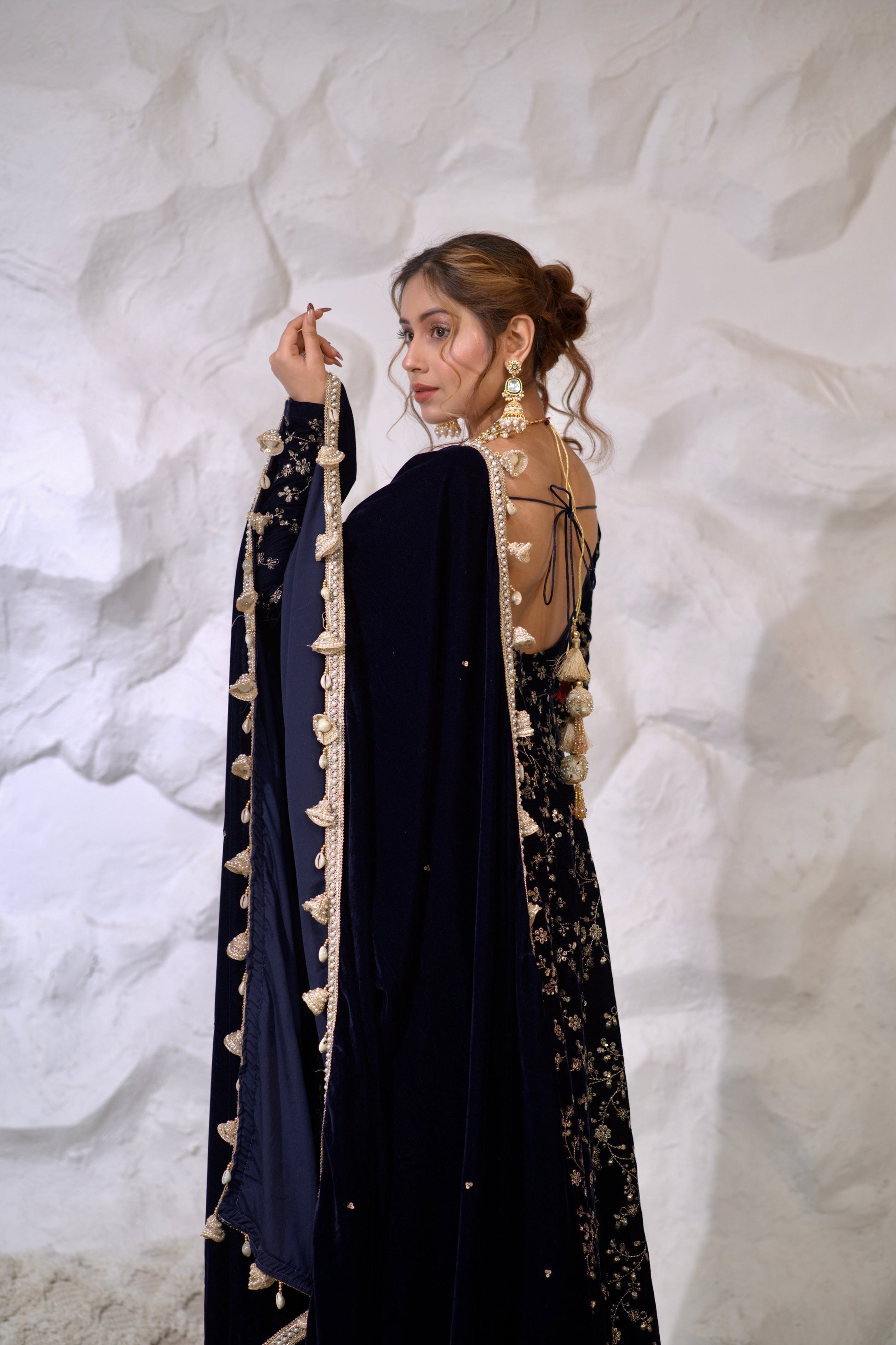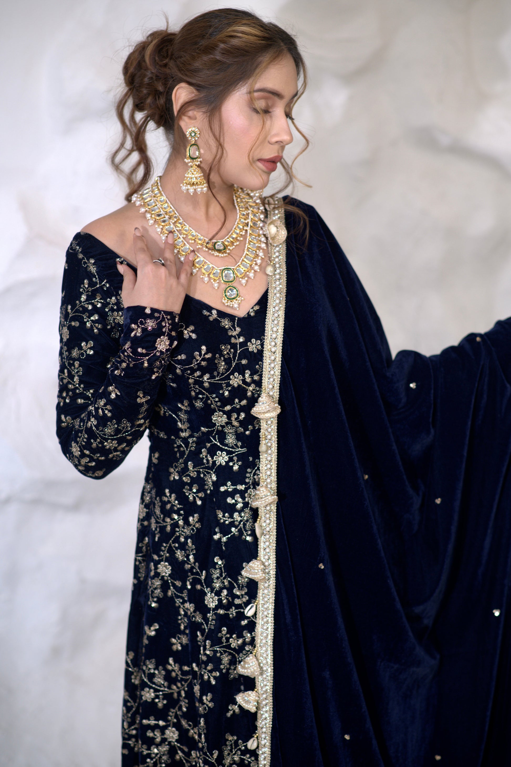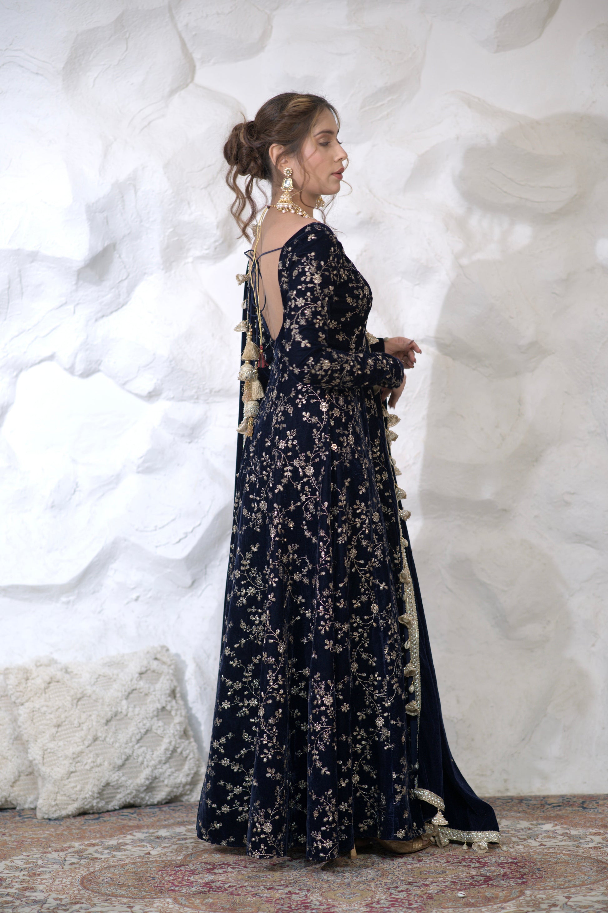 Malaika Velvet Navy blue Anarkali inluxurious velvet fabric will add a rich, soft texture to the outfit, making it ideal for evening and cooler weather events. Velvet also adds depth to the color navy blue shades even more vibrancy and richness.Bold blue is passionate color, perfect for making a statement. It is often associated with celebration, love, and festivity, making it a popular choice for special occasions.