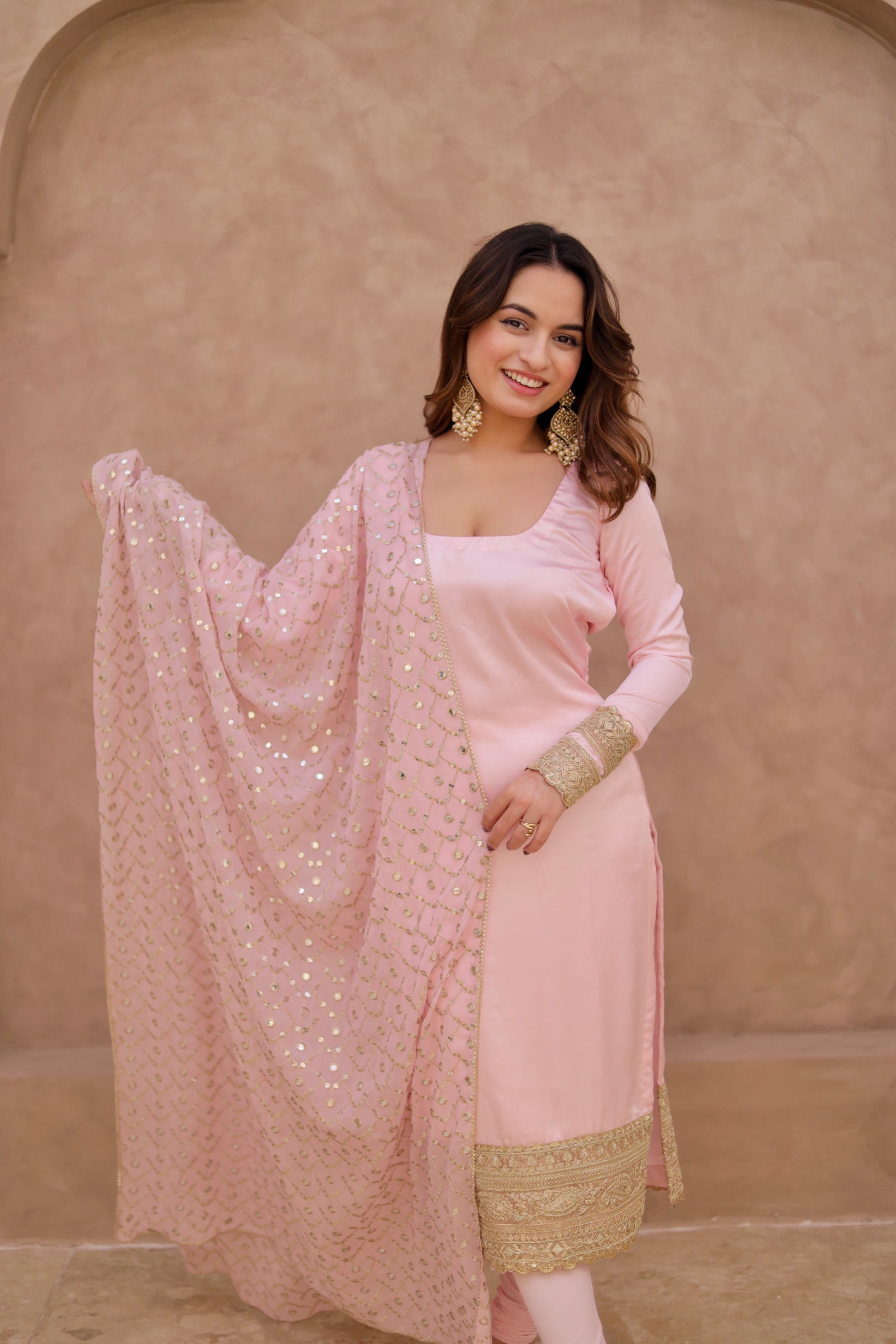 Drape yourself in luxury with this perfect pink silk suit, a classic ensemble that exudes grace and sophistication. Crafted from rich, lustrous silk, the flowy kurta features a beautifully designed intricate border at the hem, adding a regal touch to its timeless silhouette.