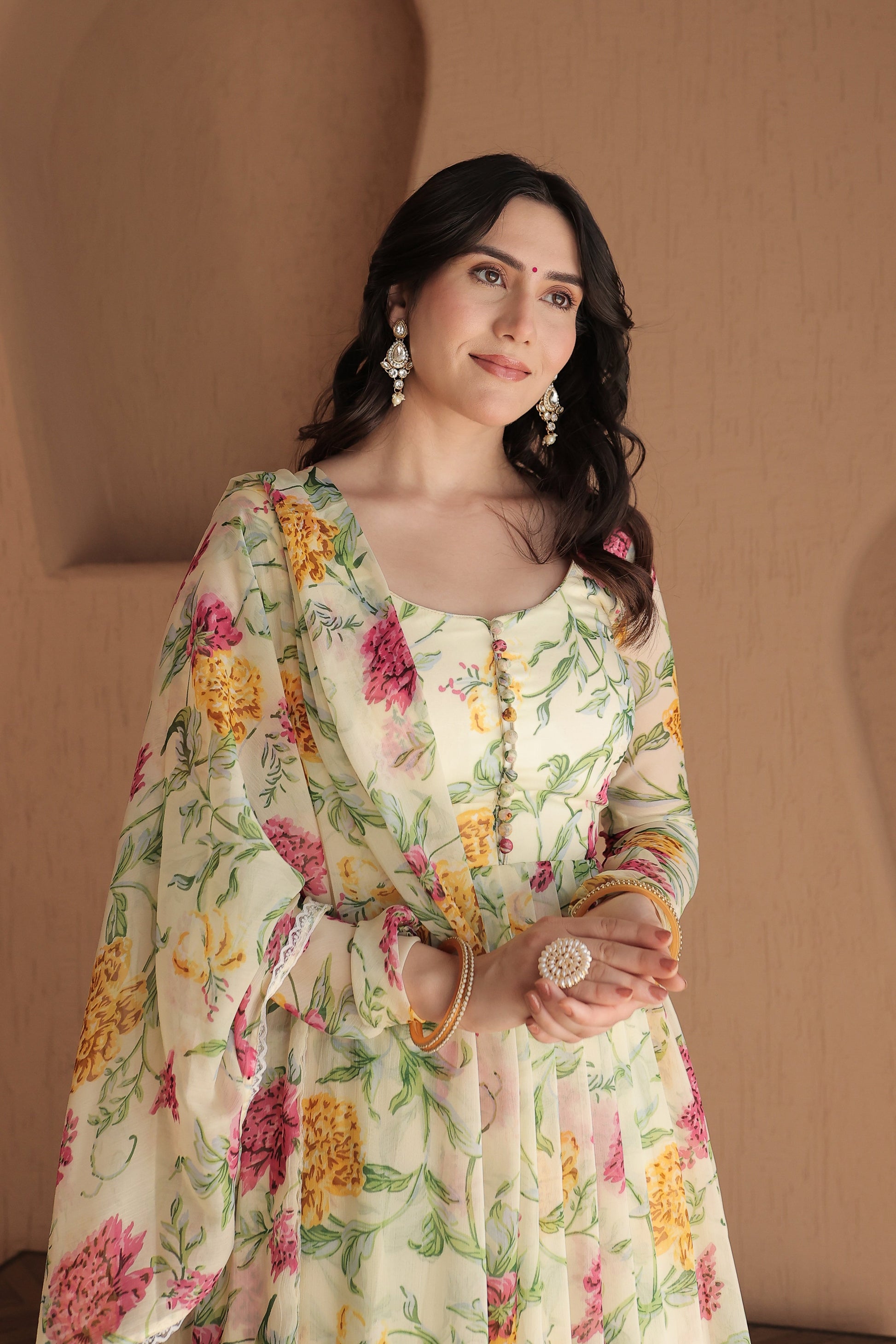 The soft beige hue adds a touch of sophistication, making it a versatile choice for summer weddings, festive celebrations, or elegant evening gatherings. The airy, breathable fabric ensures all-day comfort, while the graceful Anarkali silhouette exudes timeless charm. Simply pair it with delicate jewelry and sandals for a chic, breezy look perfect for warm-weather occasions.