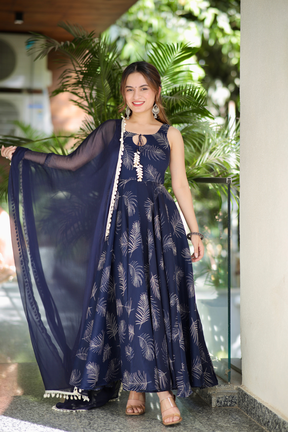 The soft beige hue adds a touch of sophistication, making it a versatile choice for summer weddings, festive celebrations, or elegant evening gatherings. The airy, breathable fabric ensures all-day comfort, while the graceful Anarkali silhouette exudes timeless charm. Simply pair it with delicate jewelry and sandals for a chic, breezy look perfect for warm-weather occasions.