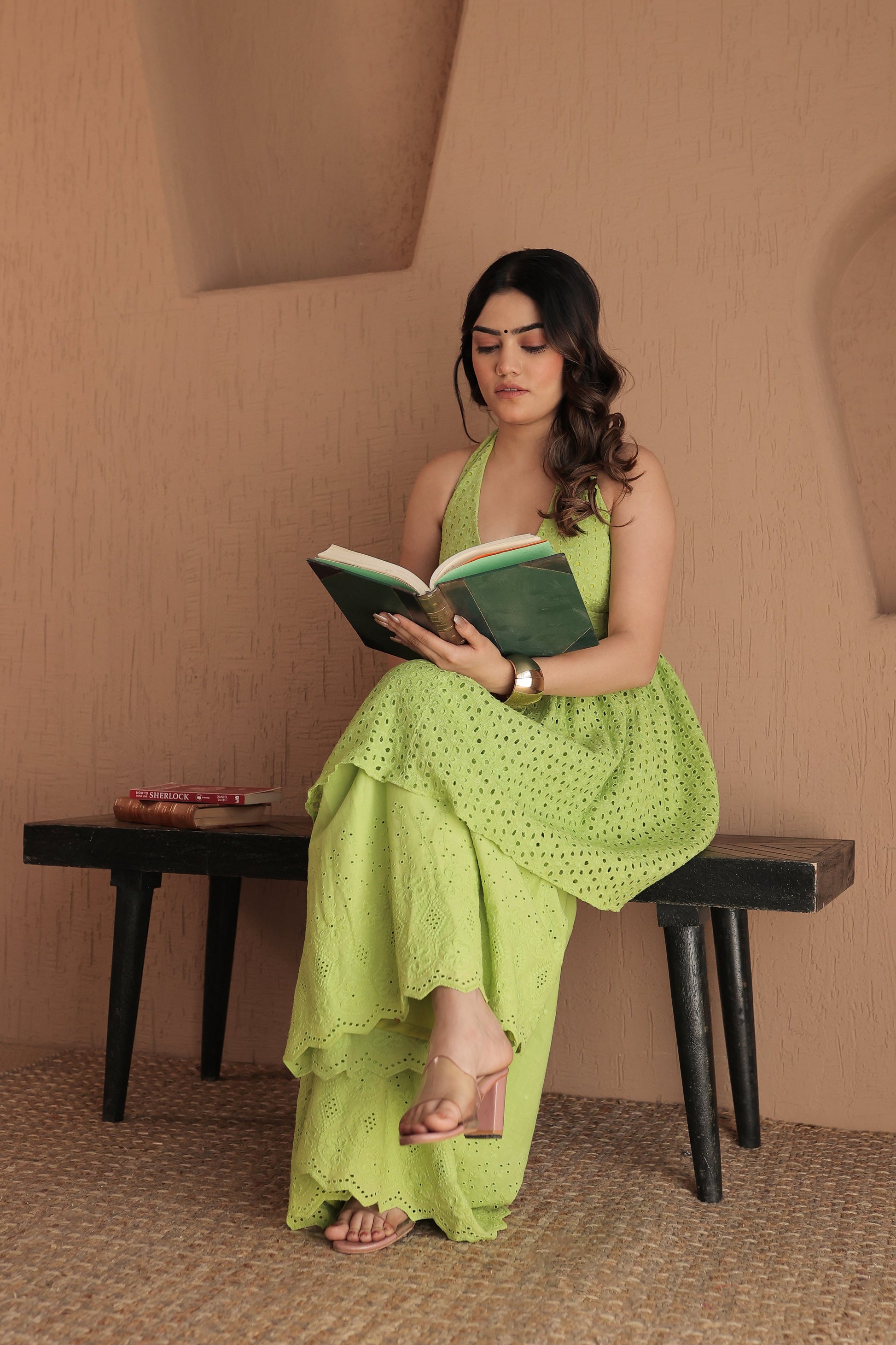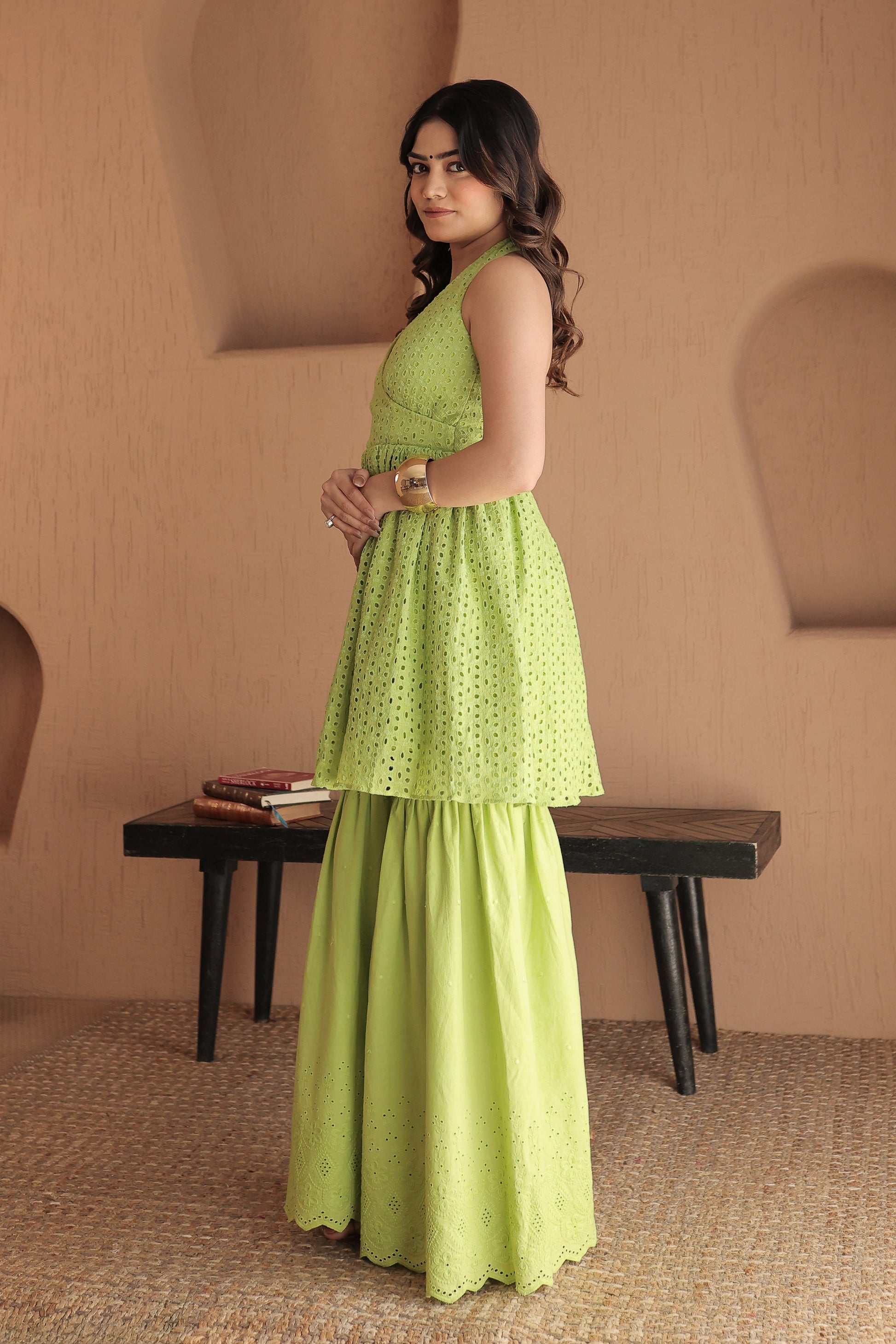 Chic Green Cotton Co-Ord Set – Halter Neck Top & Sharara Pants