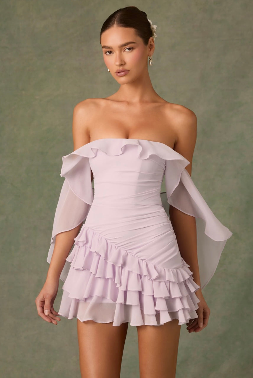 Ethereal and timeless, the Birdie mini dress is crafted from lightweight chiffon and framed with an off-shoulder cape-inspired overlay that creates dynamic movement with every step. It’s cut to a universally flattering A-line silhouette elevated with precise diagonal ruching and asymmetric ruffle detailing at the skirt. The bandeau neckline is secured with internal silicone grip tape for enhanced hold and it comes with detachable, adjustable straps for custom styling.