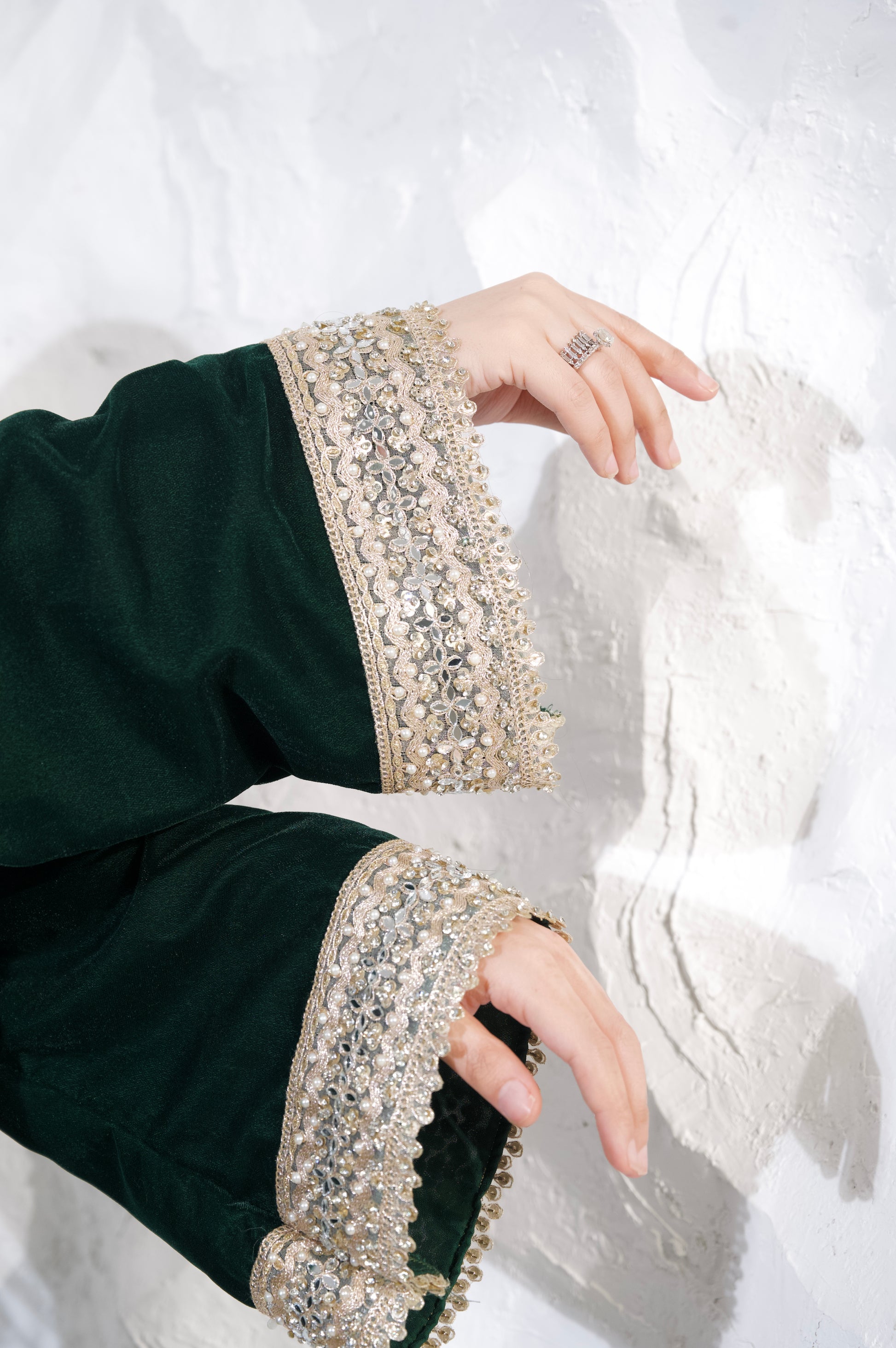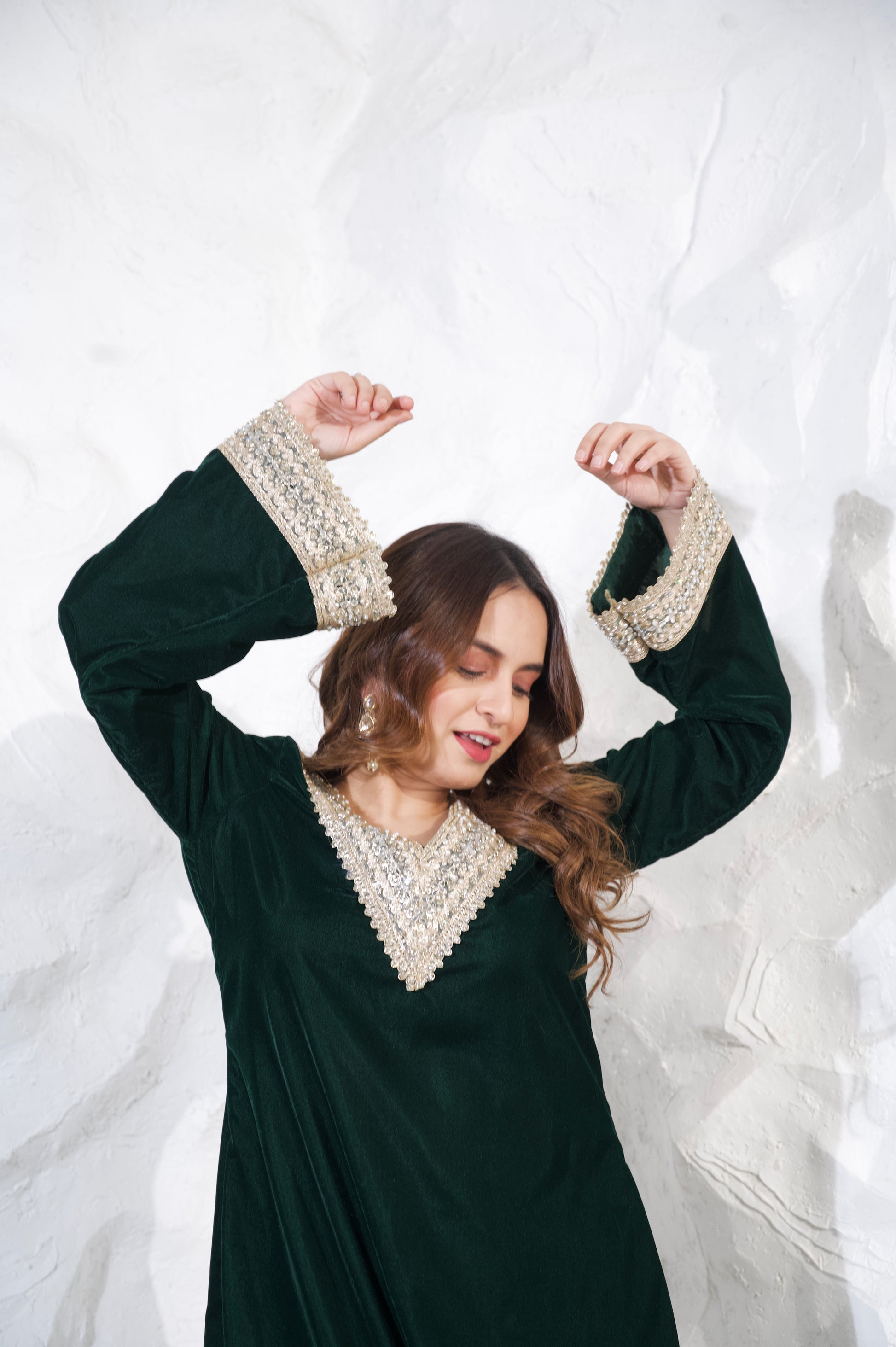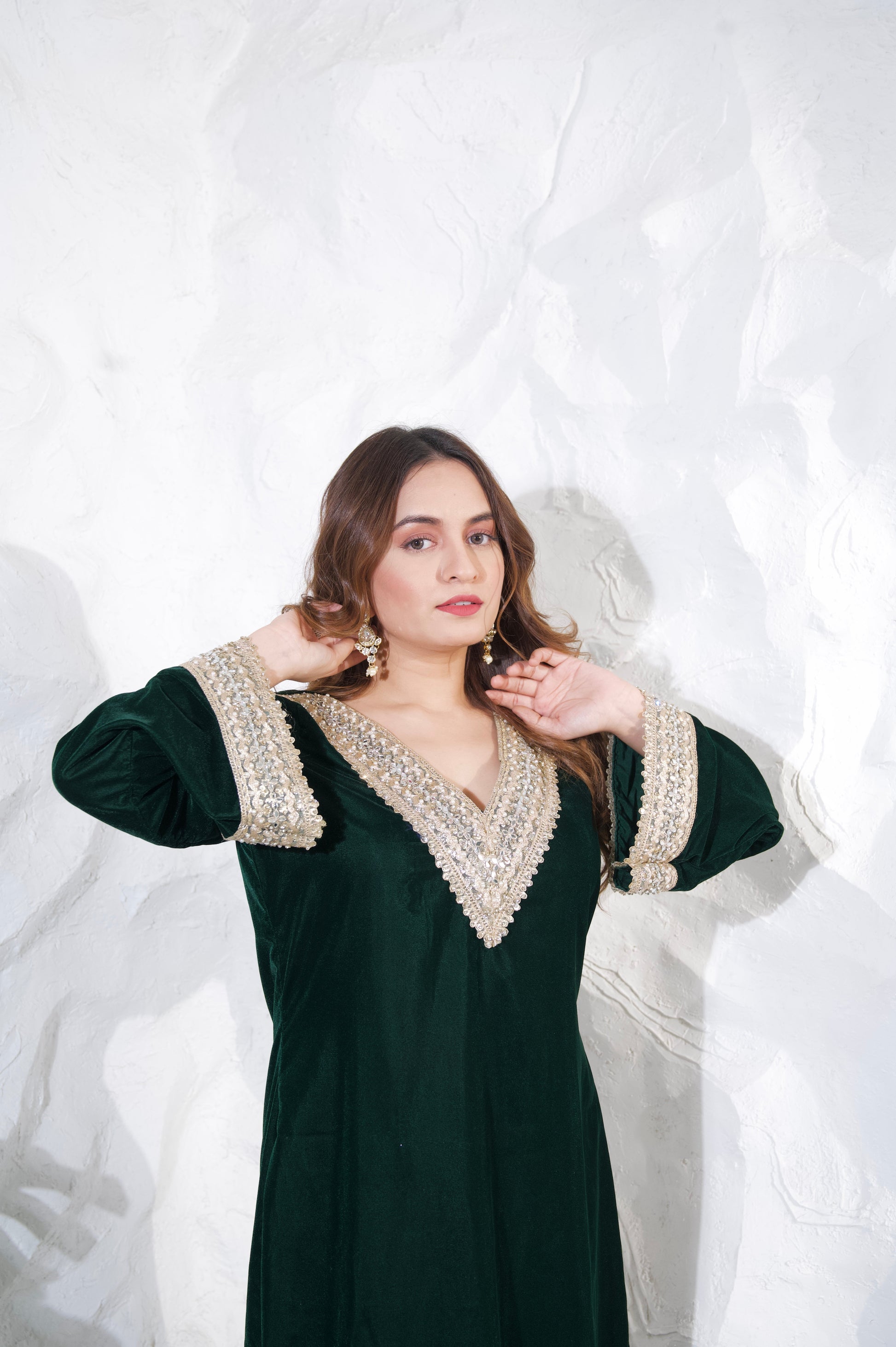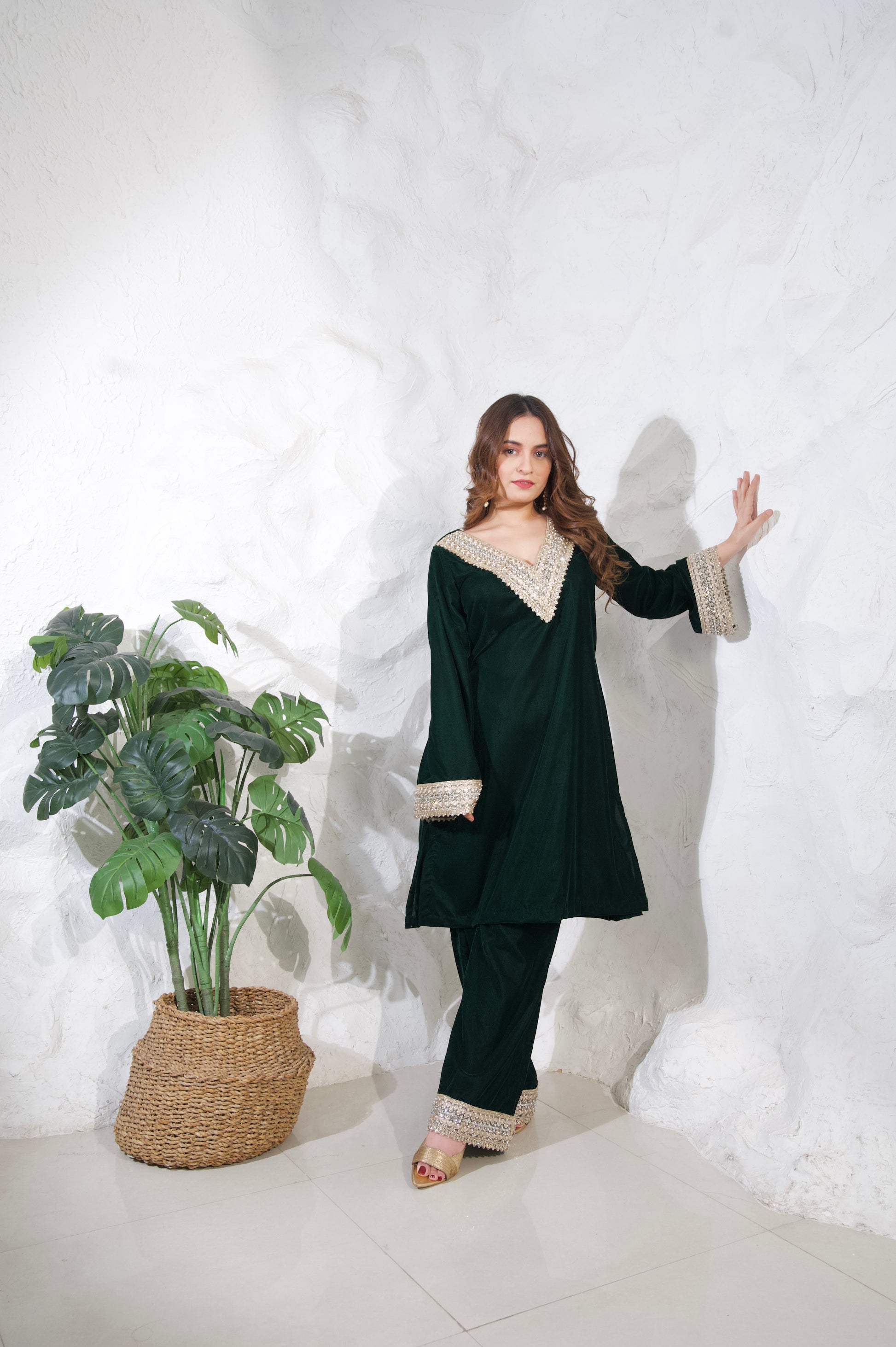 Fabric: Velvet, which gives the outfit a rich, textured feel, perfect for cooler seasons or formal events.
