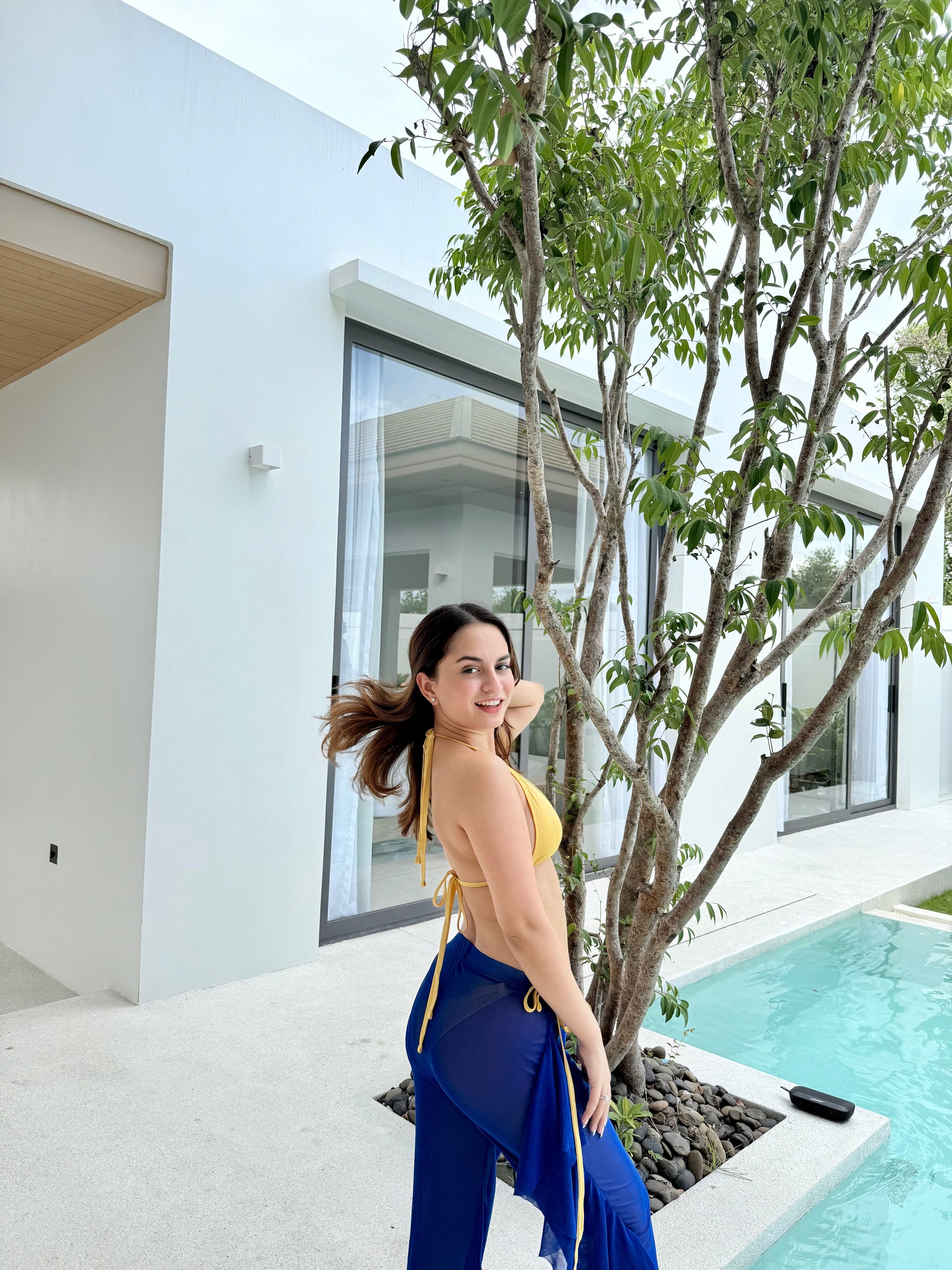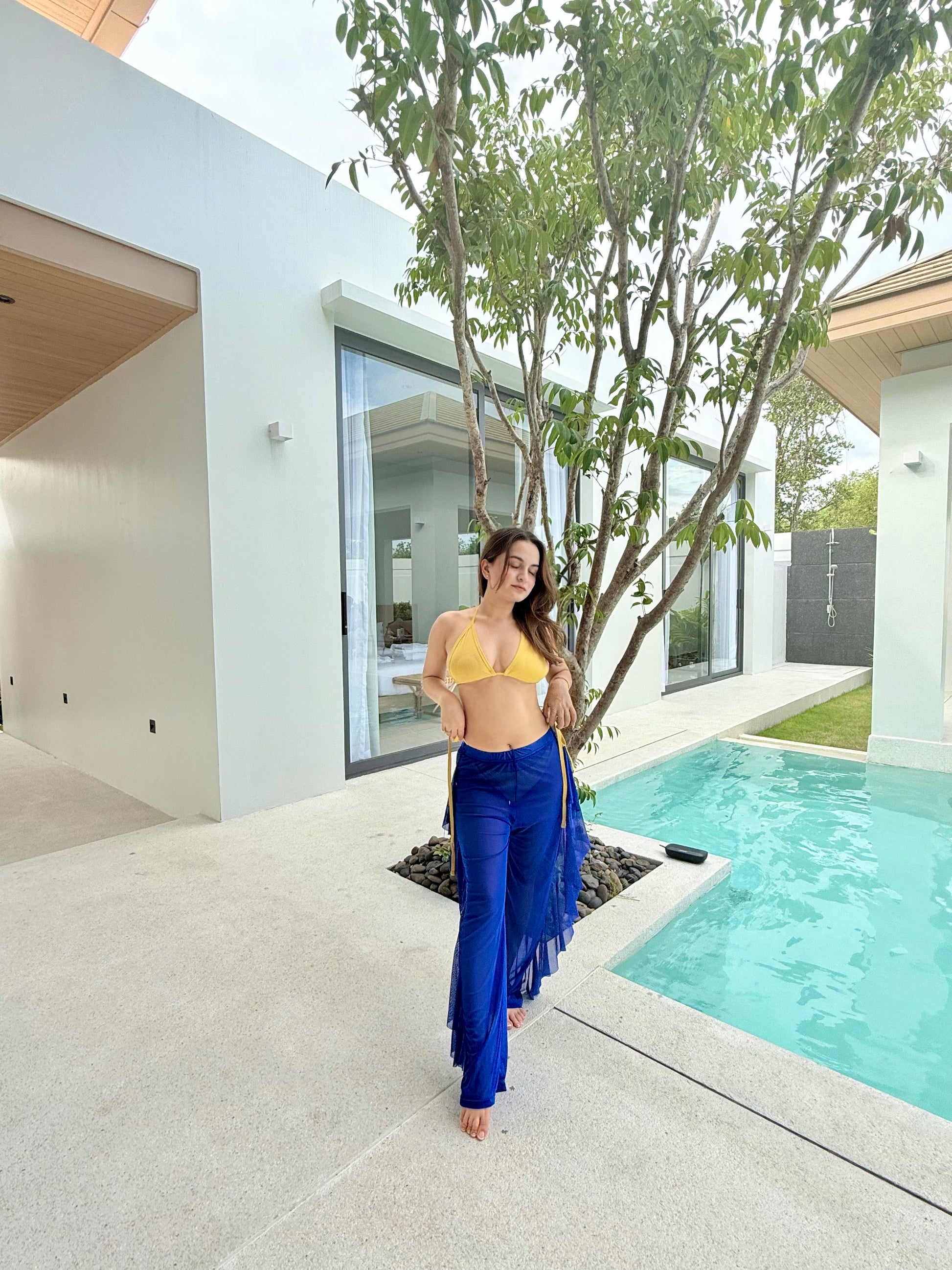 Turn heads and soak up the sun in this vibrant yellow bikini paired with effortlessly stylish navy blue cover-up pants. The bikini features a flattering cut that highlights your curves and brings a bright, playful energy to your beach or poolside look. The lightweight, flowy navy pants offer just the right amount of coverage and contrast, making this set perfect for transitioning from sunbathing to seaside strolls.