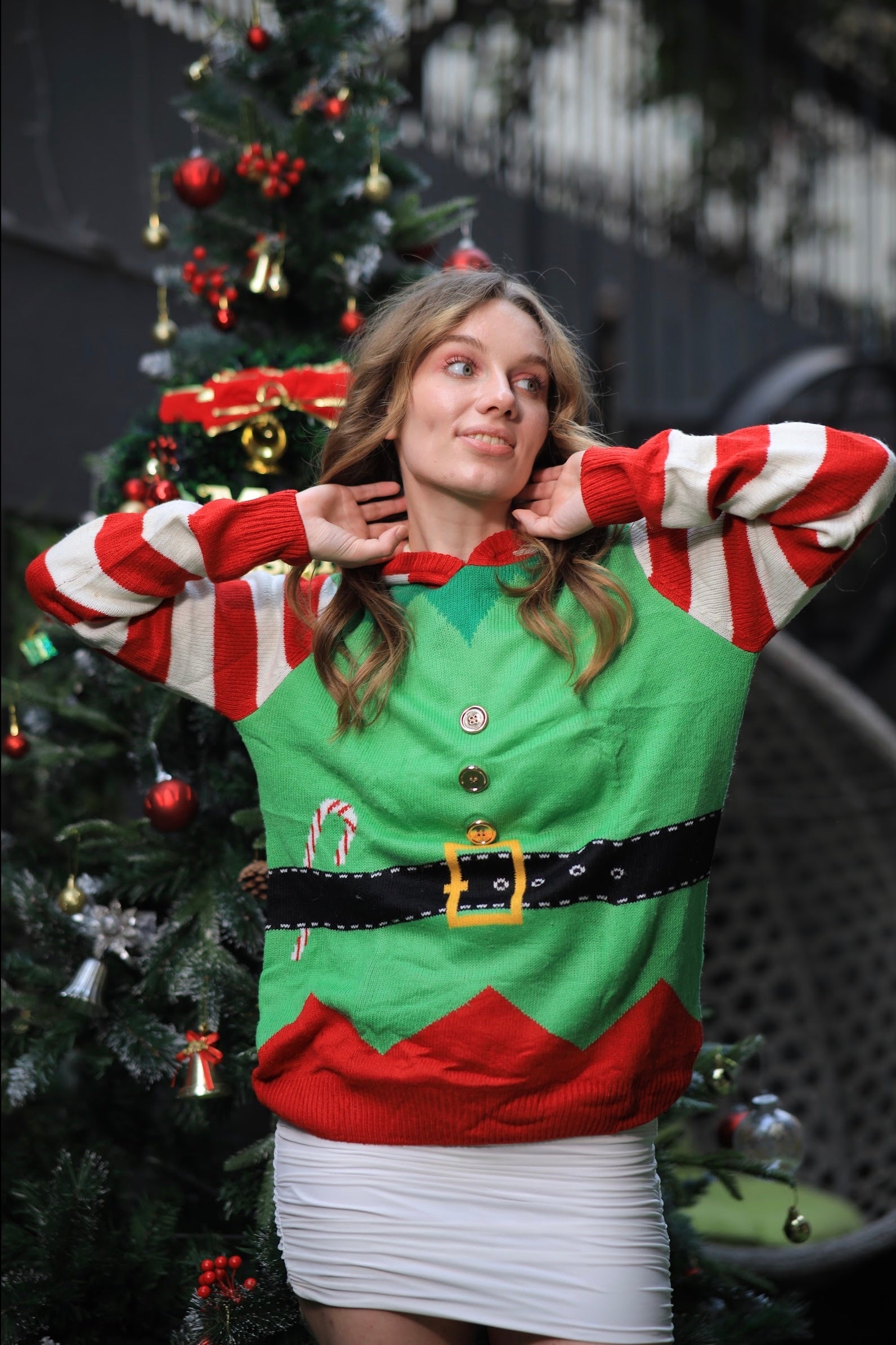 This festive ugly Christmas sweater features a bold, eye-catching design with holiday-themed patterns. Perfect for spreading cheer at ugly sweater parties, it combines comfort, warmth, and a touch of seasonal humor.
