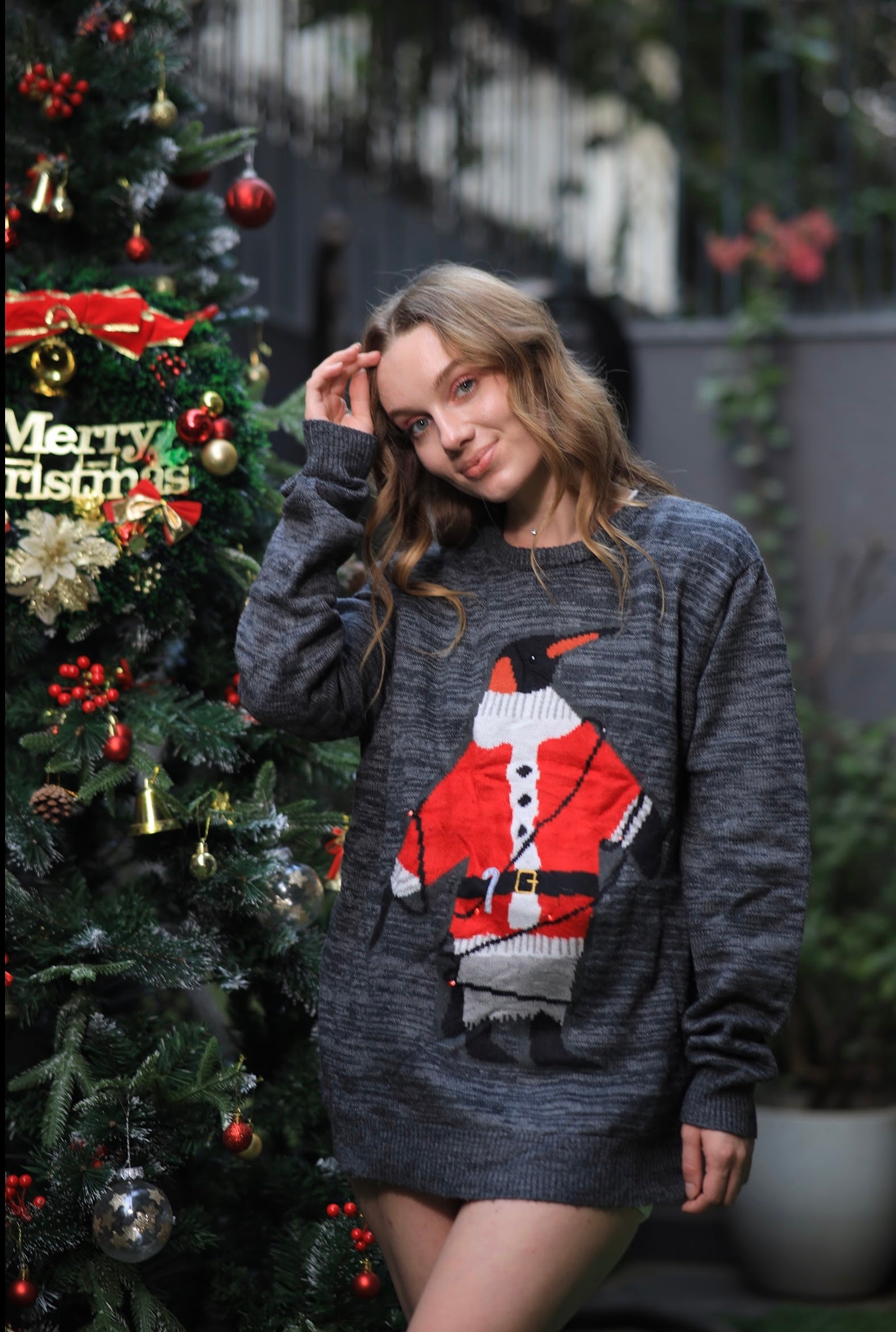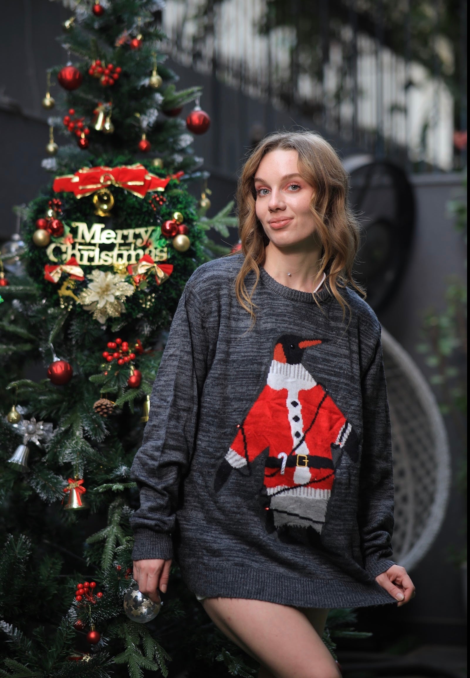 This fun ugly Christmas sweater features a cheerful santa penguin with a scarf and top hat, perfect for spreading holiday cheer. Its bold, festive design makes it ideal for ugly sweater parties or cozy Christmas gatherings.