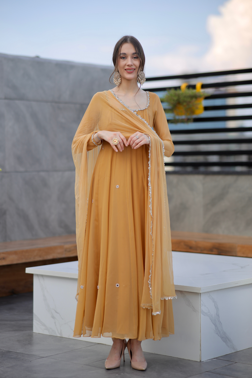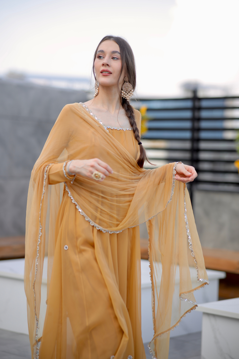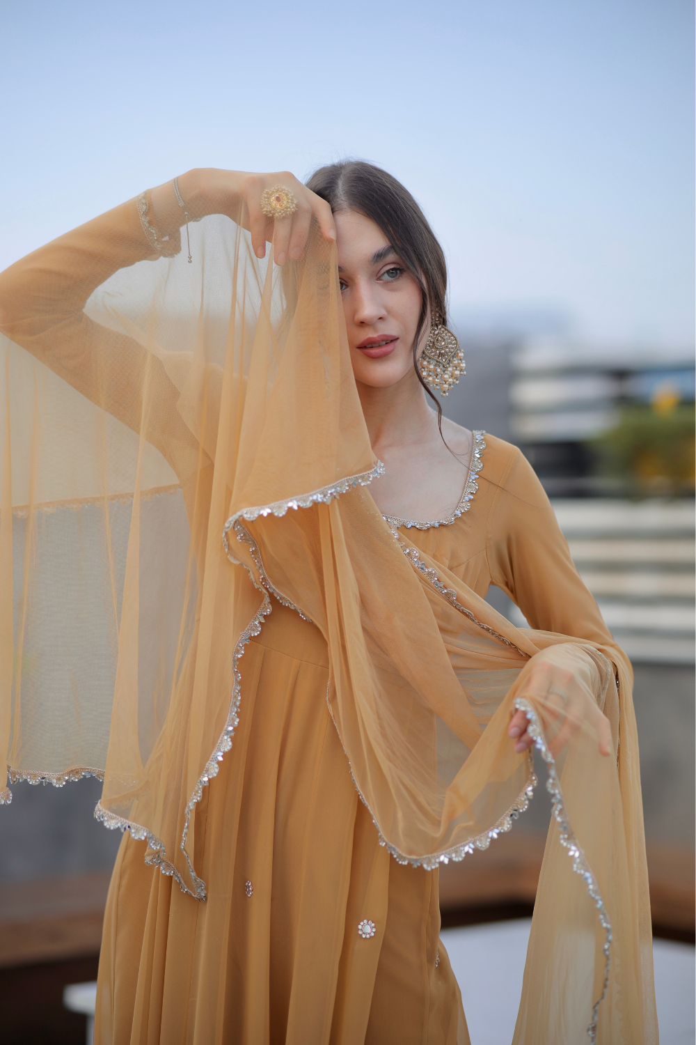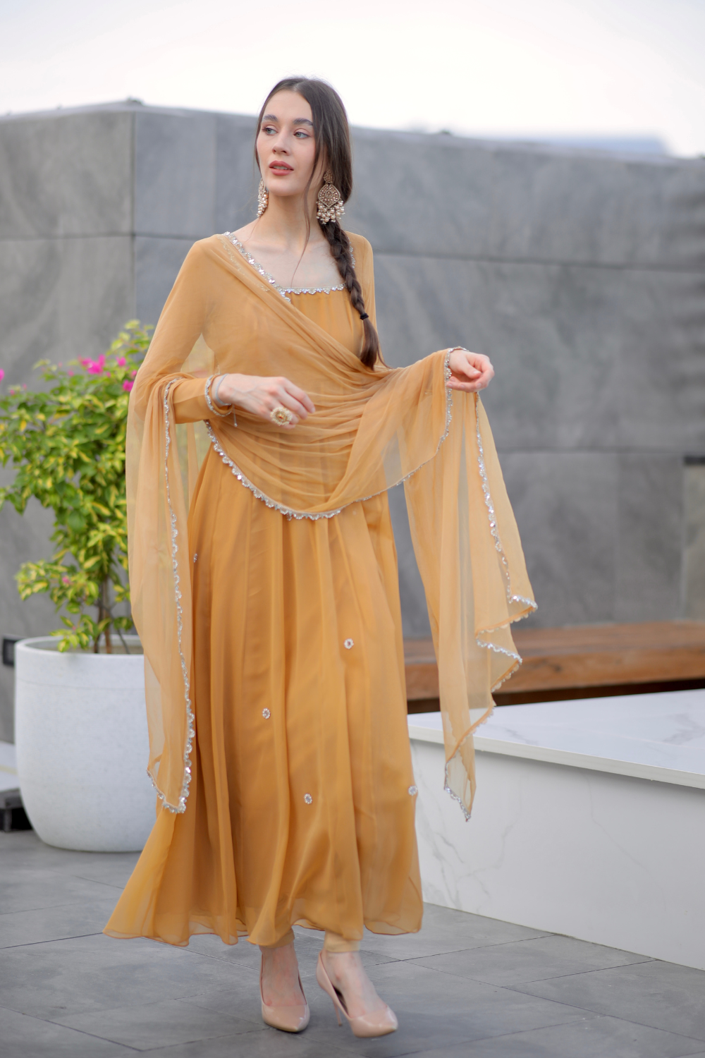 The Brown Anarkali is a versatile piece, beautifully balancing heaviness and lightness for any occasion. Crafted from rich, luxurious fabric, it features a deep, warm brown shade that exudes elegance. The anarkali showcases intricate detailing—heavier embellishments are concentrated around the bodice and hem, while the skirt flows gracefully with lighter, subtle accents. This combination ensures the outfit is both striking and comfortable, making it an ideal choice for a wide range of functions, from formal events to festive gatherings.