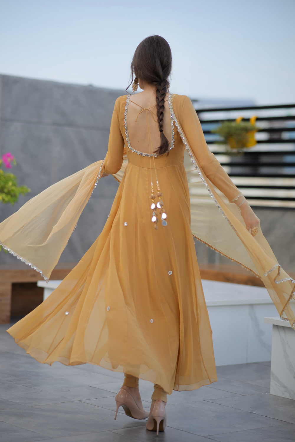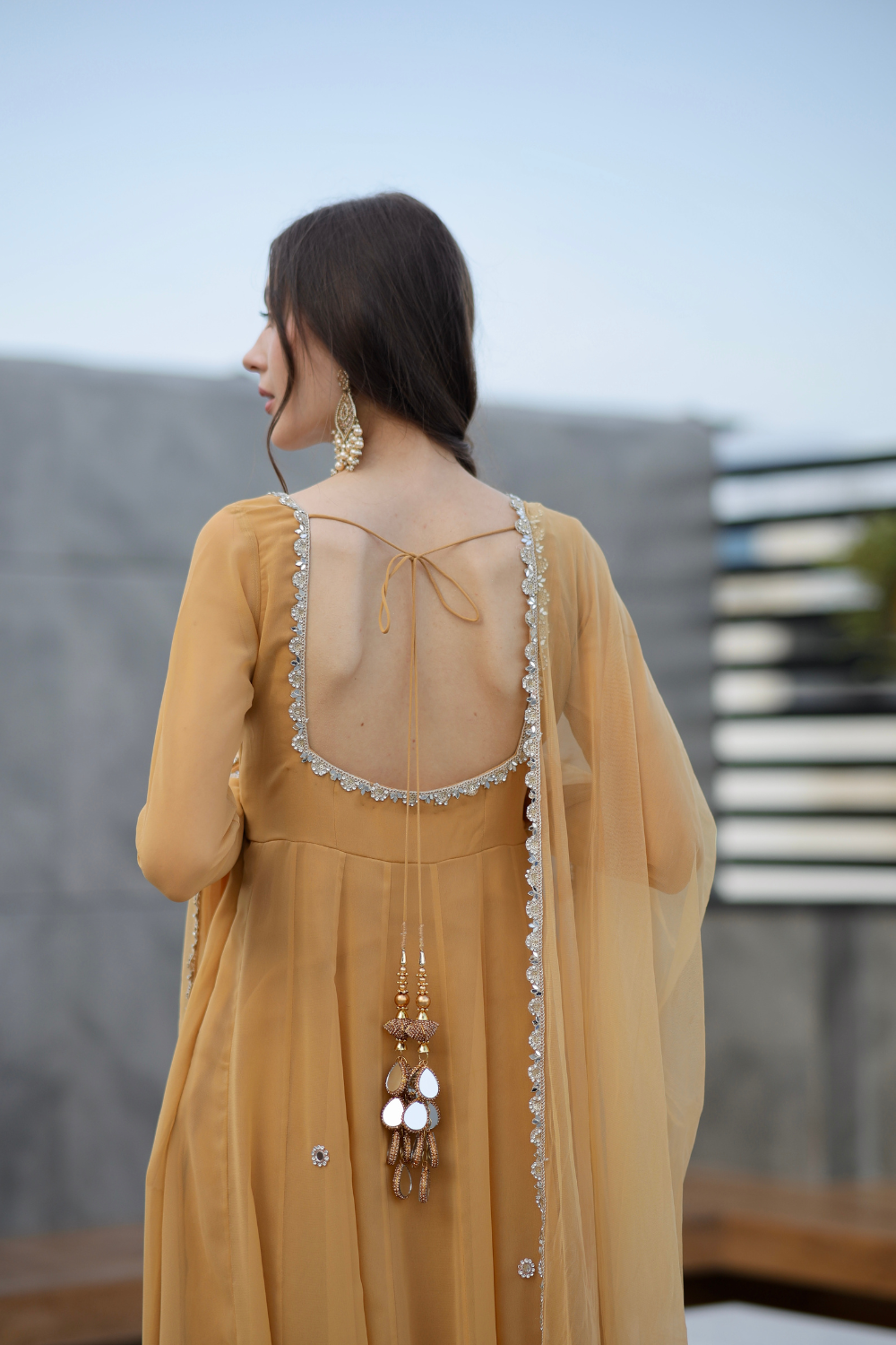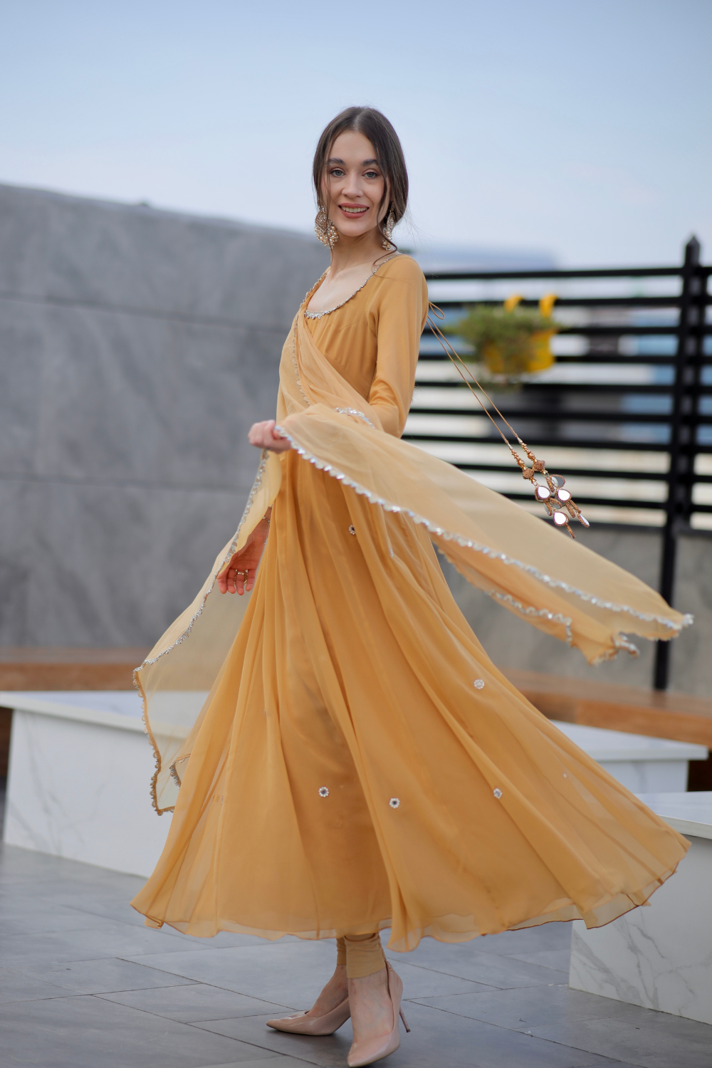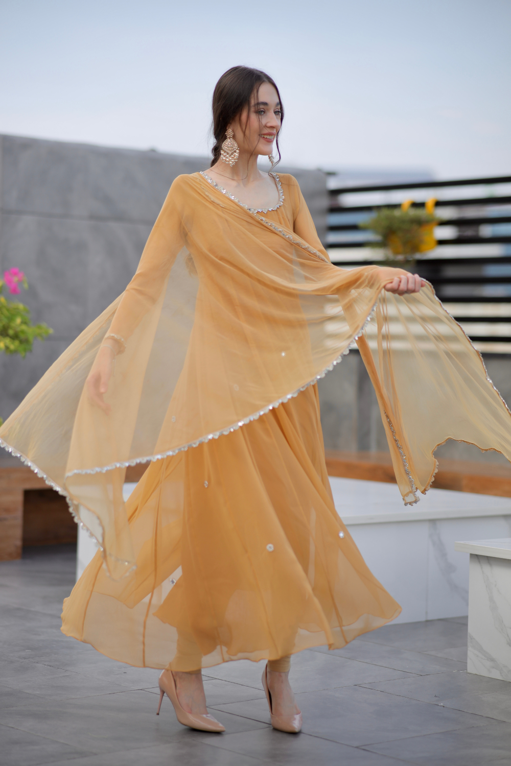 The Brown Anarkali is a versatile piece, beautifully balancing heaviness and lightness for any occasion. Crafted from rich, luxurious fabric, it features a deep, warm brown shade that exudes elegance. The anarkali showcases intricate detailing—heavier embellishments are concentrated around the bodice and hem, while the skirt flows gracefully with lighter, subtle accents. This combination ensures the outfit is both striking and comfortable, making it an ideal choice for a wide range of functions, from formal events to festive gatherings.