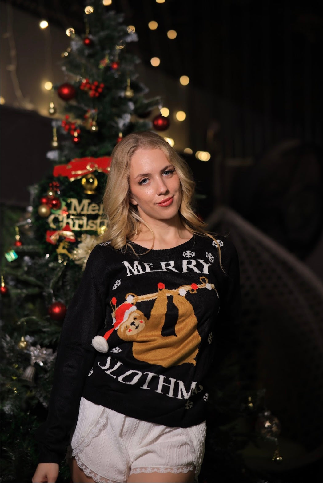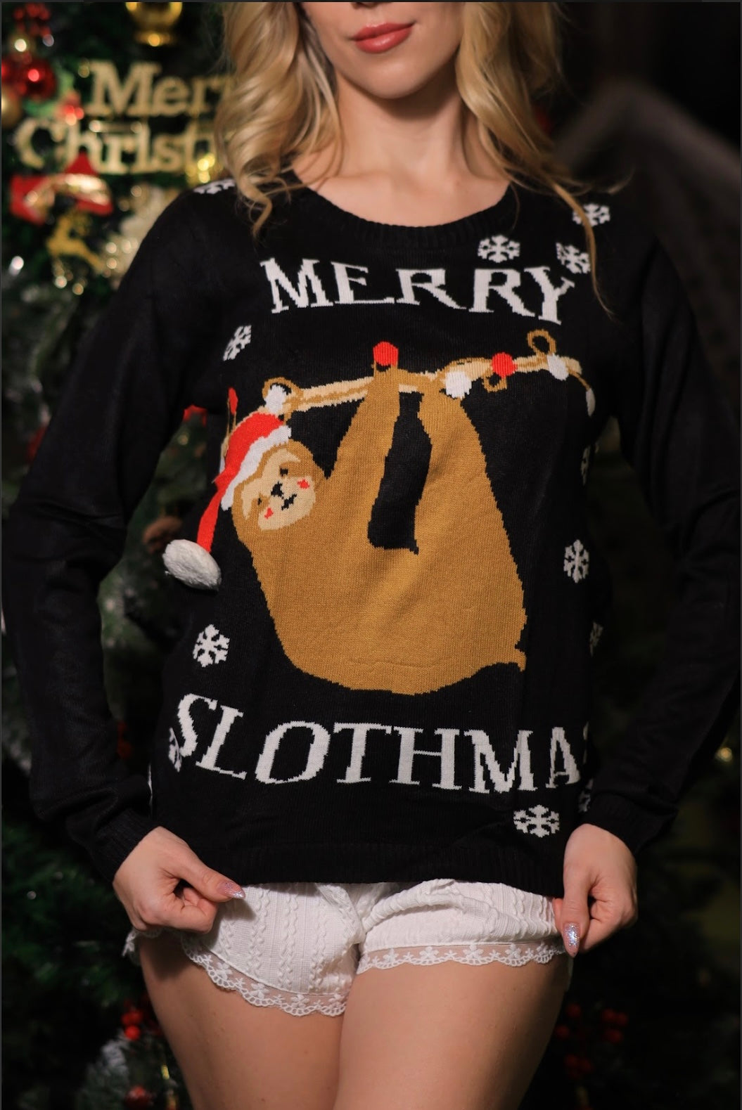 This fun ugly Christmas sweater features a cheerful sloth with a scarf and top hat, perfect for spreading holiday cheer. Its bold, festive design makes it ideal for ugly sweater parties or cozy Christmas gatherings.