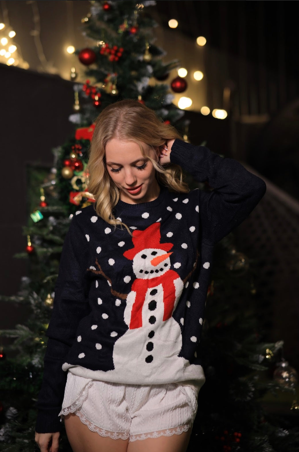 This fun ugly Christmas sweater features a cheerful snowman with a scarf and top hat, perfect for spreading holiday cheer. Its bold, festive design makes it ideal for ugly sweater parties or cozy Christmas gatherings.