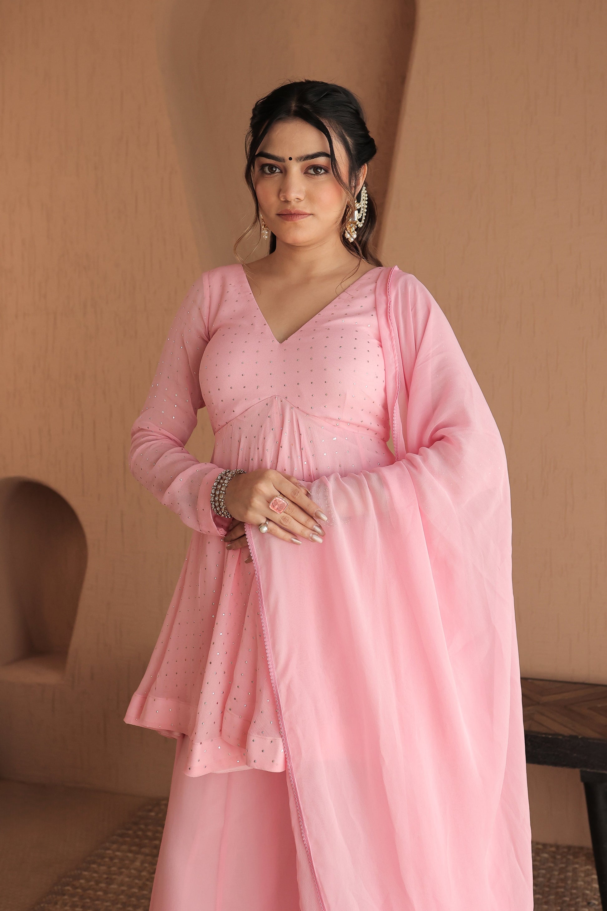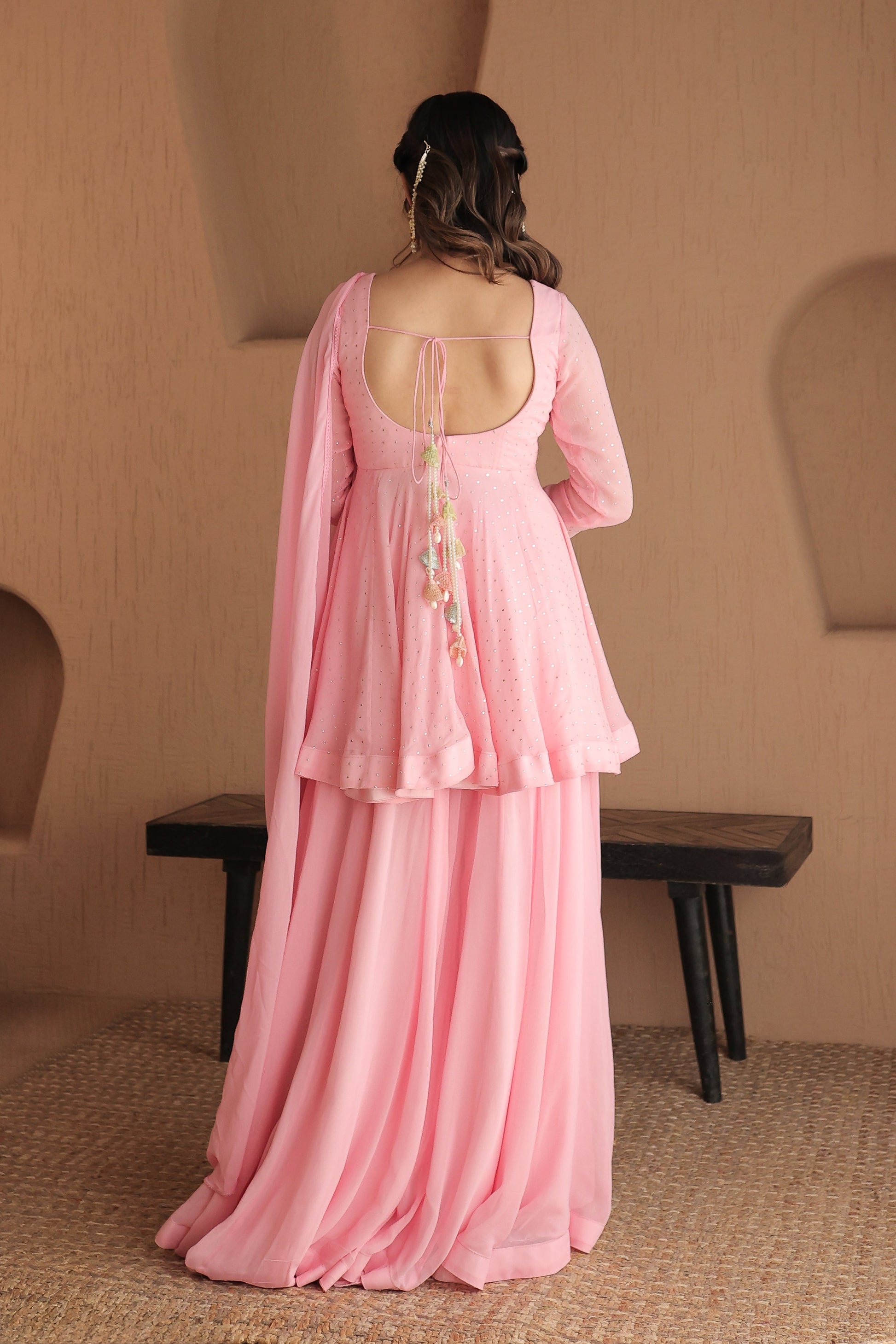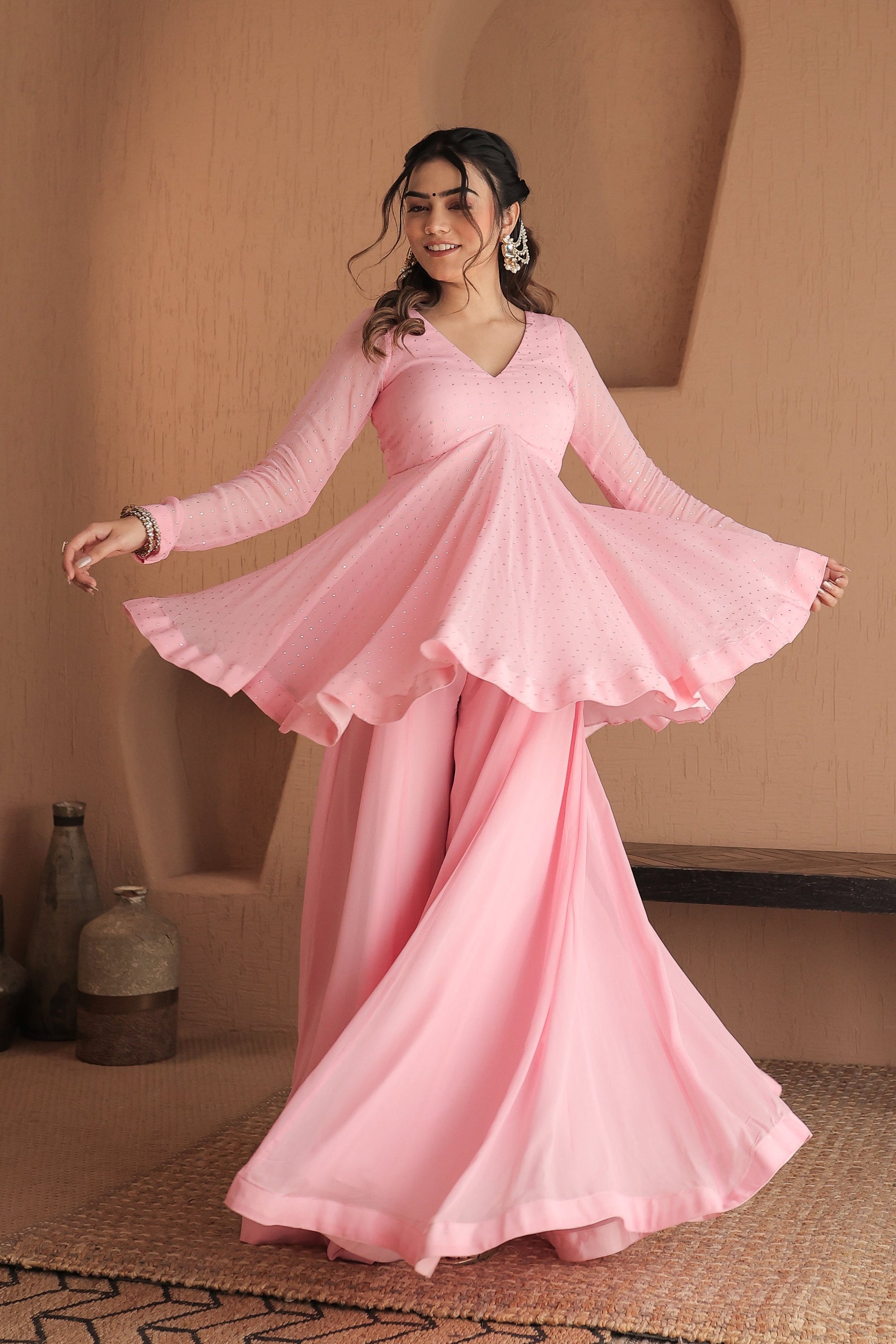Step into effortless elegance with this graceful peplum suit, featuring a flowy peplum kurti paired with wide-leg sharara pants for a breezy, stylish look. Designed for comfort and movement, the kurti’s structured yet flowy silhouette enhances your waistline, giving a flattering, feminine touch, while the sharara adds a regal charm.