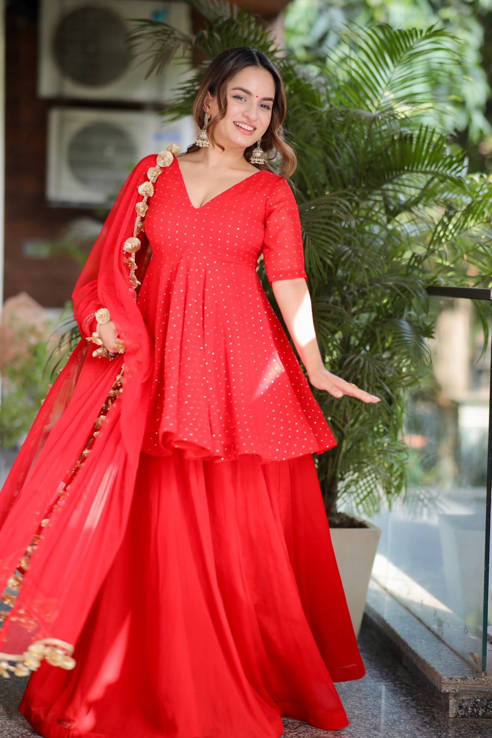 Step into effortless elegance with this graceful peplum suit, featuring a flowy peplum kurti paired with wide-leg sharara pants for a breezy, stylish look. Designed for comfort and movement, the kurti’s structured yet flowy silhouette enhances your waistline, giving a flattering, feminine touch, while the sharara adds a regal charm.