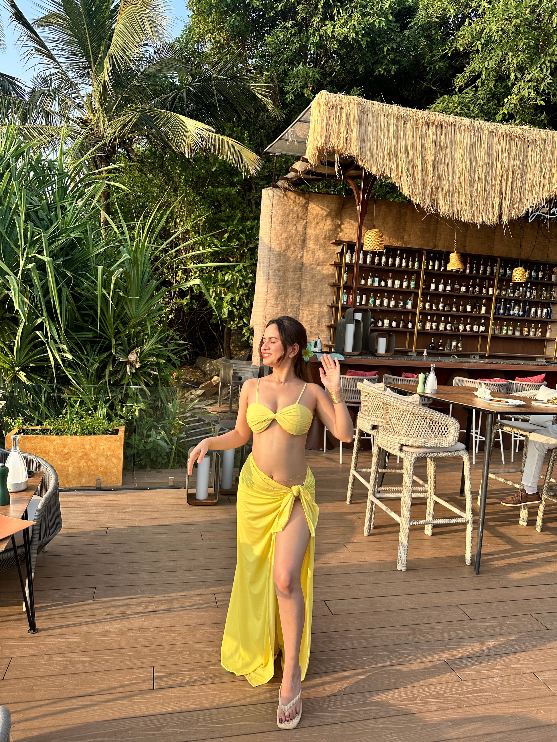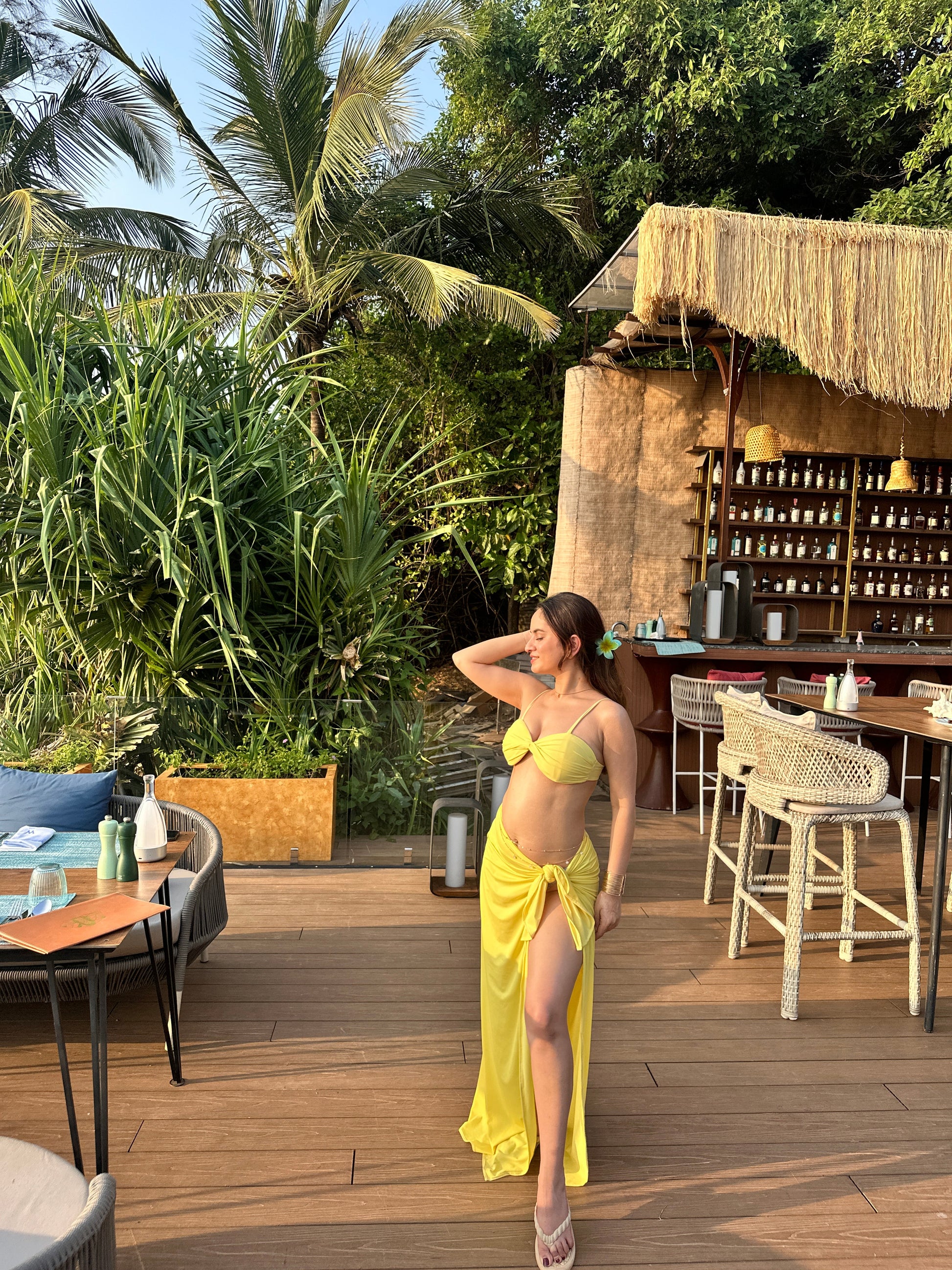 Radiate confidence and style with our Yellow Bikini with Wrap Skirt Set—the perfect combination of chic and comfort. This vibrant yellow bikini set features a flattering, structured top with adjustable straps for a customizable fit, paired with high-rise bottoms that offer both coverage and confidence. The highlight? A breezy, matching wrap skirt designed to effortlessly drape over your hips, adding a touch of elegance to your beach or poolside look.