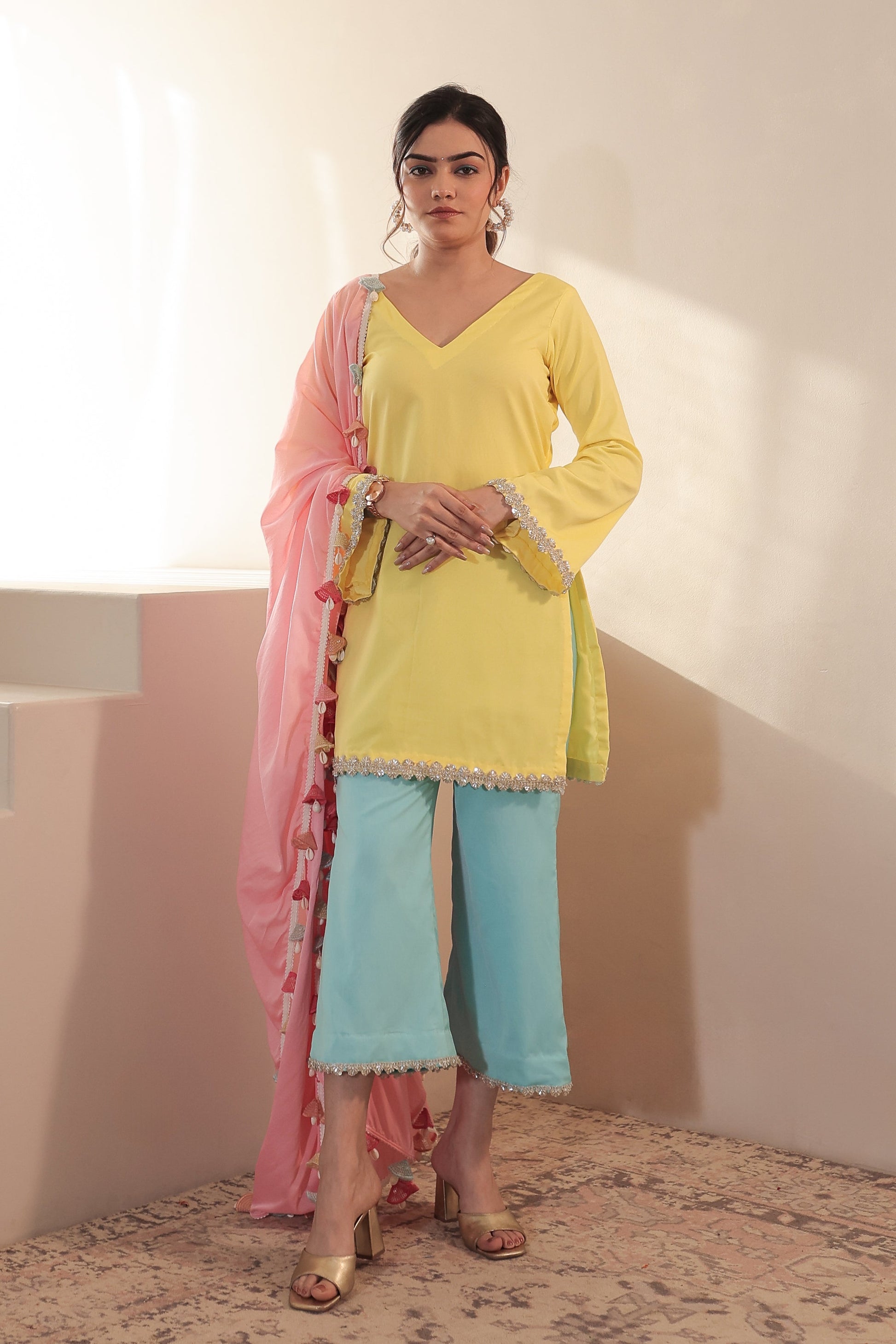 - Colour : Kurti - Yellow , Pants - Blue , Dupatta - Pink