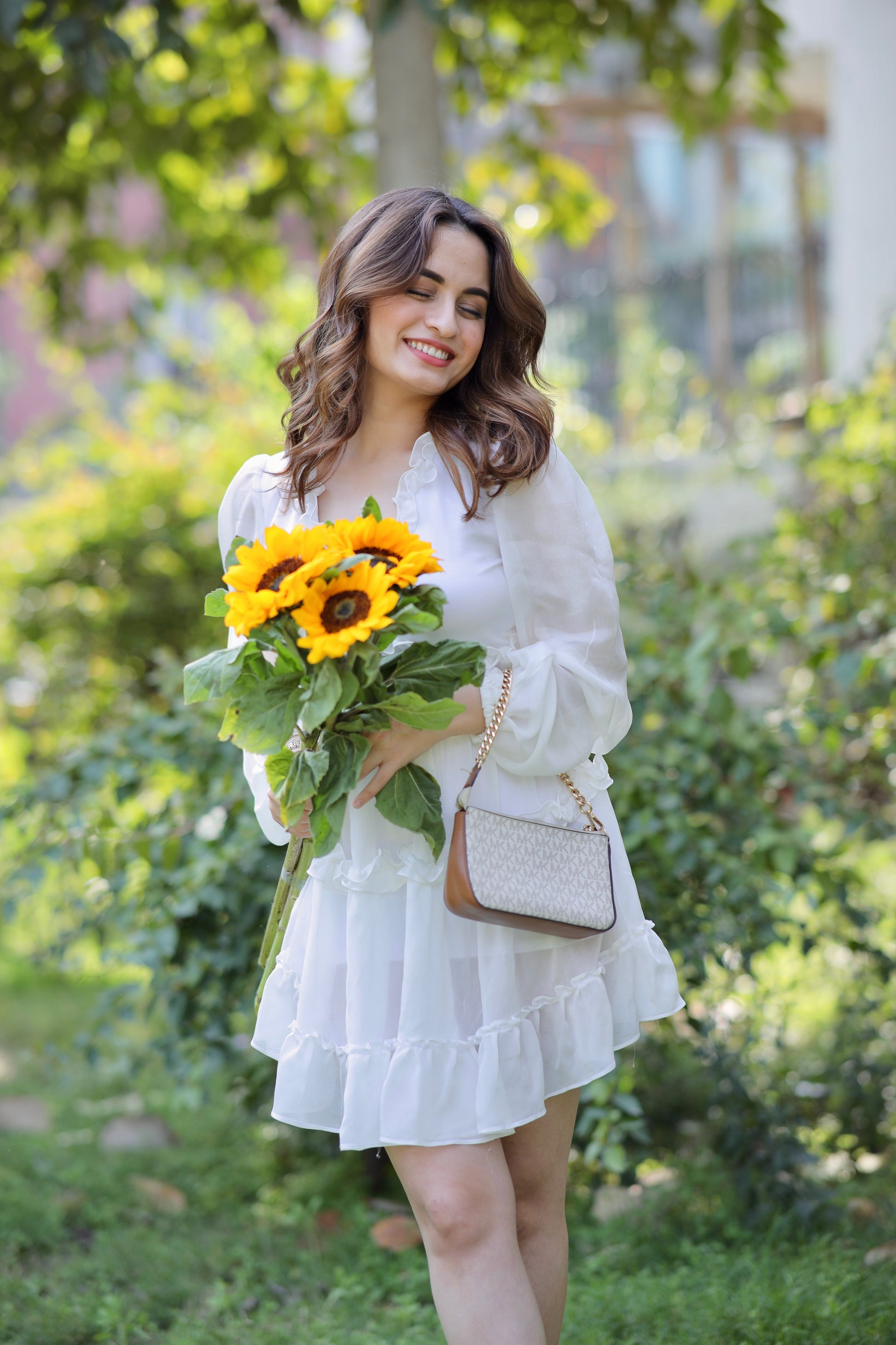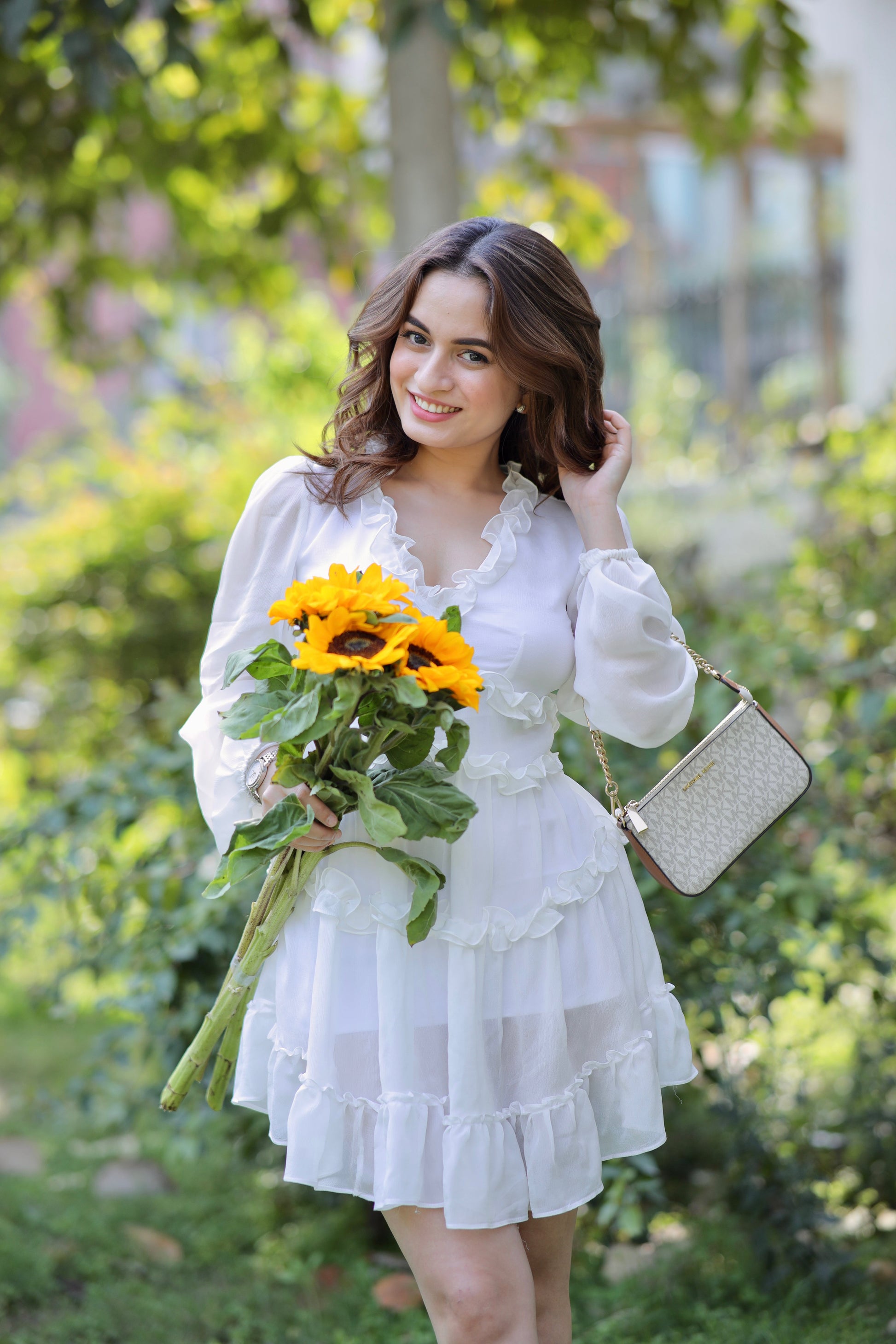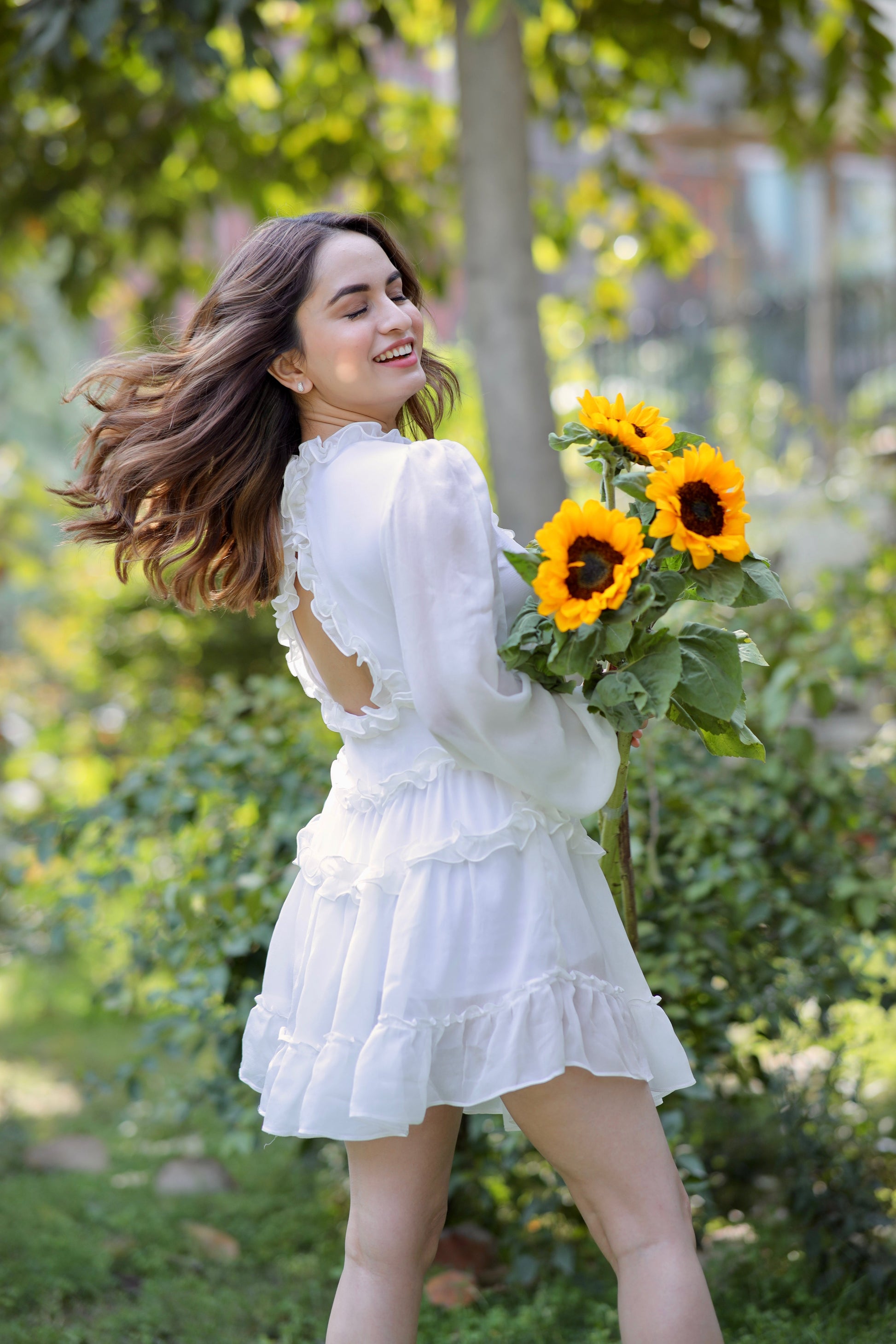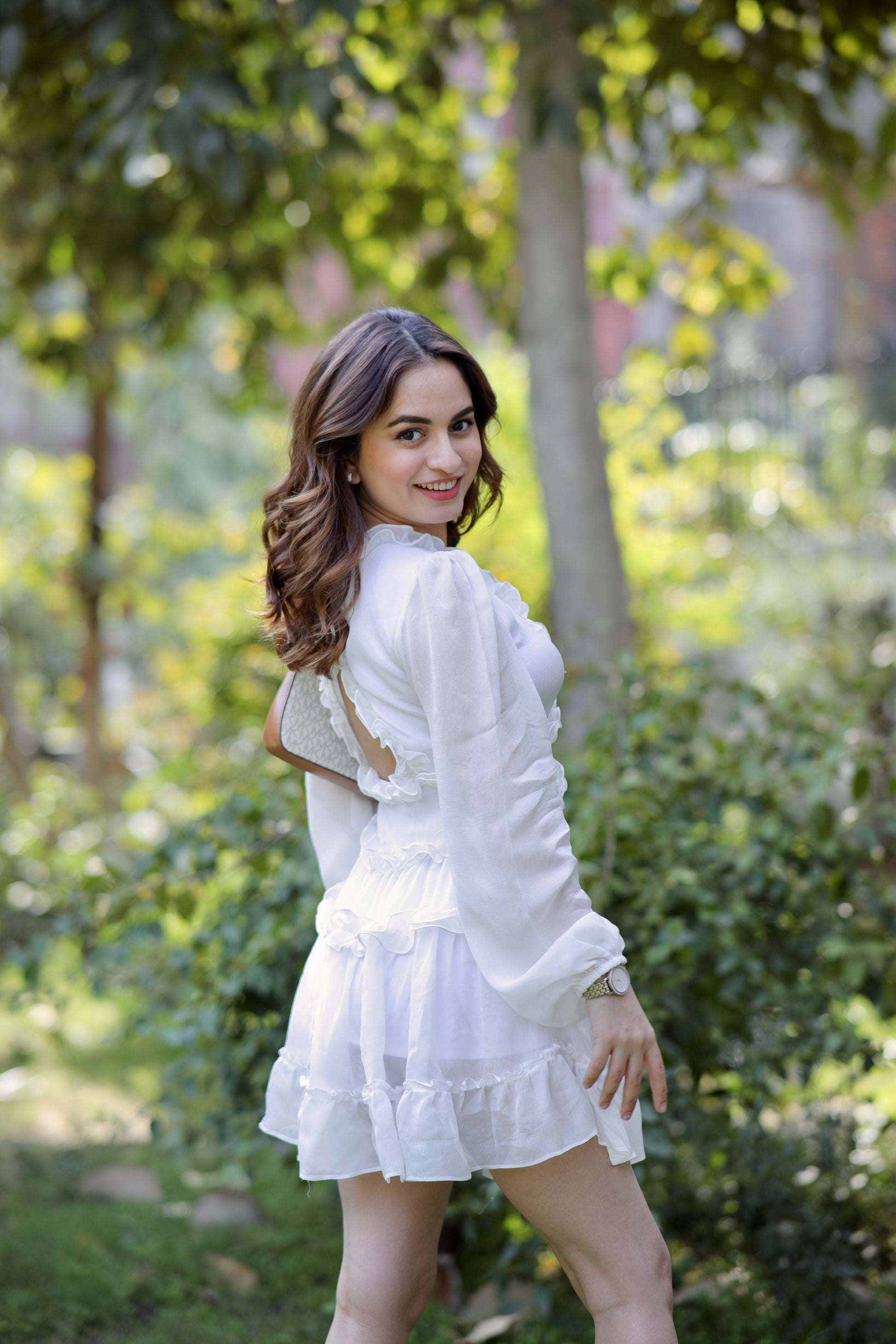 A white dress full of twirls, frills, and feminine energy captures the essence of delicate elegance and playful charm. The fabric, soft and light, seems to dance with every movement, creating a vision of grace and beauty in motion. Each twirl reveals layers of delicate frills, accentuating the fluidity of the dress, as if the air itself is caught up in its movement. The ruffles cascade like soft waves, drawing attention to the contours of the body while maintaining a youthful, carefree spirit.