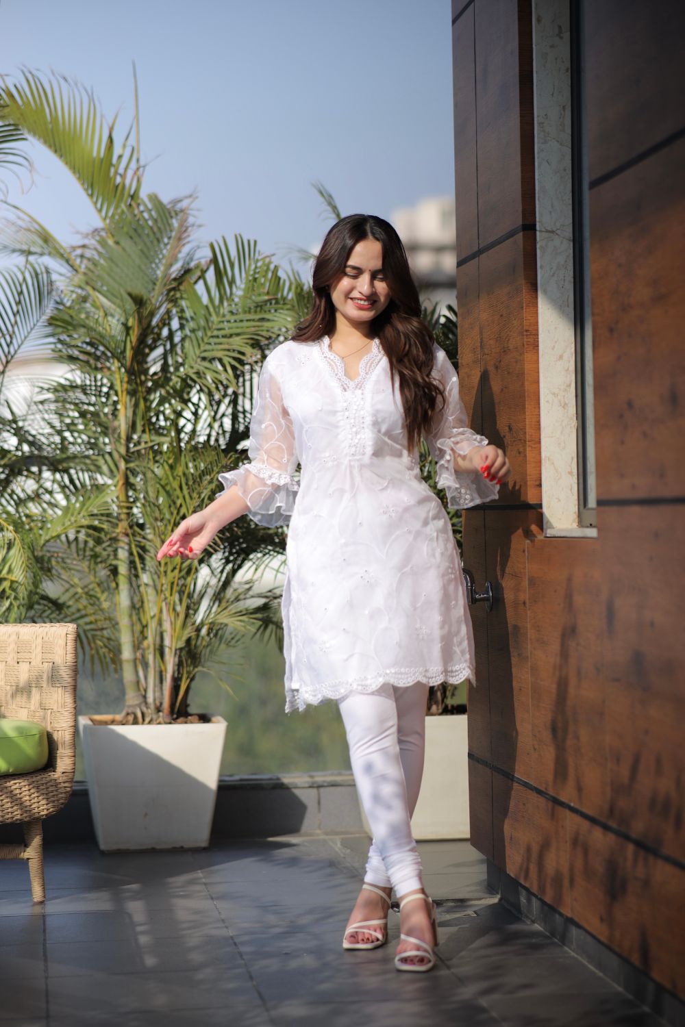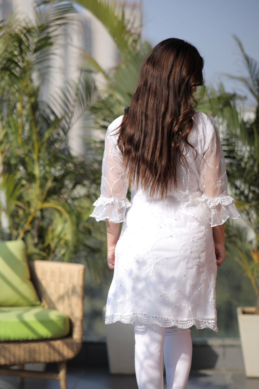 Get ready to turn heads with this White Cotton Organza Kurti! Made of 100% cotton, this kurti features intricate mirror detailing and beautiful long flared sleeves. Its lightweight and breathable fabric will keep you feeling comfortable and stylish all day long. Stand out from the crowd with this unique and playful piece.