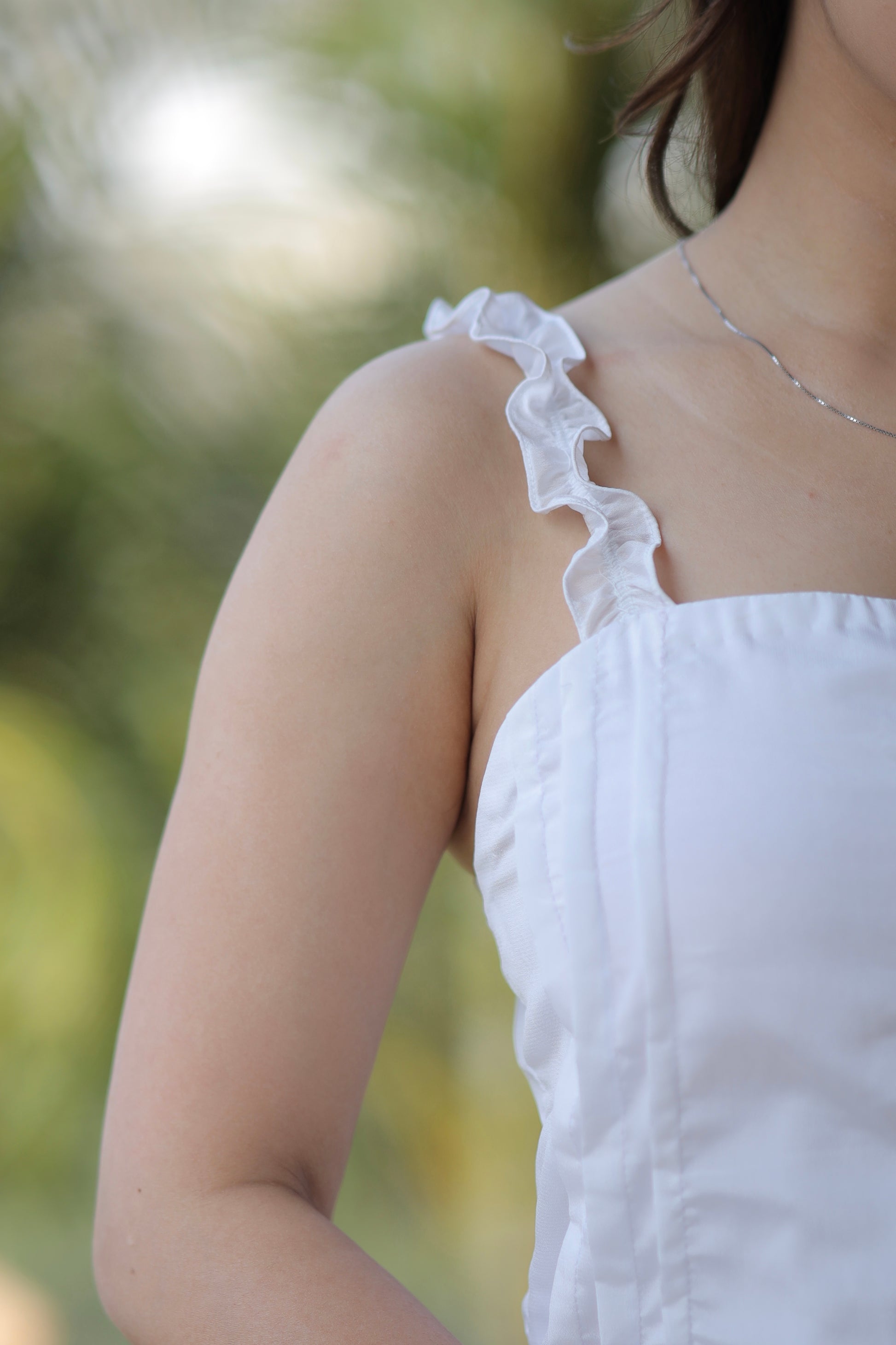 This stylish dress has a square neckline and no sleeves. It even comes with a matching lining and adorable buttons!