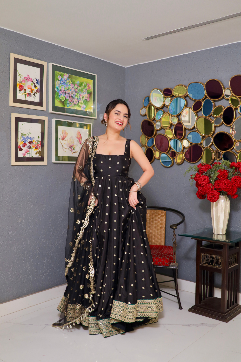 Make a bold yet timeless statement with this stunning black Anarkali in rich silk fabric, exuding royal elegance with every detail. Designed in a classic silhouette, the Anarkali features a graceful flare that flows effortlessly, enhancing the wearer’s poise and presence.